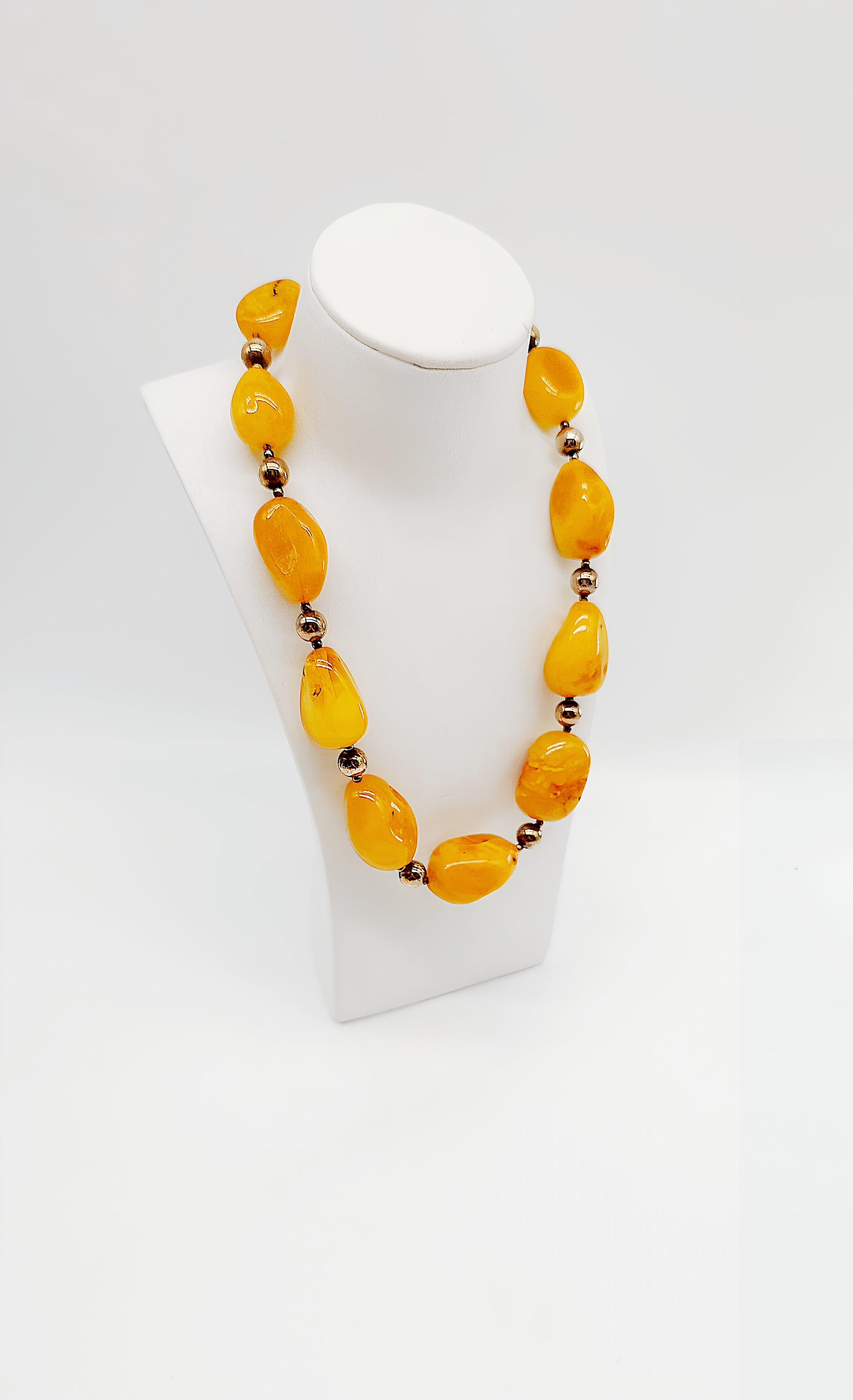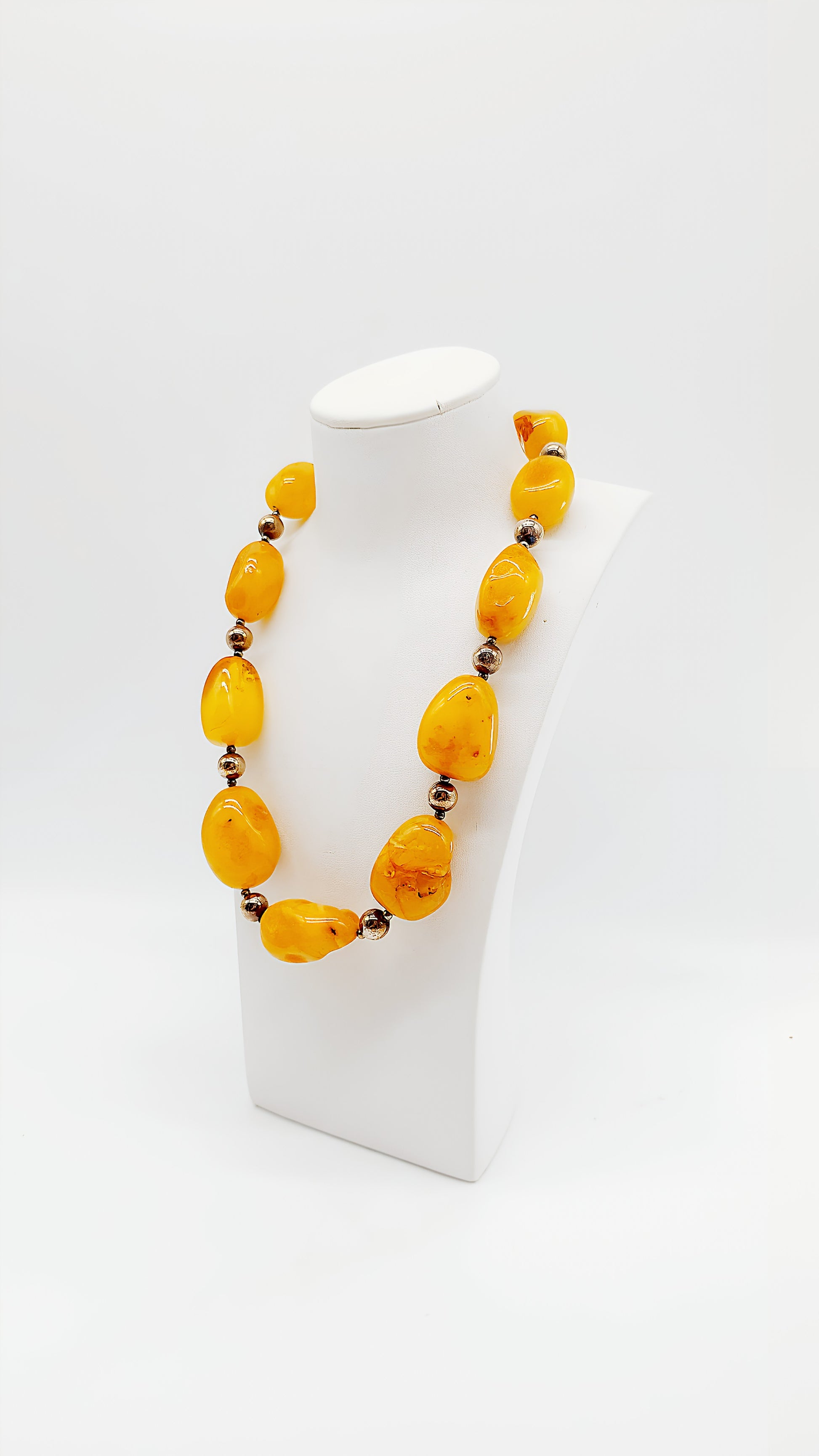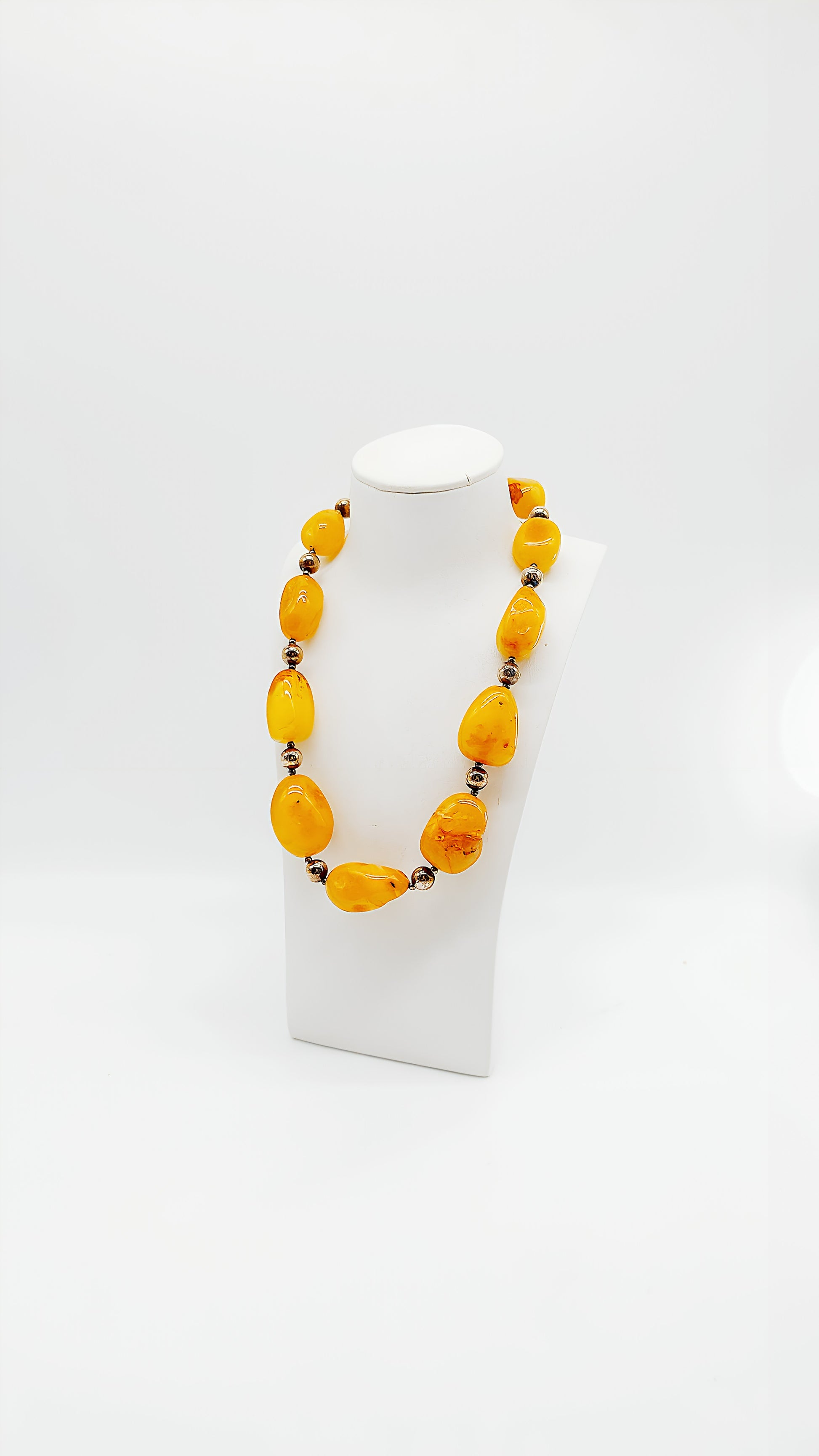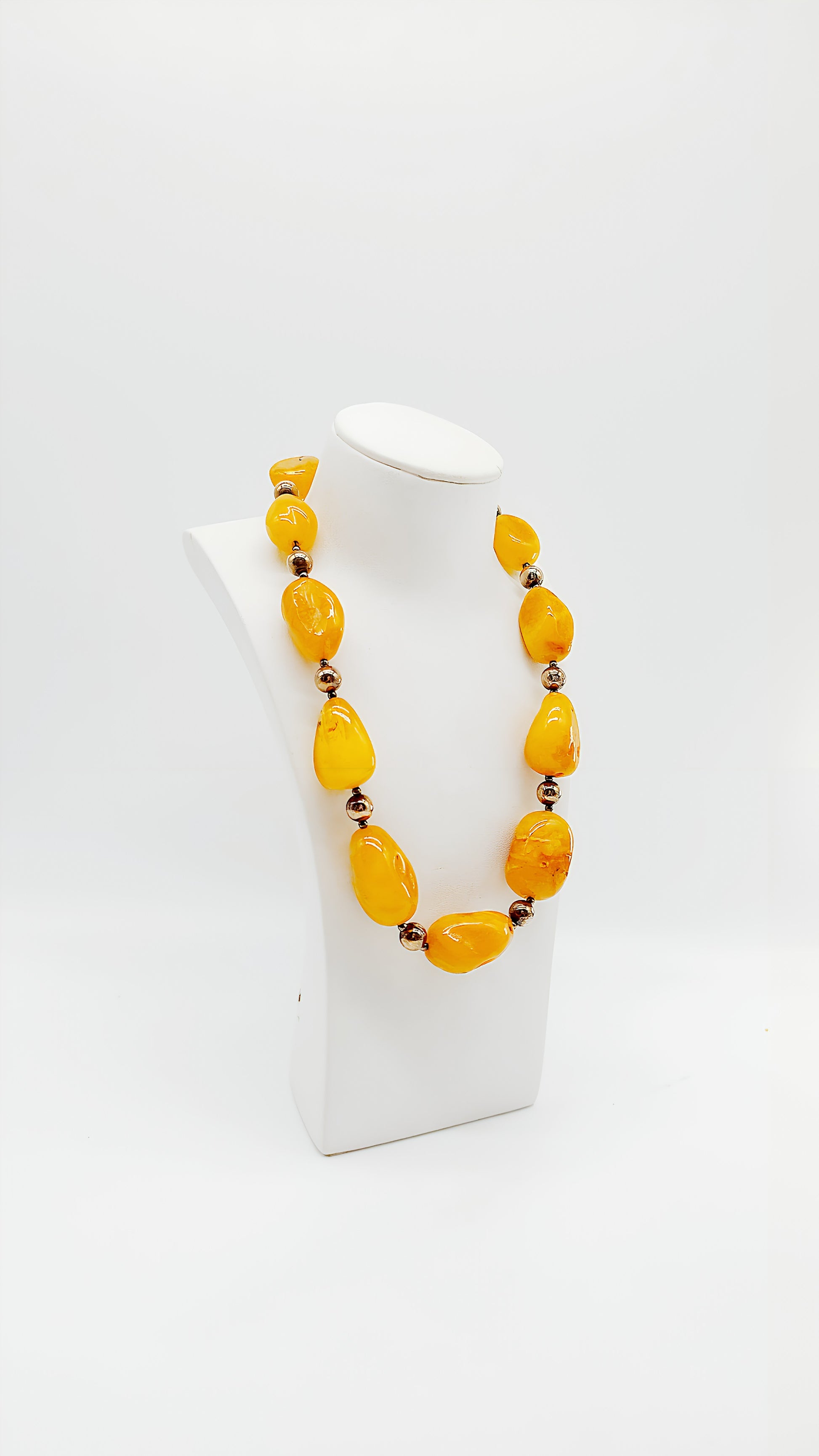 This unique, vibrant yellow amber necklace combines natural beauty with modern accents. The smooth, warm amber elements are complemented by dark, lustrous spacers, creating a sophisticated yet elegant look. The perfect choice for those who value high-quality materials and exceptional design.