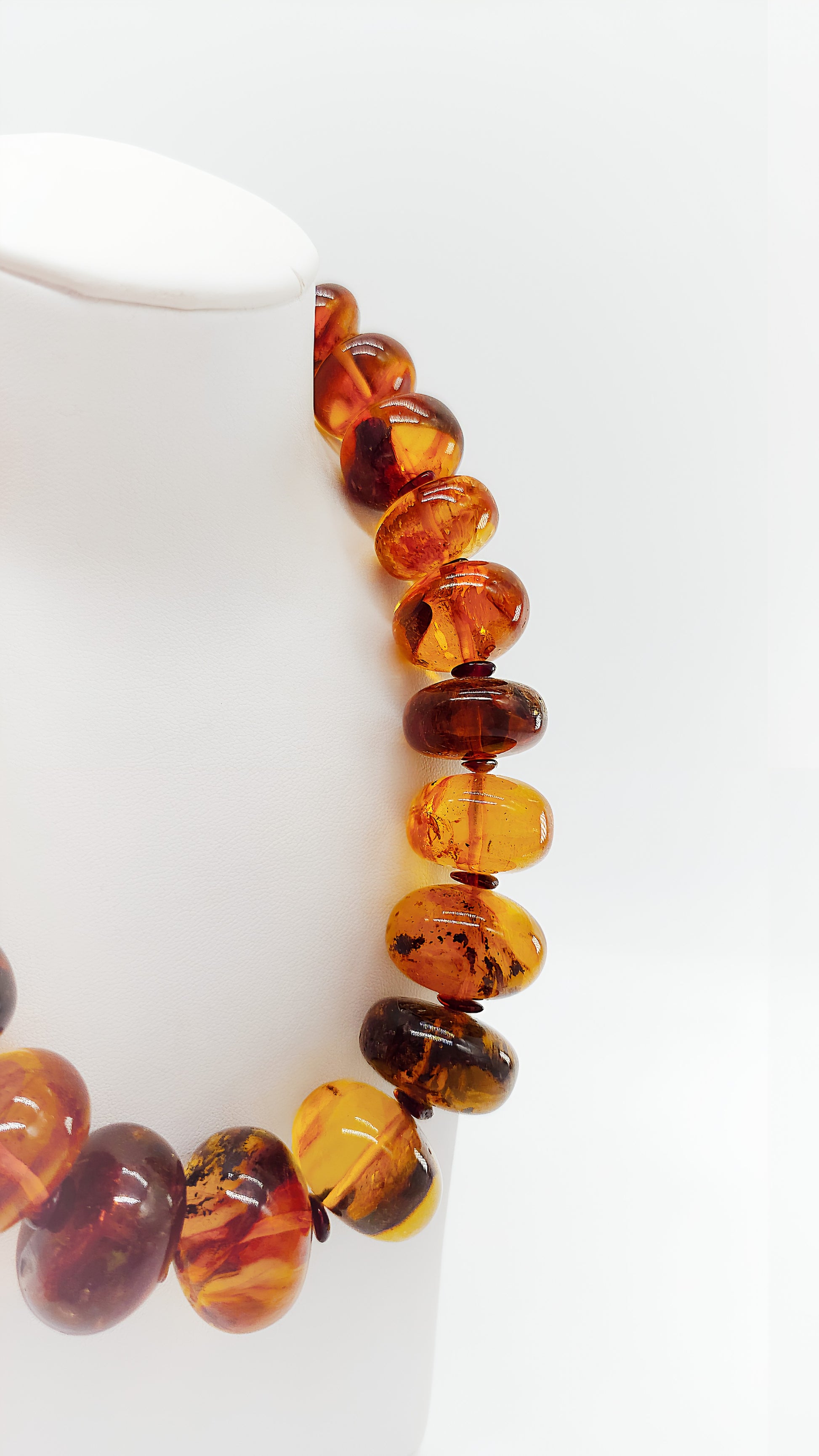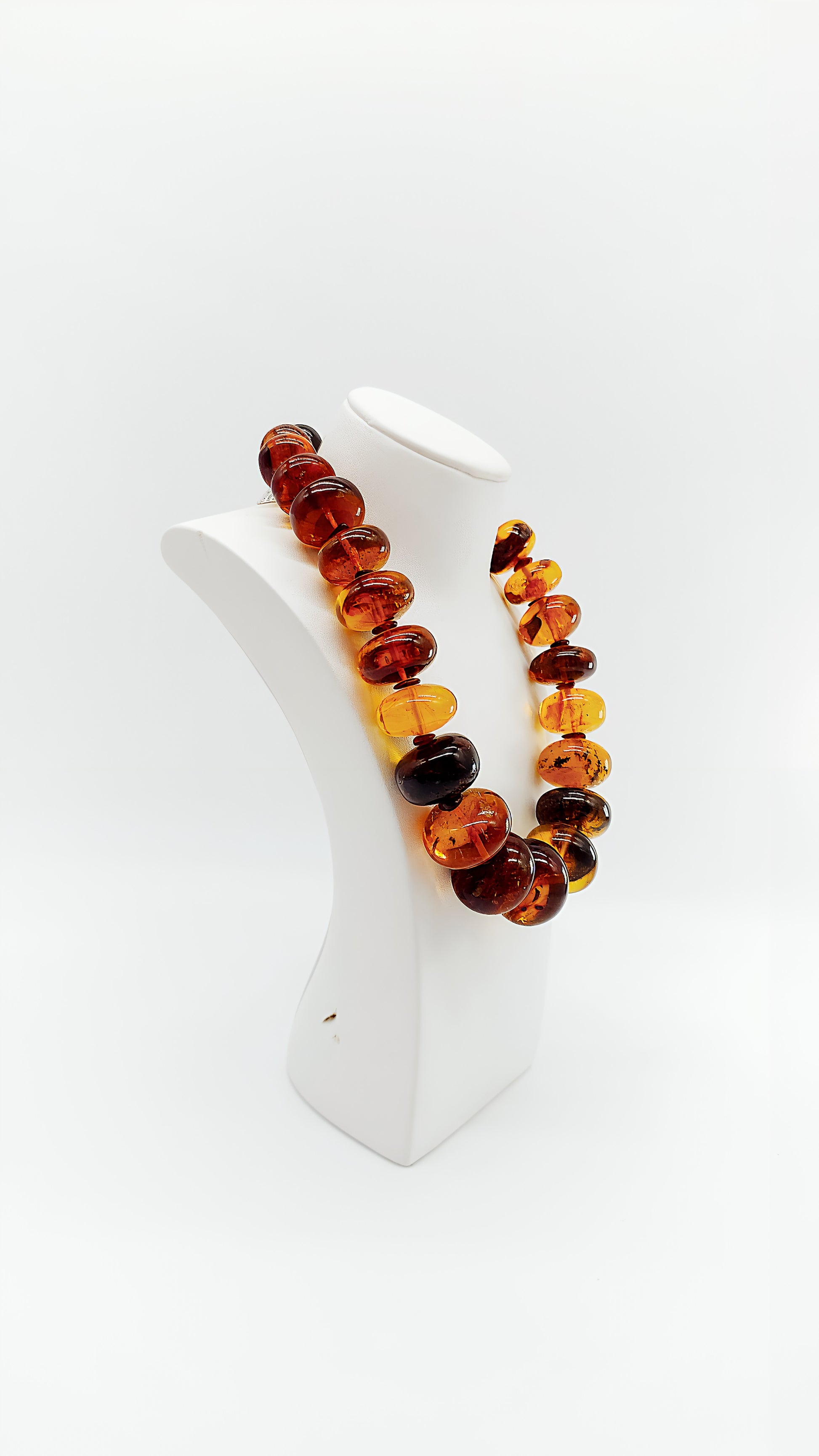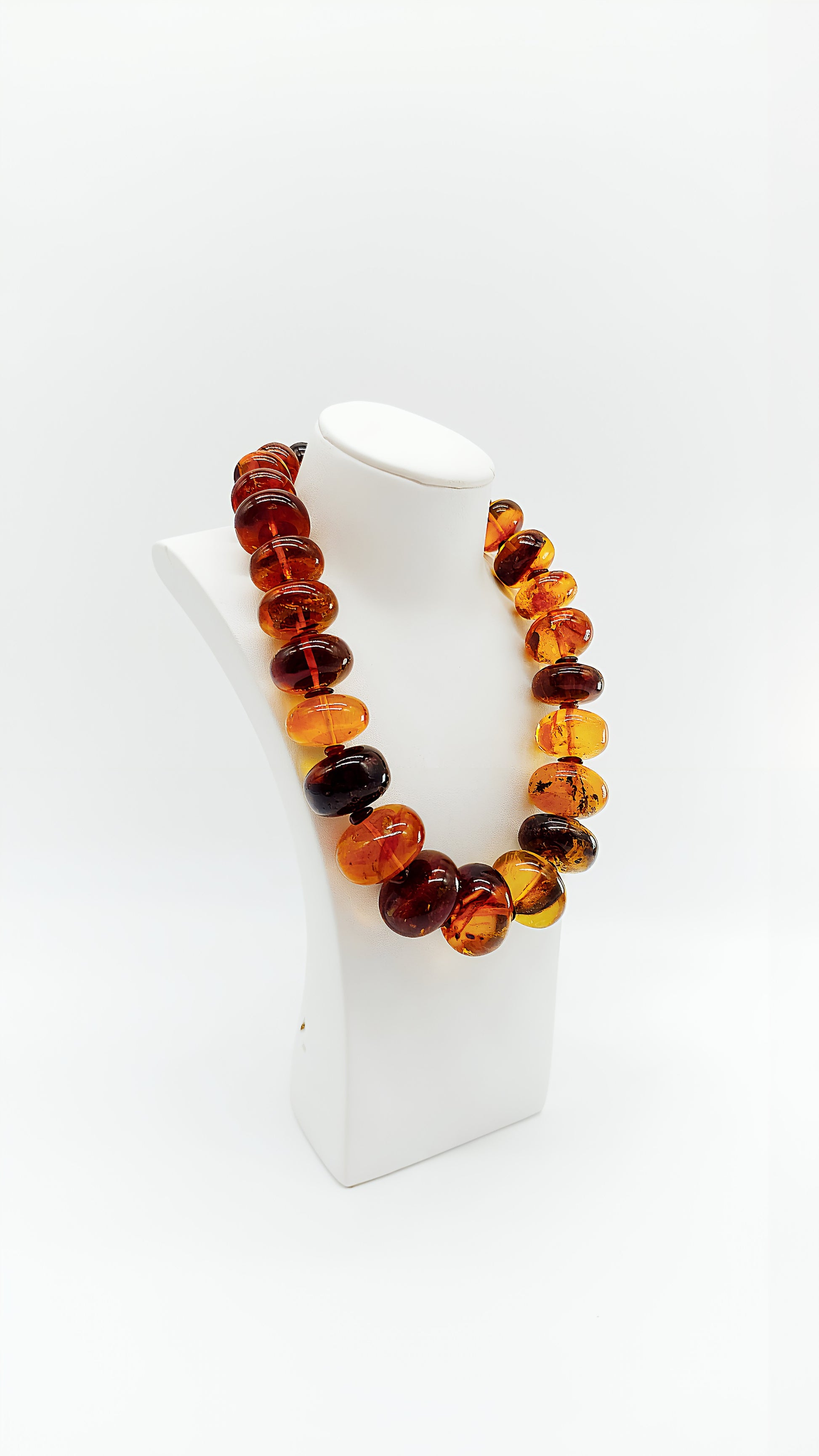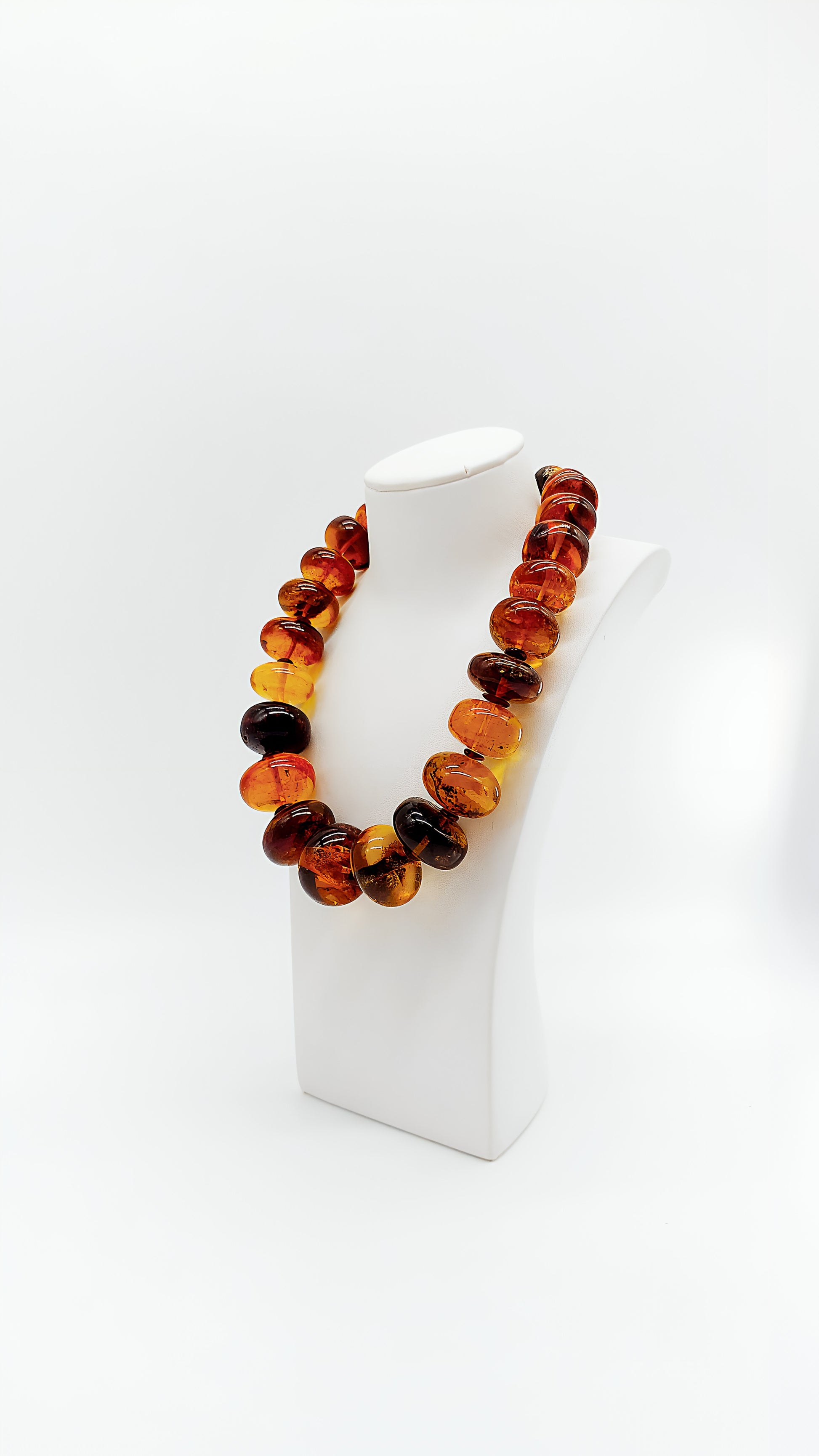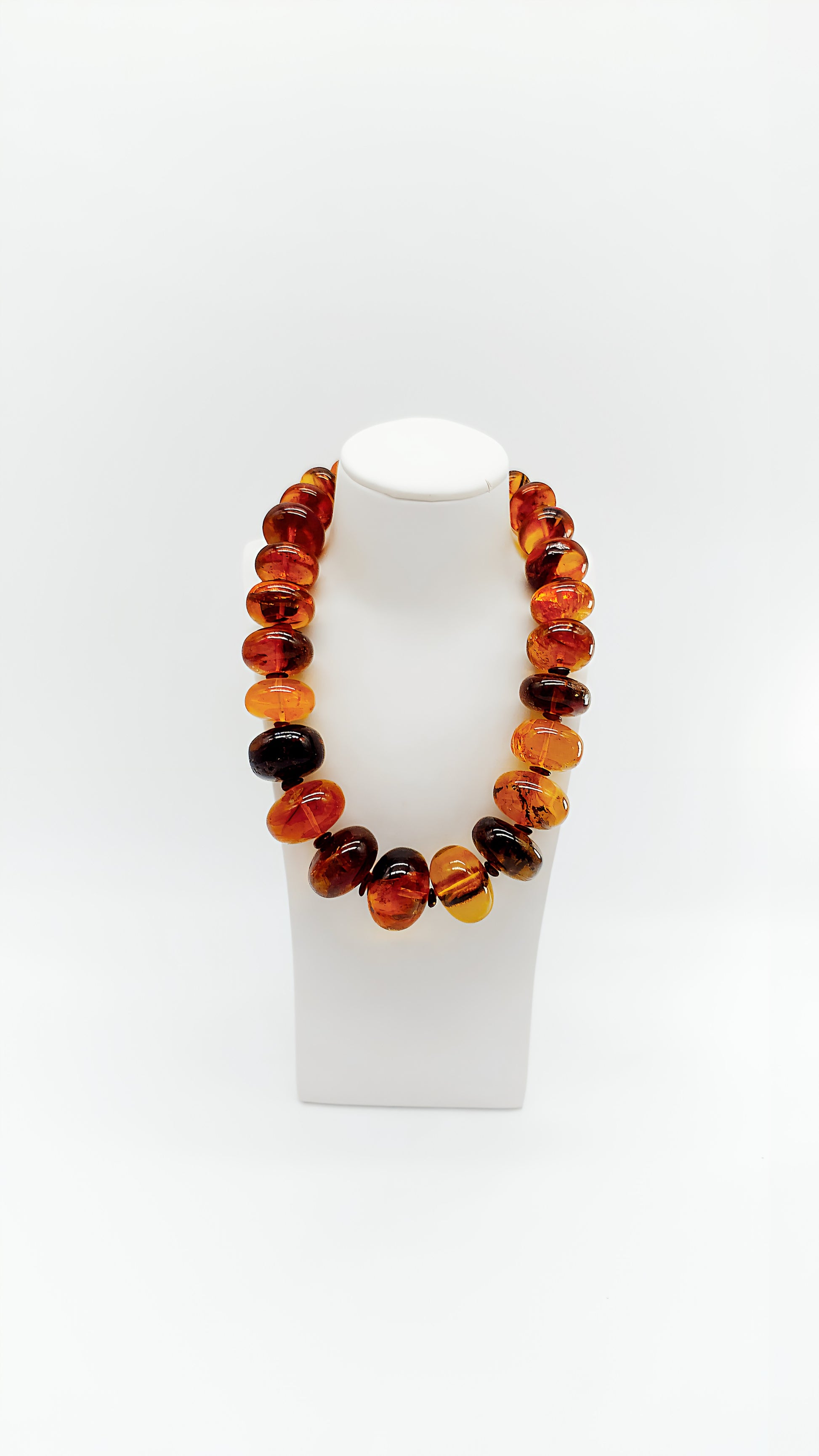 This striking amber necklace is truly unique, combining natural beauty with exquisite design. Each amber stone sparkles in warm tones ranging from deep cognac to golden accents, exuding pure elegance. Handcrafted and perfectly crafted, this necklace is a real eye-catcher for any occasion. Wear a piece of nature around your neck and experience the timeless allure of amber.