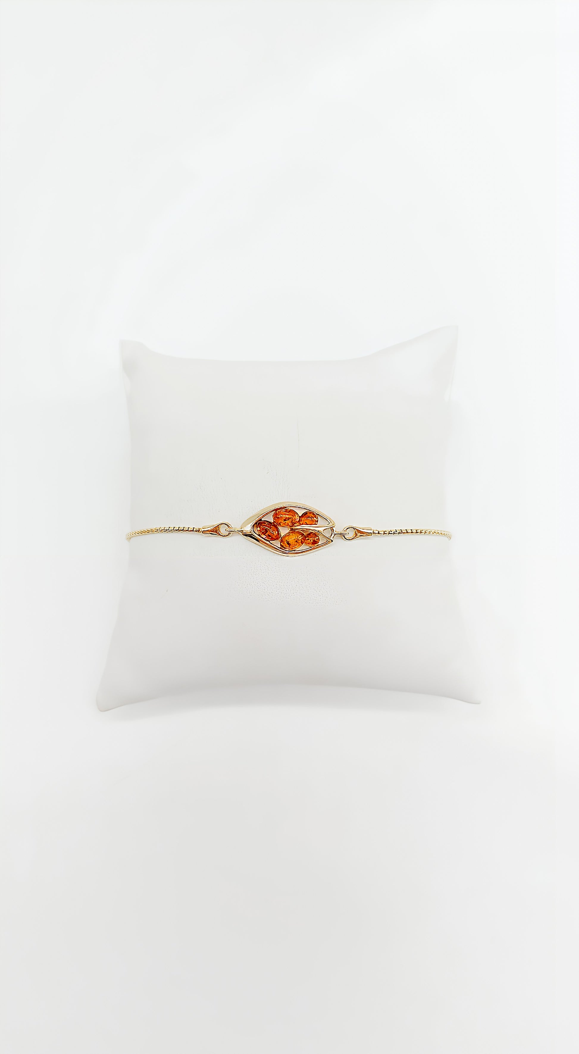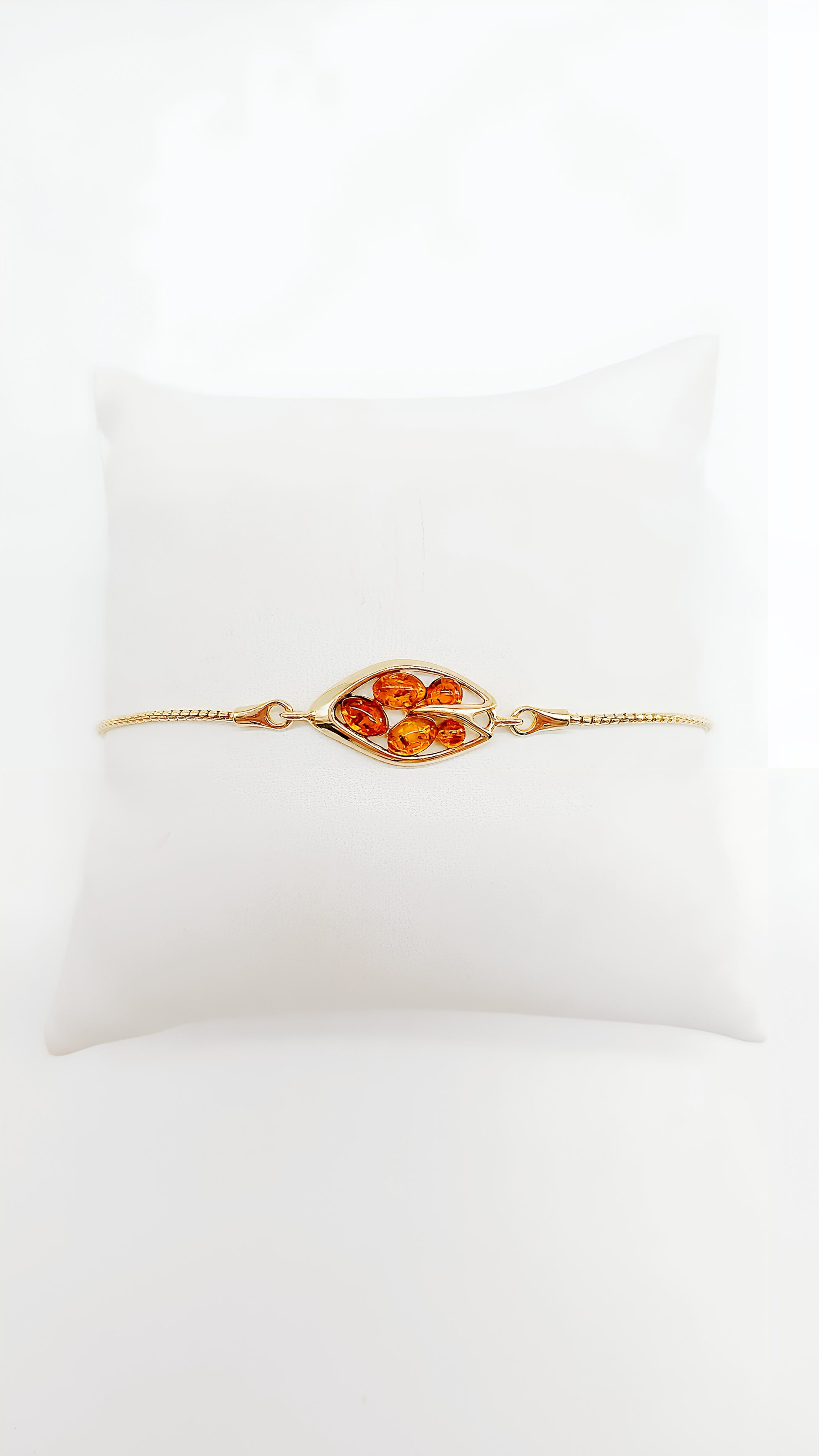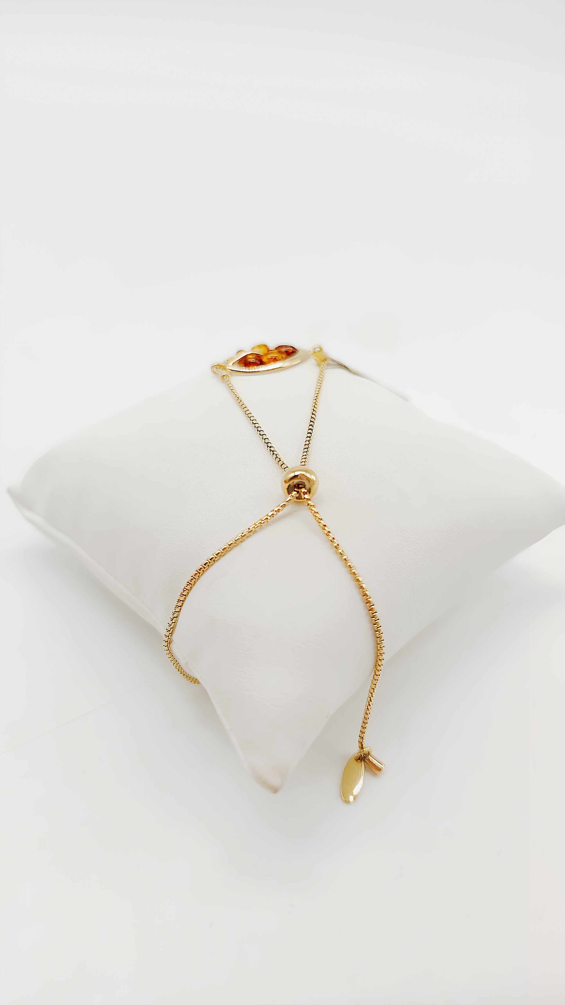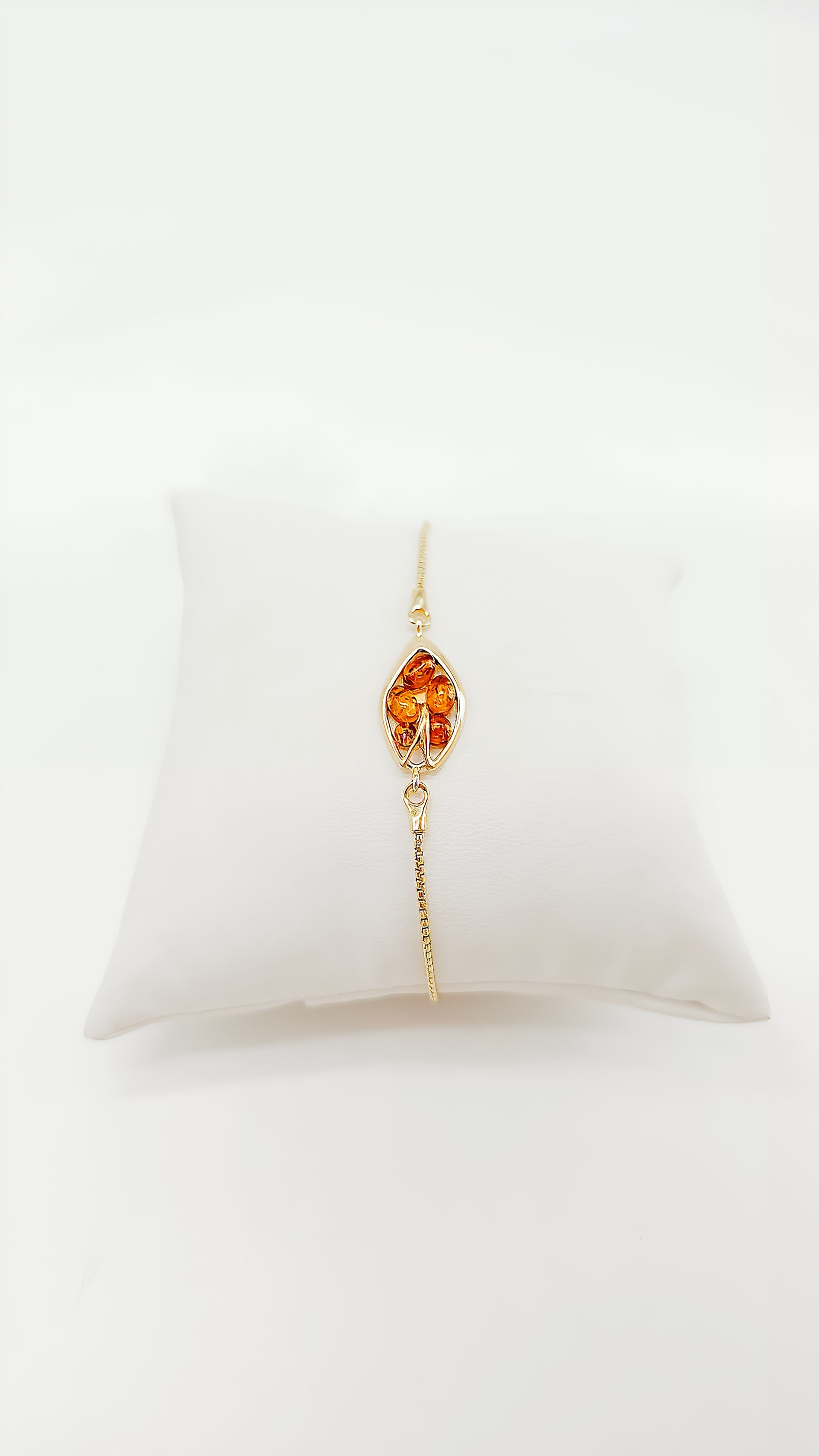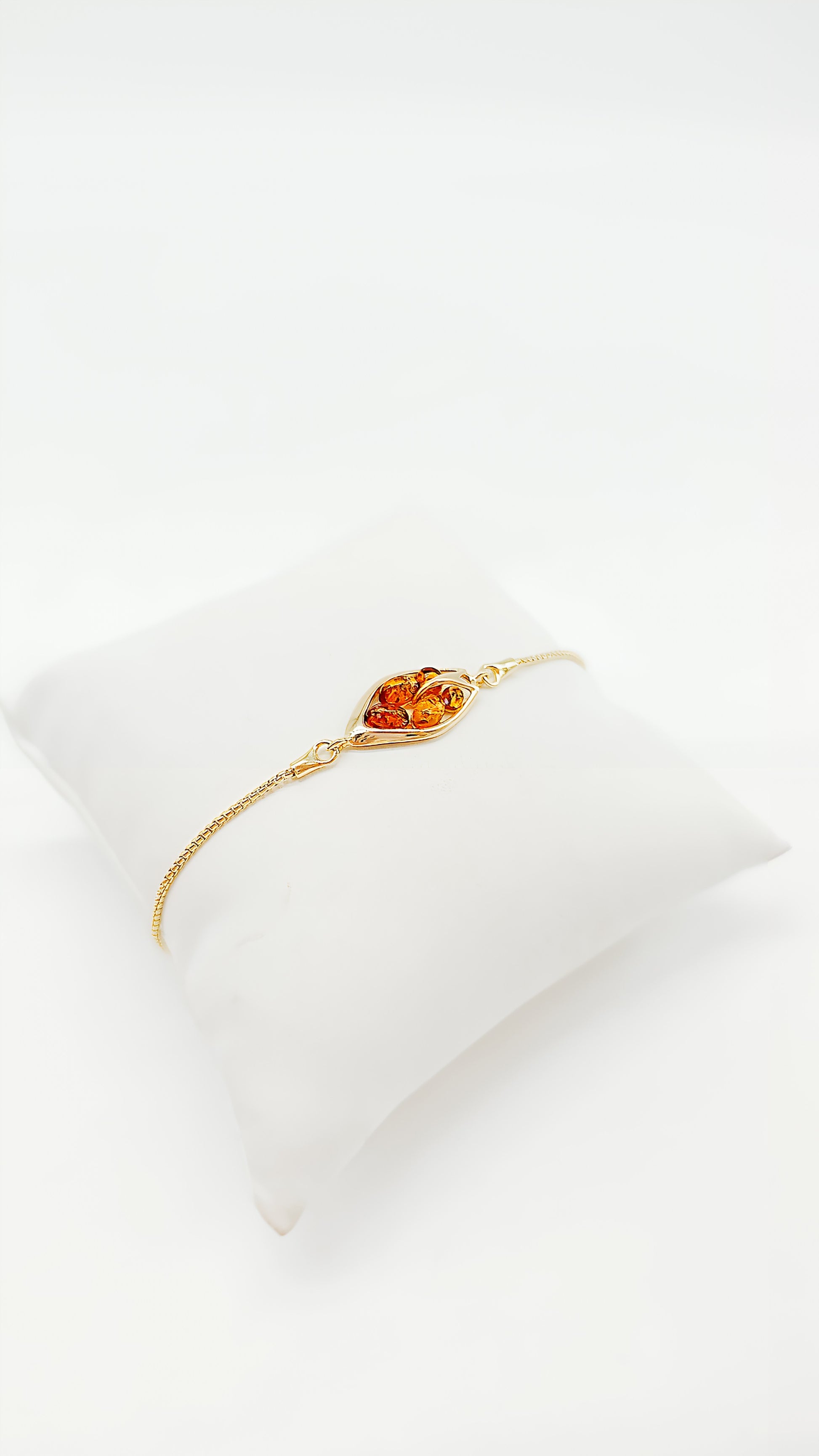 This delicate and elegant bracelet made of gold-plated 925 sterling silver captivates with its delicate craftsmanship and radiant amber stones. The warm glow of the amber is perfectly accentuated by the sophisticated gold tones. This handcrafted, unique piece is a stylish companion for both everyday wear and special occasions. A piece of jewelry that impresses with its timeless elegance and high-quality craftsmanship, enhancing any outfit.