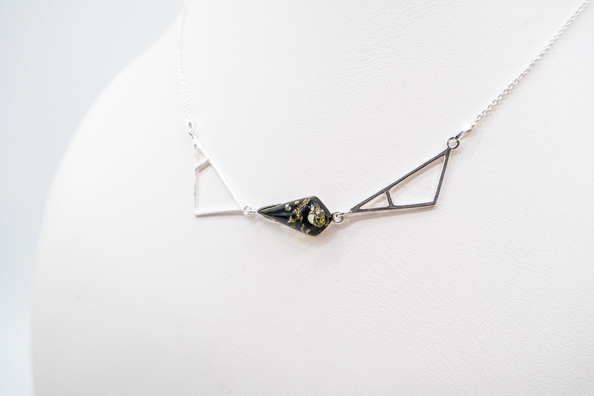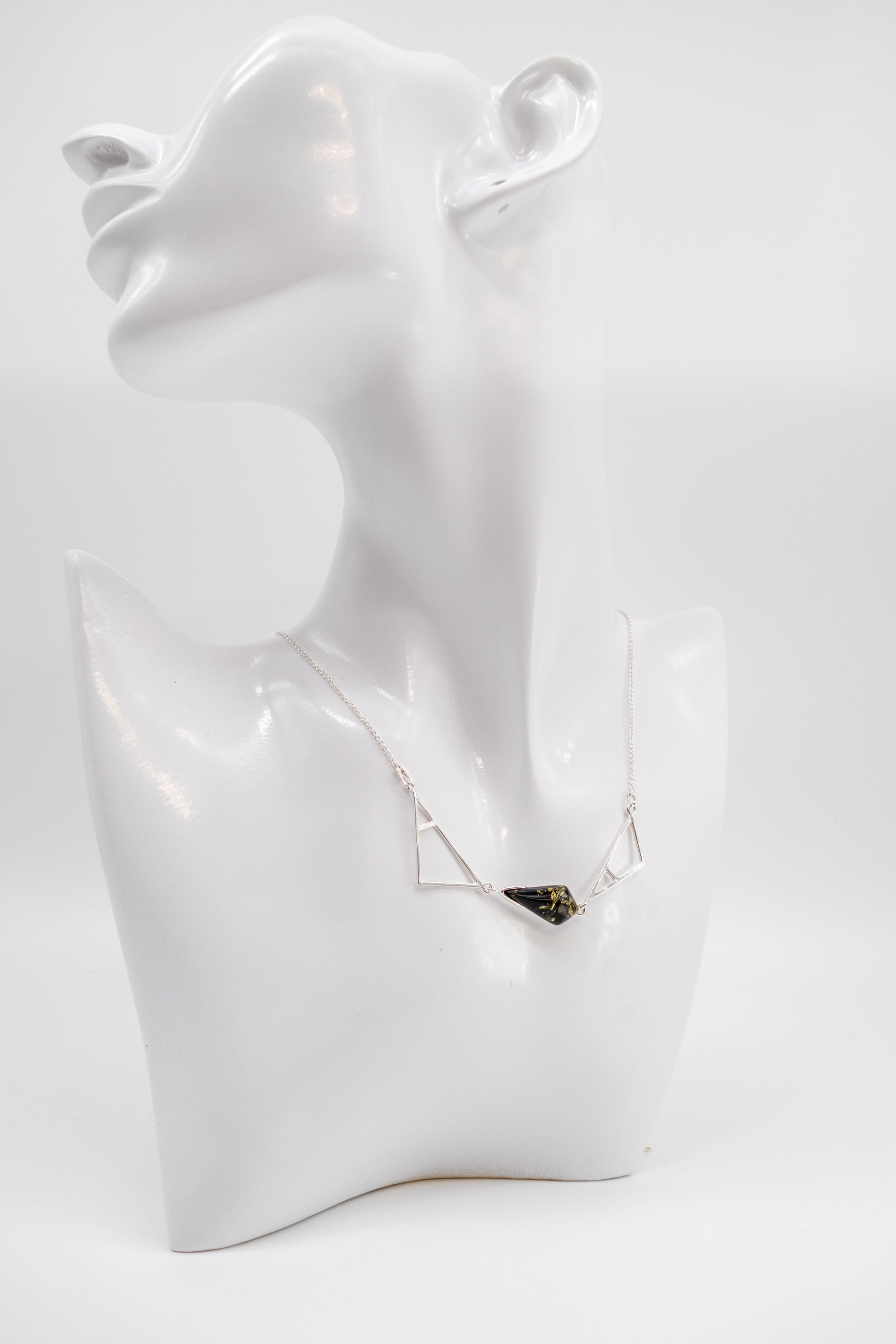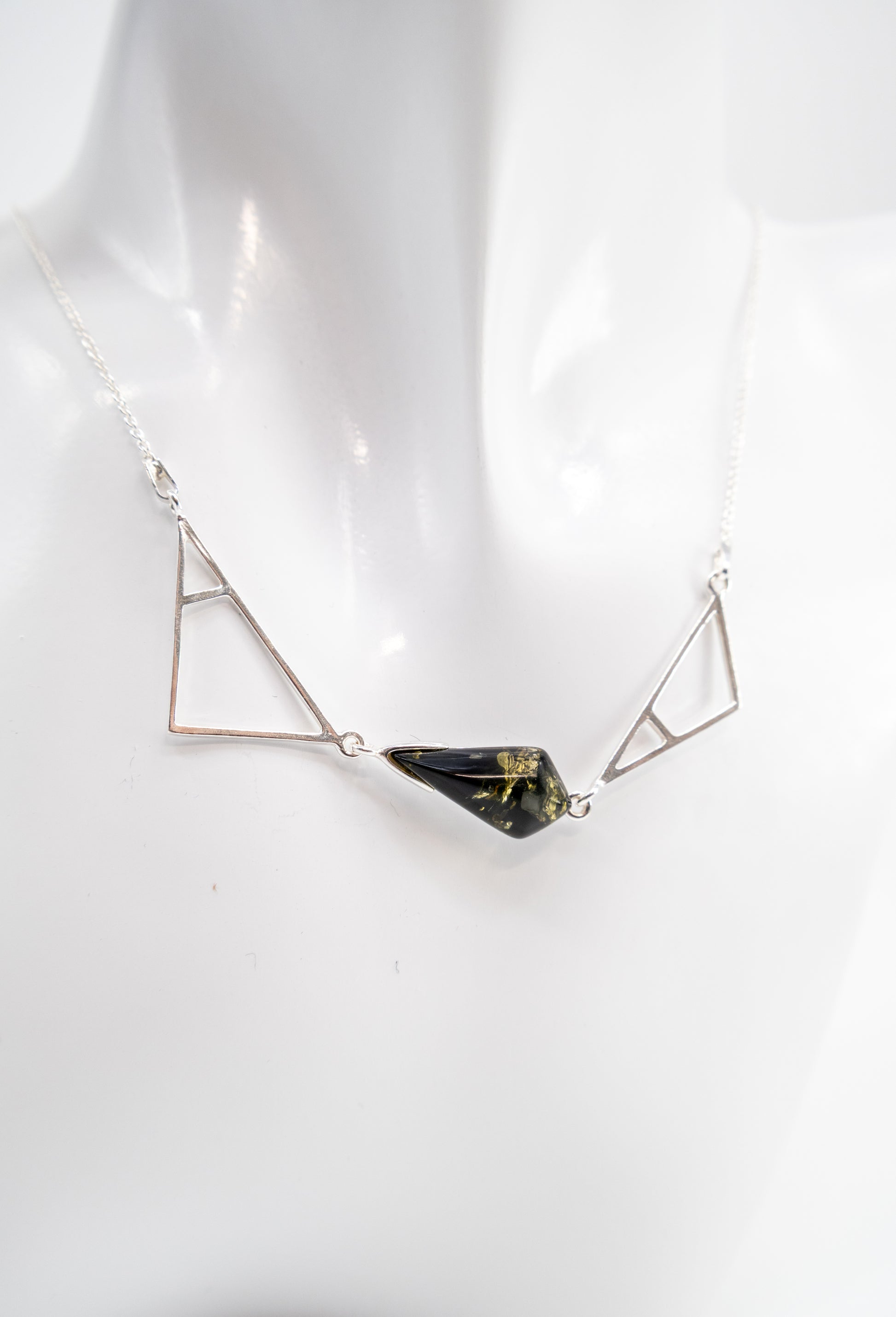 This exclusive 925 sterling silver necklace combines minimalist design with a captivating green amber. The geometric style of the silver setting gives the piece a modern and stylish aesthetic. The natural green amber adds a touch of nature, providing a unique, organic contrast to the cool silver. This handcrafted necklace is perfect for those who want to combine modern design with natural elements.