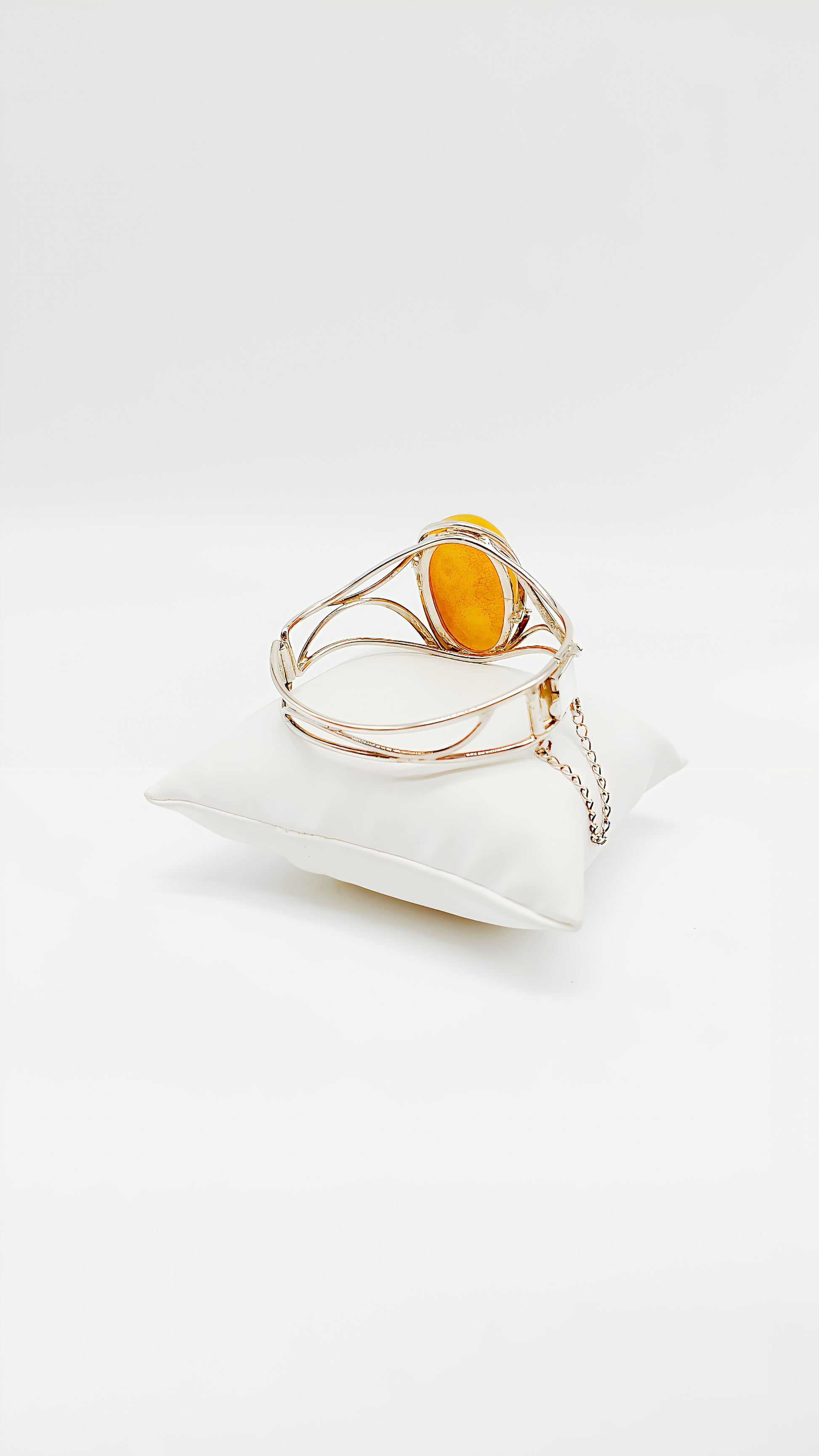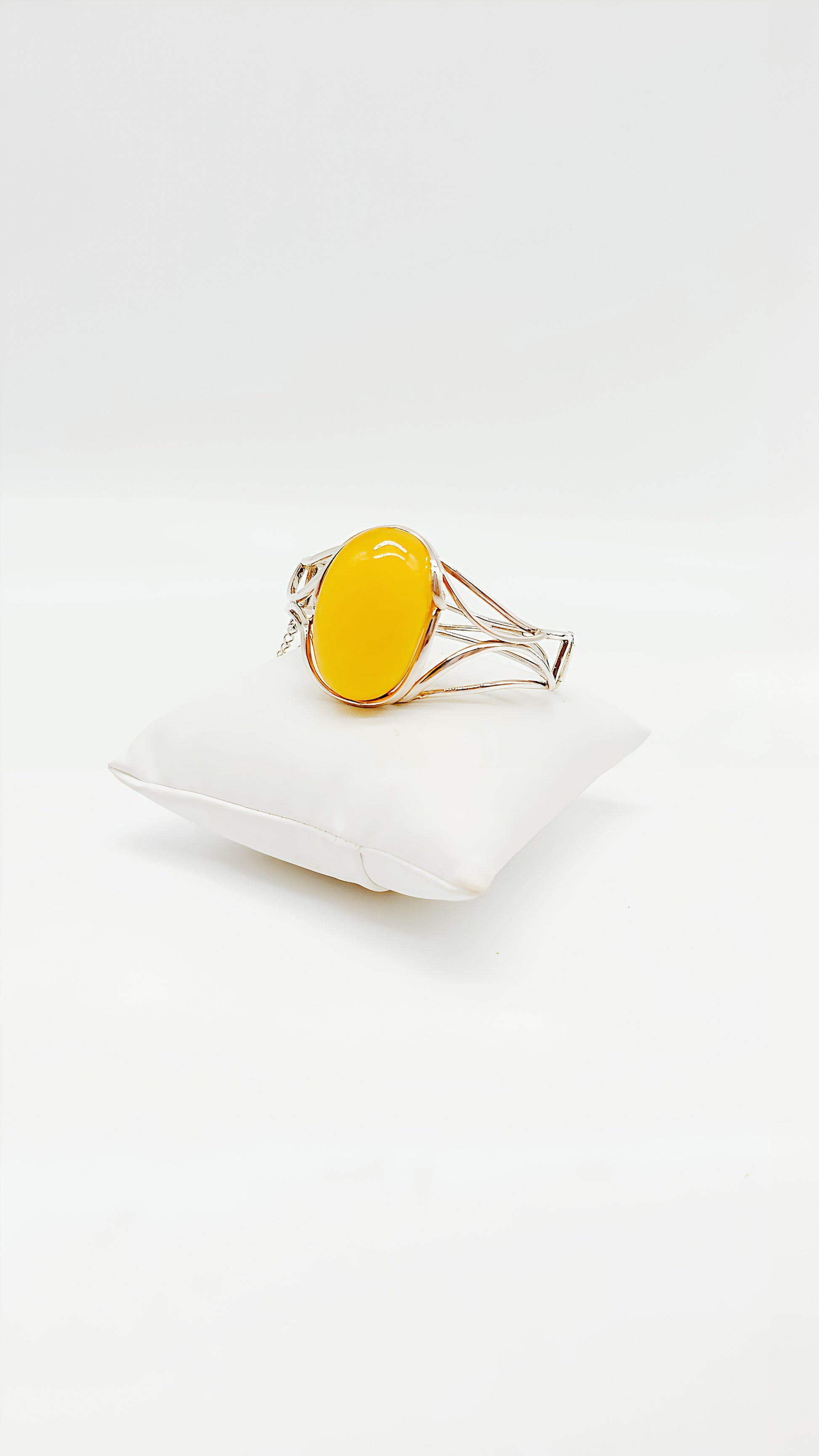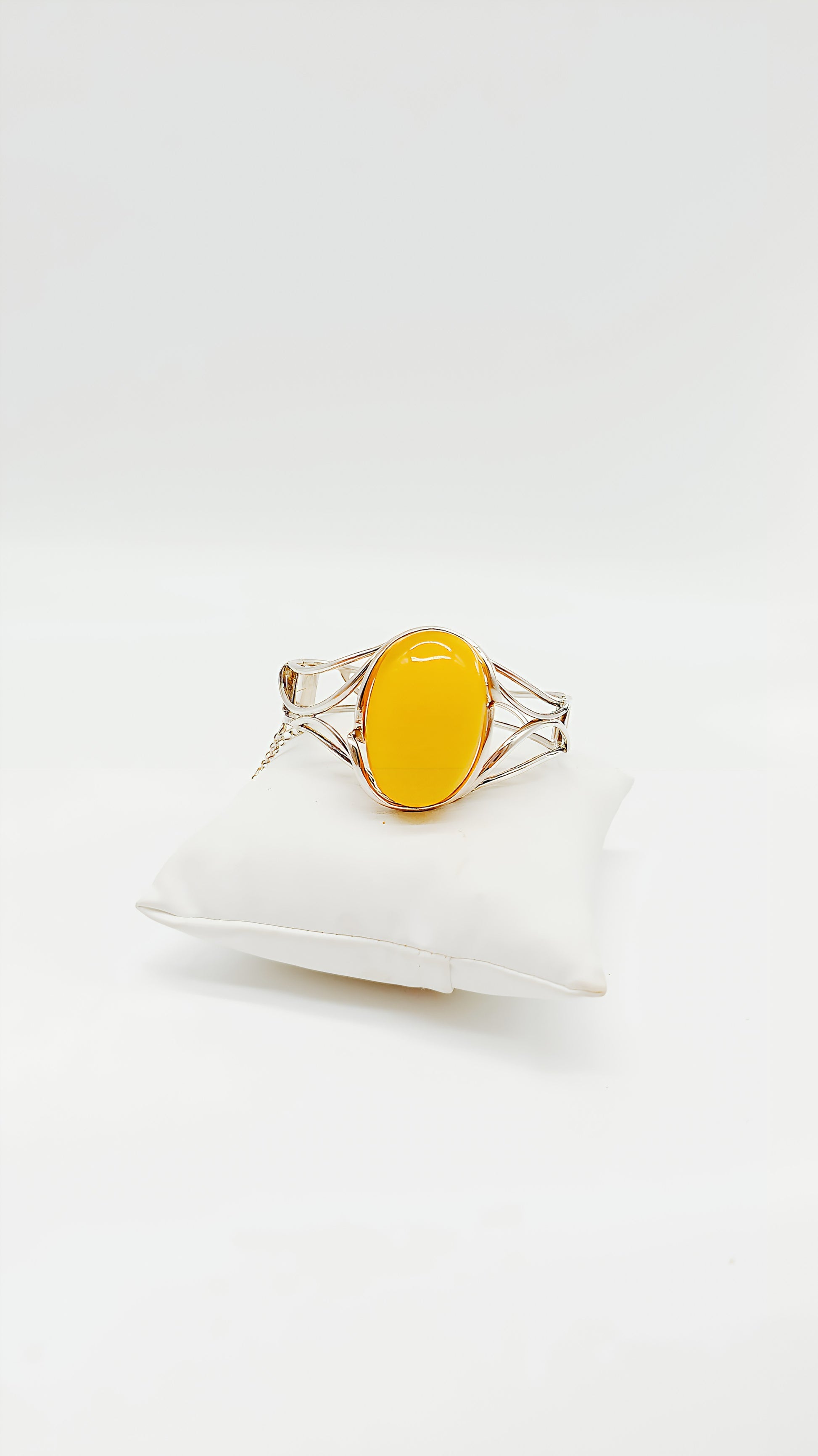 This stylish 925 sterling silver bangle combines modern elegance with the natural beauty of amber. The central yellow amber stone draws all eyes and gives the piece a sunny and warm glow. The delicate silver setting perfectly frames the oval stone, while the open structure of the bangle creates a light, airy look. Ideal for adding a touch of luxury to both everyday life and special occasions. This bangle is truly unique and a must-have for lovers of exclusive, handcrafted jewelry.