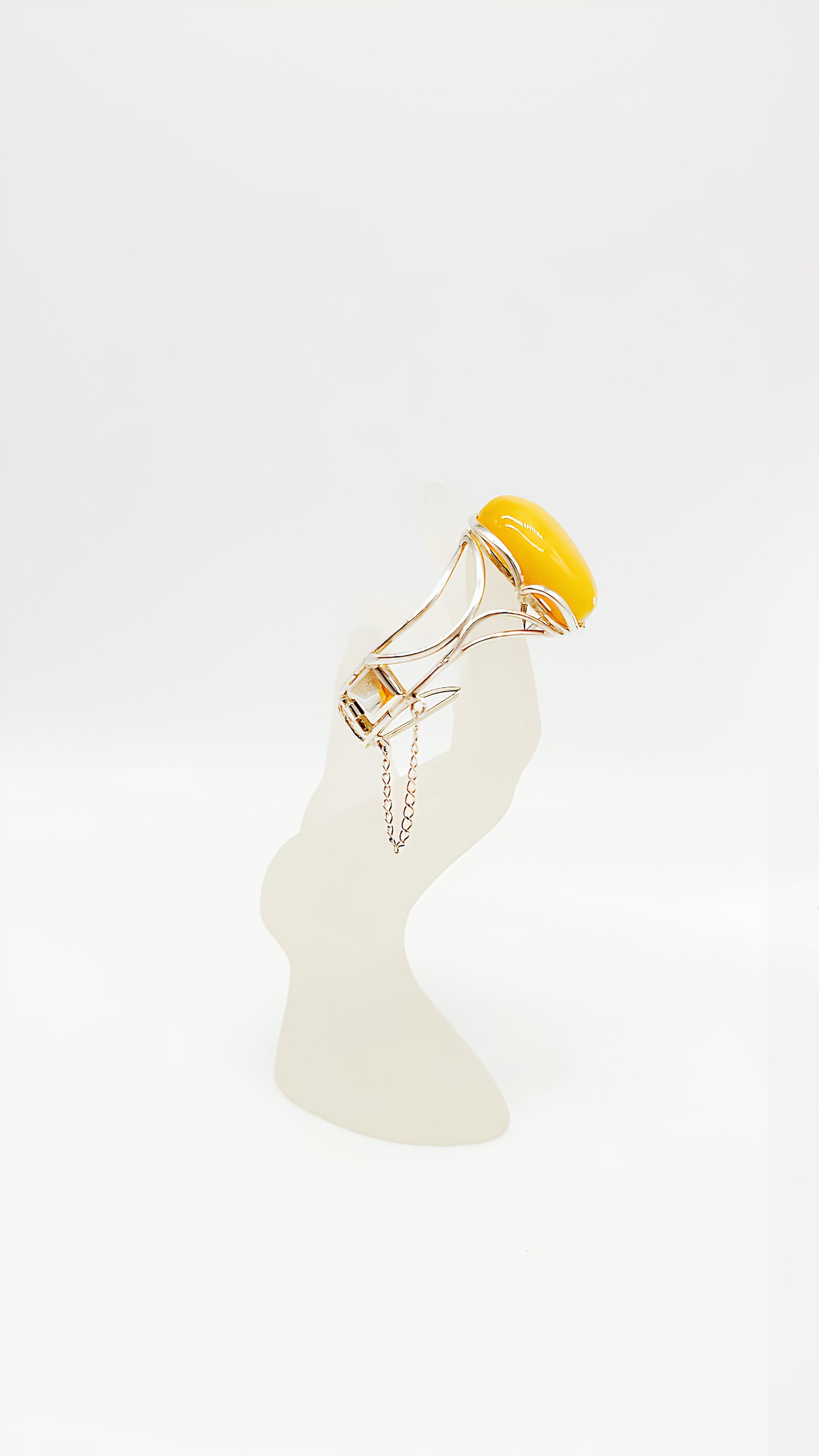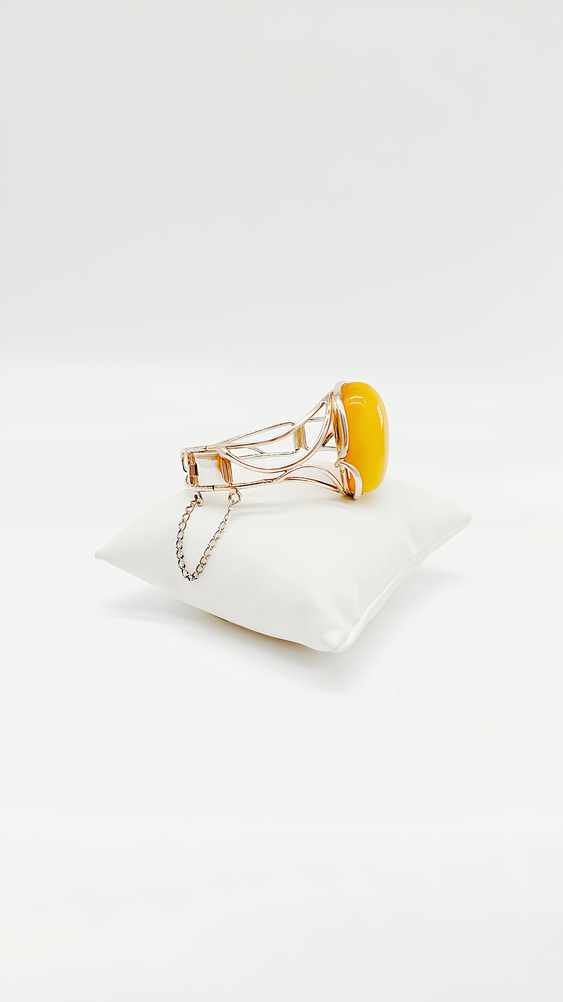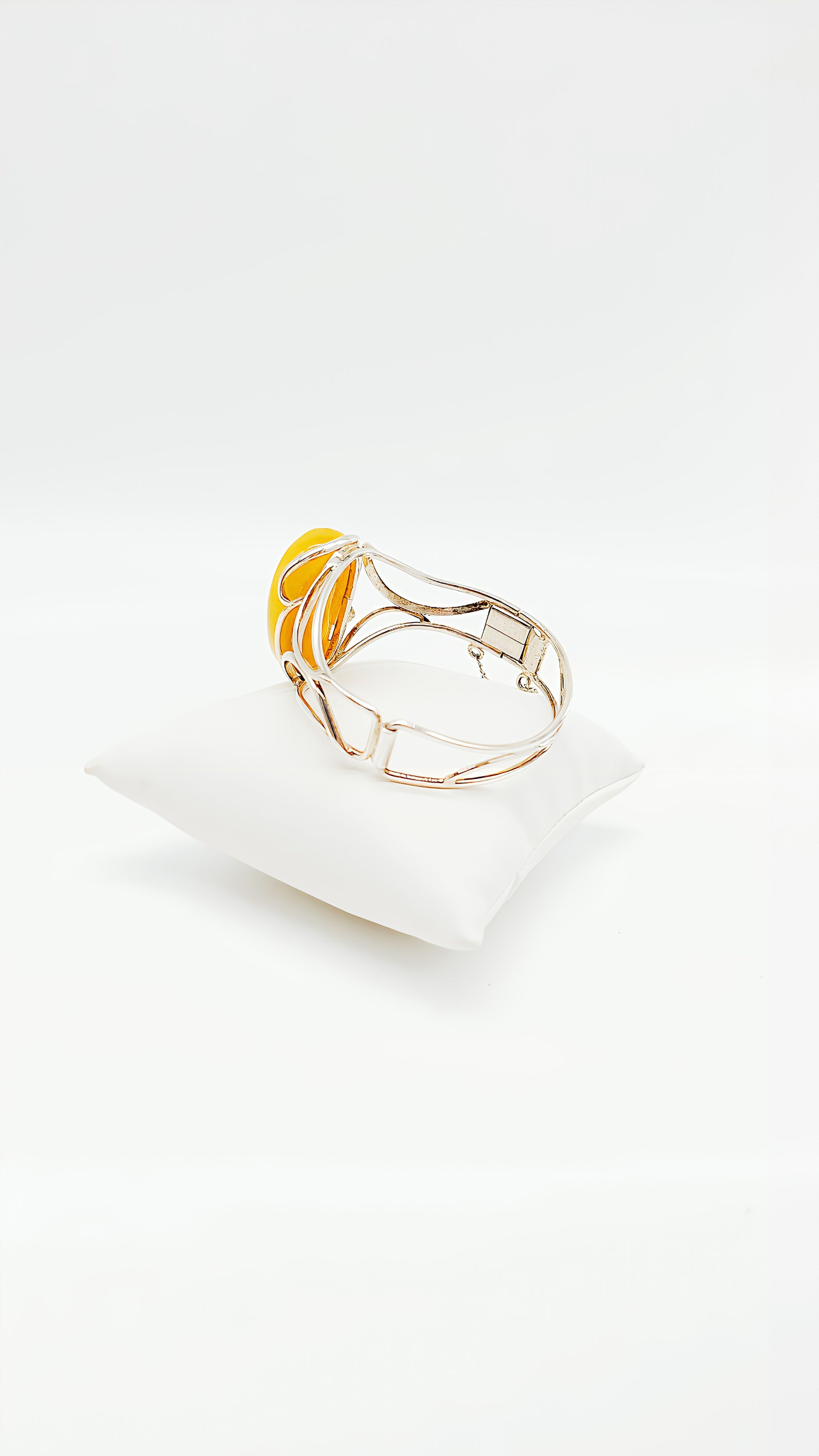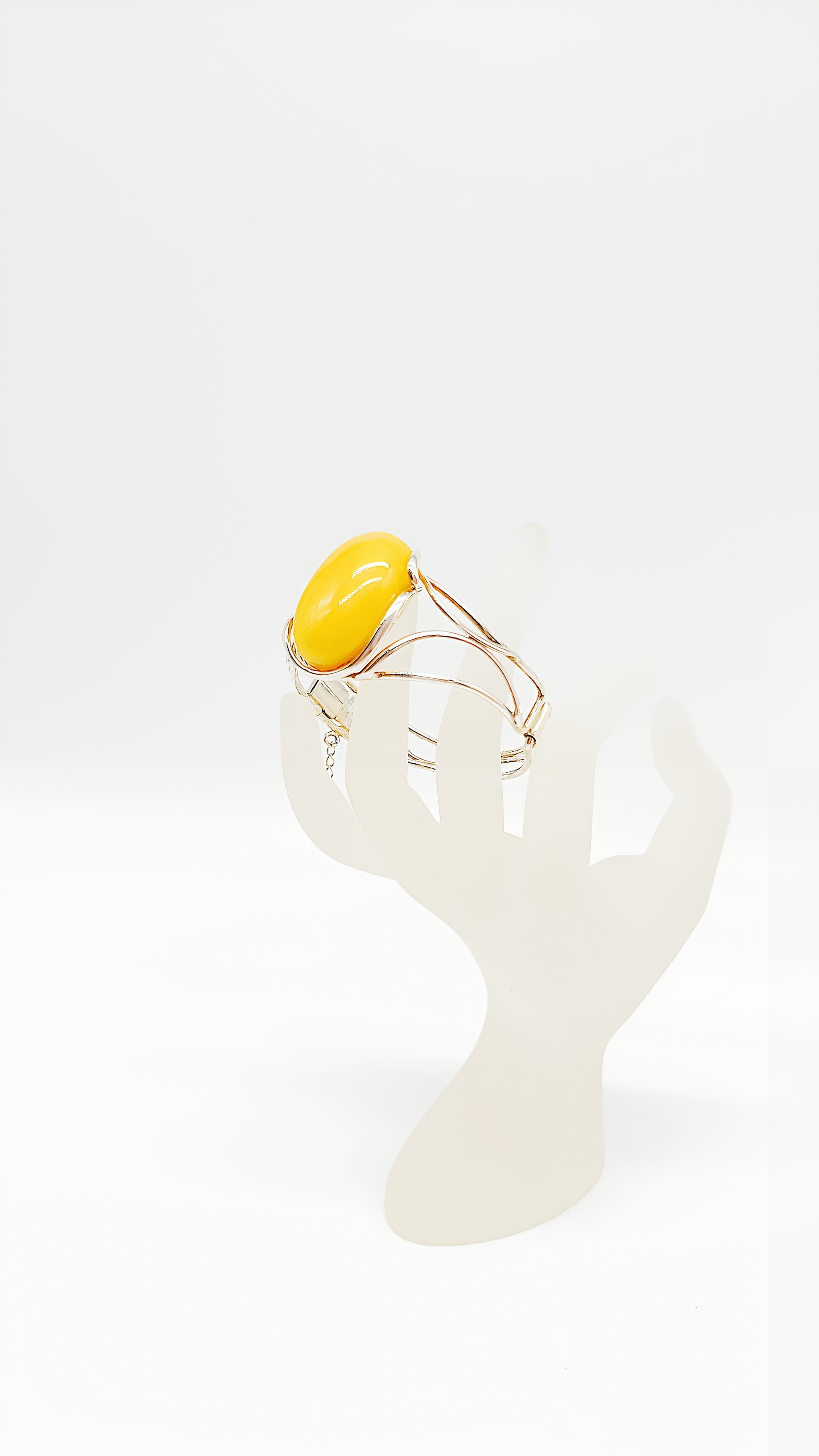 This stylish 925 sterling silver bangle combines modern elegance with the natural beauty of amber. The central yellow amber stone draws all eyes and gives the piece a sunny and warm glow. The delicate silver setting perfectly frames the oval stone, while the open structure of the bangle creates a light, airy look. Ideal for adding a touch of luxury to both everyday life and special occasions. This bangle is truly unique and a must-have for lovers of exclusive, handcrafted jewelry.