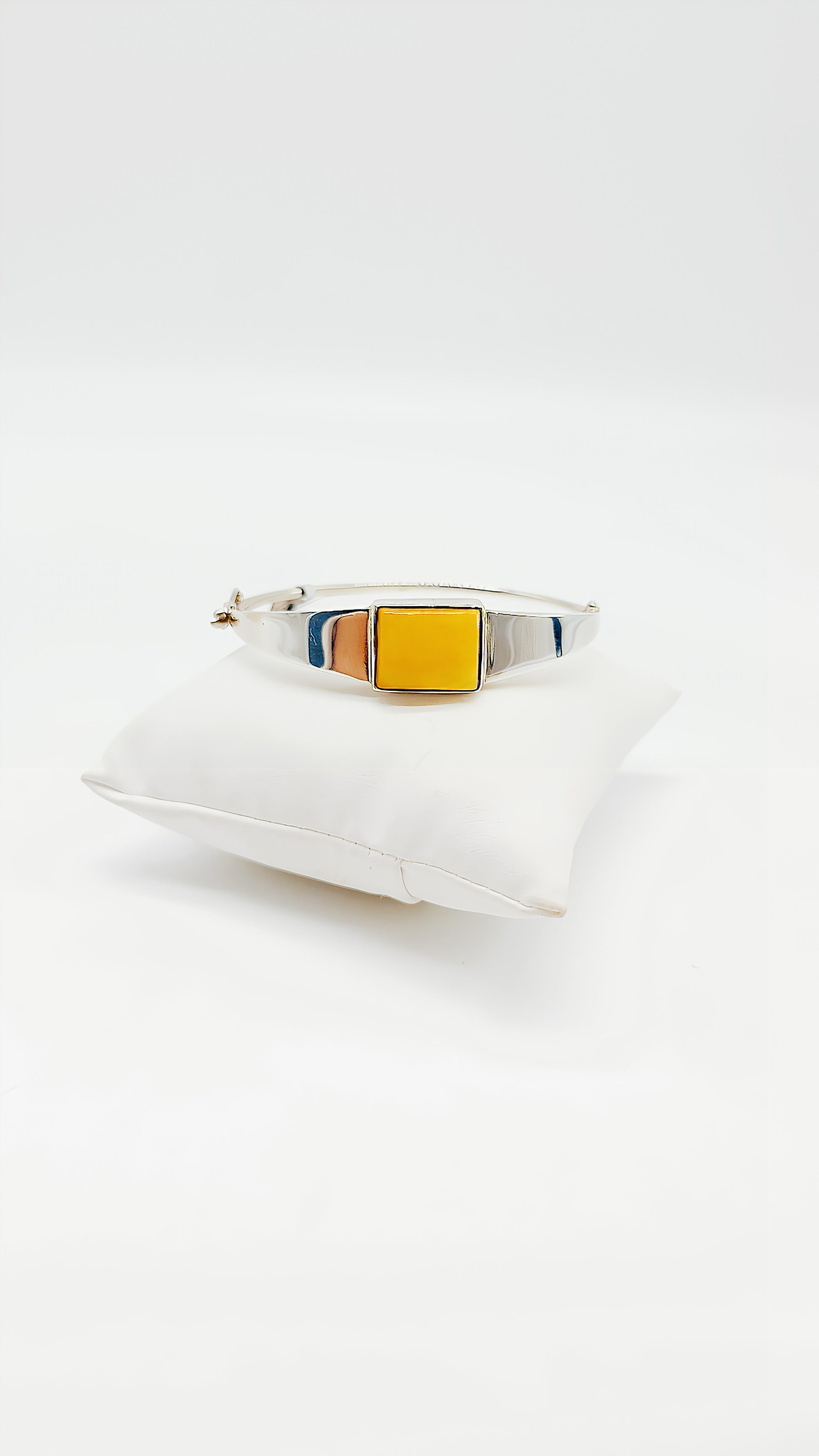 This minimalist 925 sterling silver bangle impresses with its clean design, highlighting the natural radiance of the square-set amber. The warm, golden-yellow color of the stone offers an exciting contrast to the cool silver. This elegant bangle is the perfect accessory for style-conscious wearers who want to wear a piece of nature and luxury on their wrist.