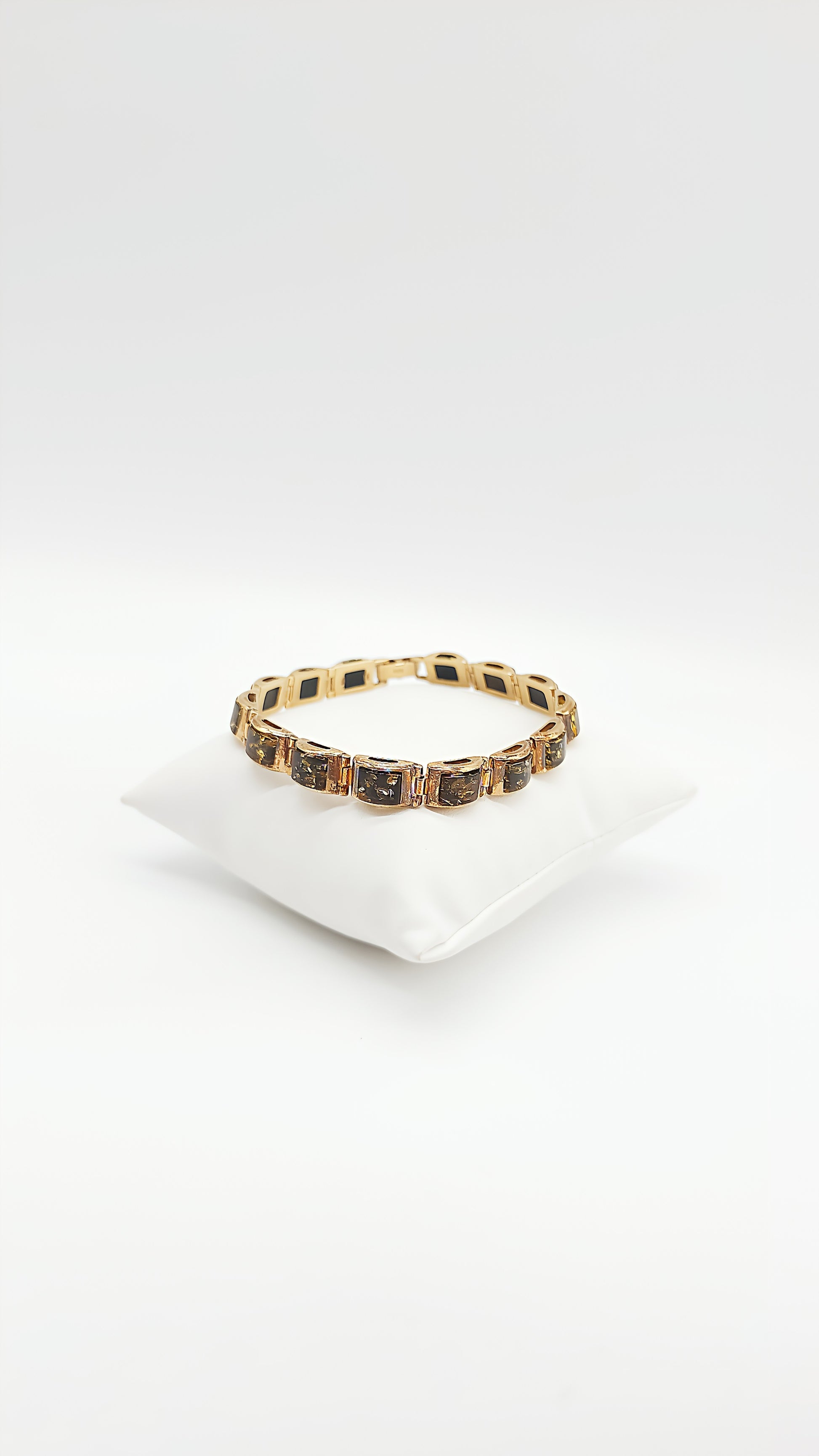 This stunning bangle, crafted from gold-plated 925 sterling silver, is adorned with lustrous amber stones set in a modern, rectangular design. The warm color palette of the amber harmonizes perfectly with the golden sheen of the silver, making this piece a luxurious accessory. Its elegant shape adapts to any wrist and adds a touch of sophistication and timeless beauty to any outfit. Whether worn for special occasions or as an everyday highlight, this bangle is a must-have for lovers of fine jewelry.