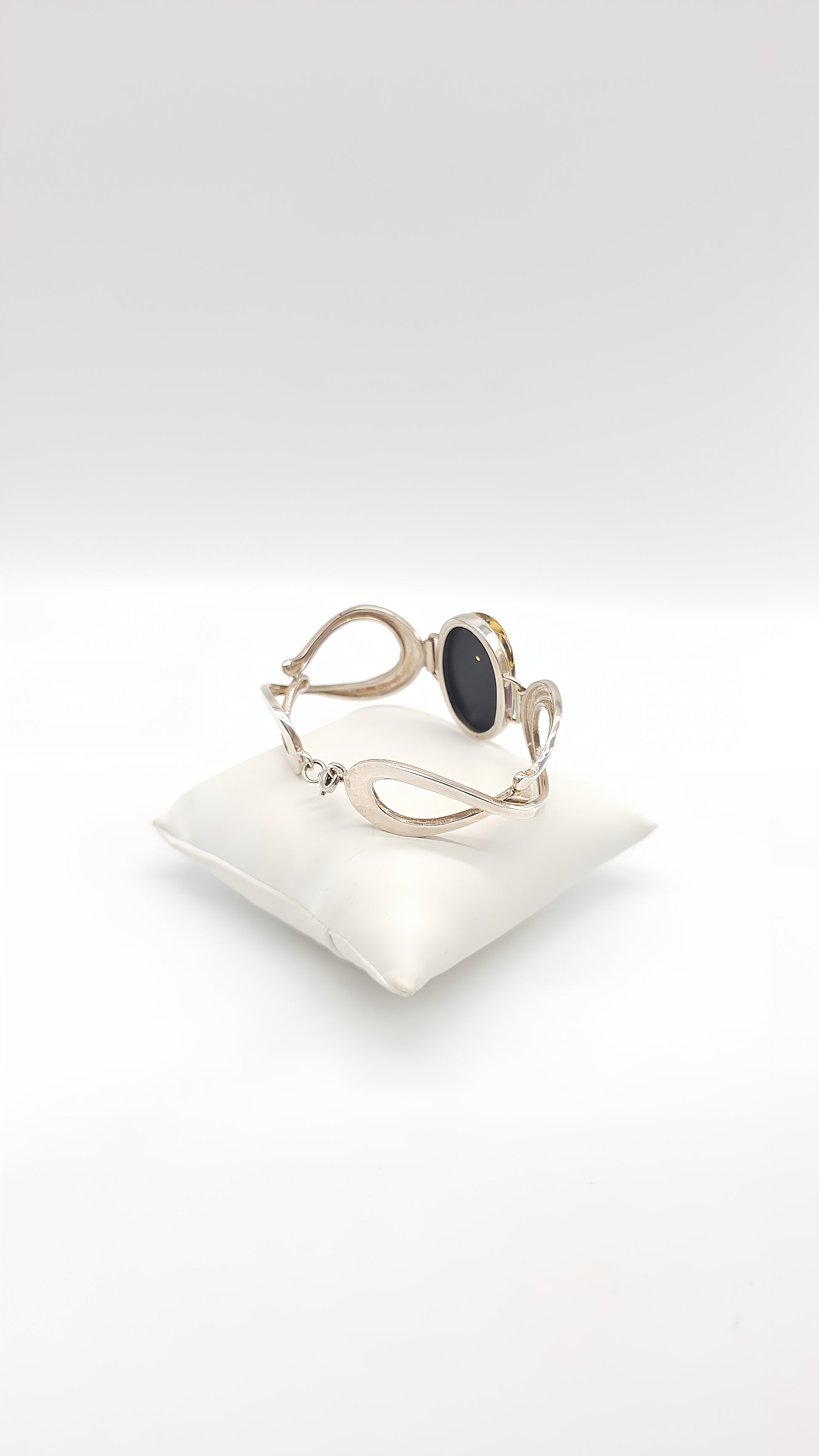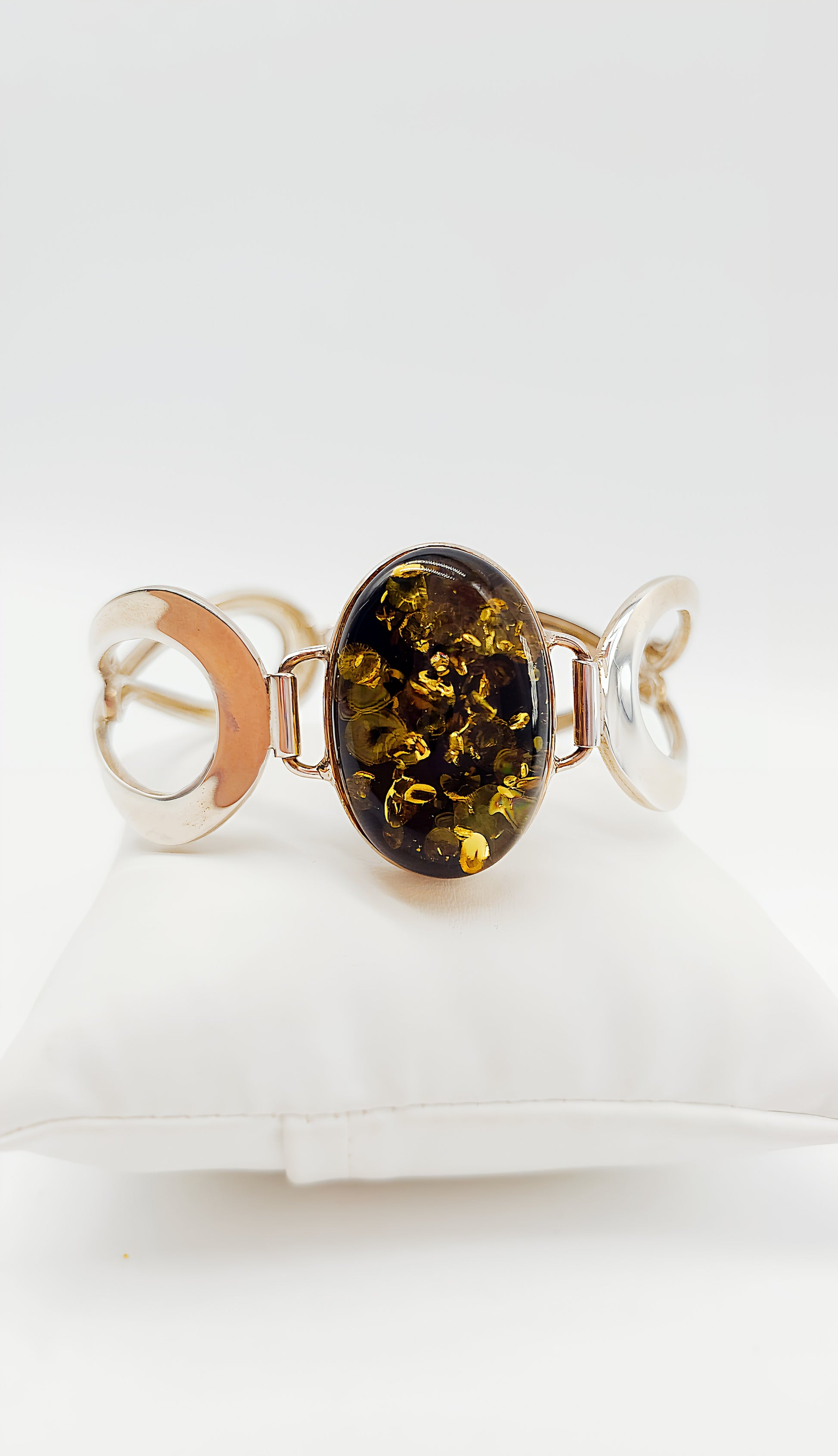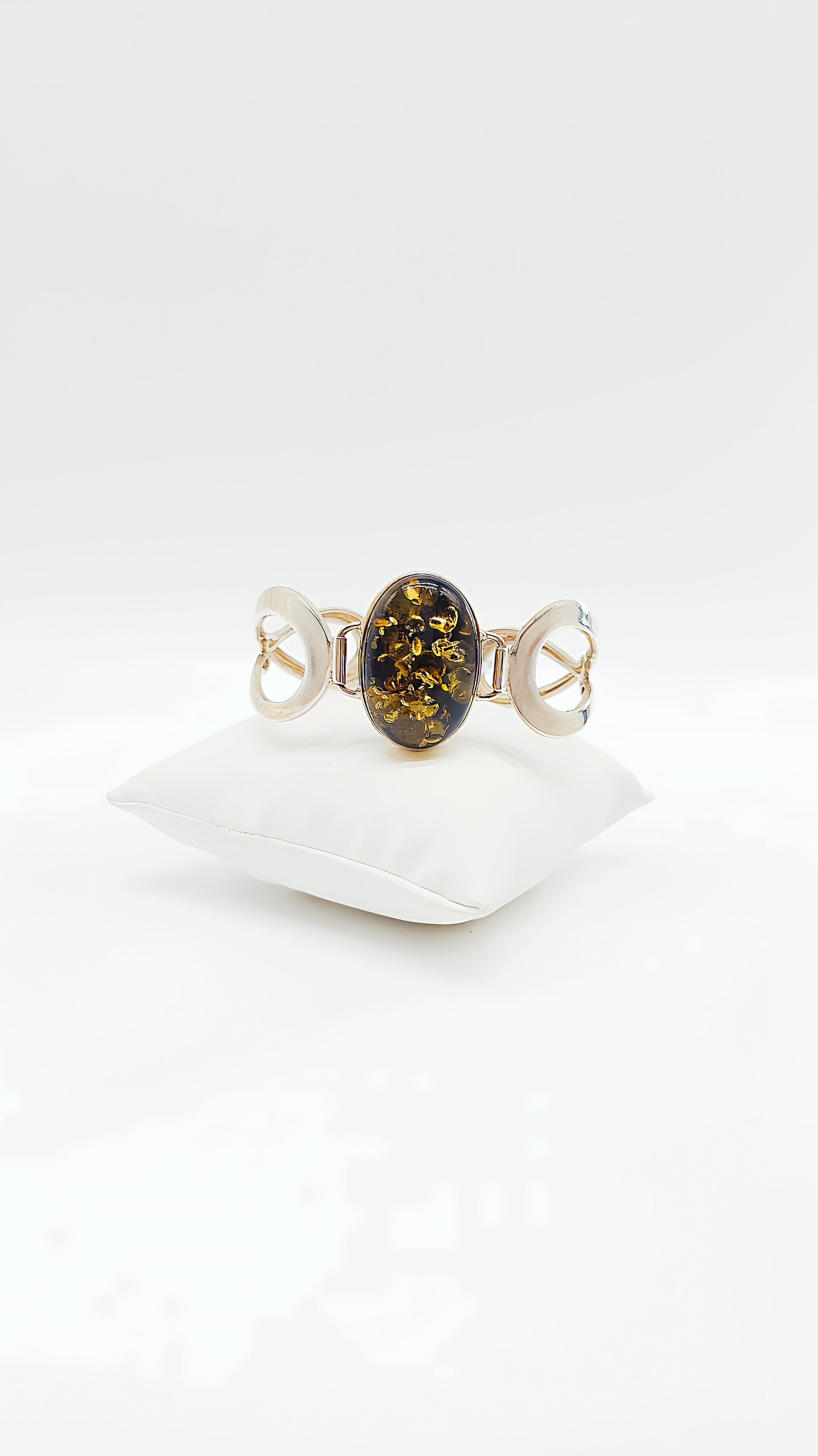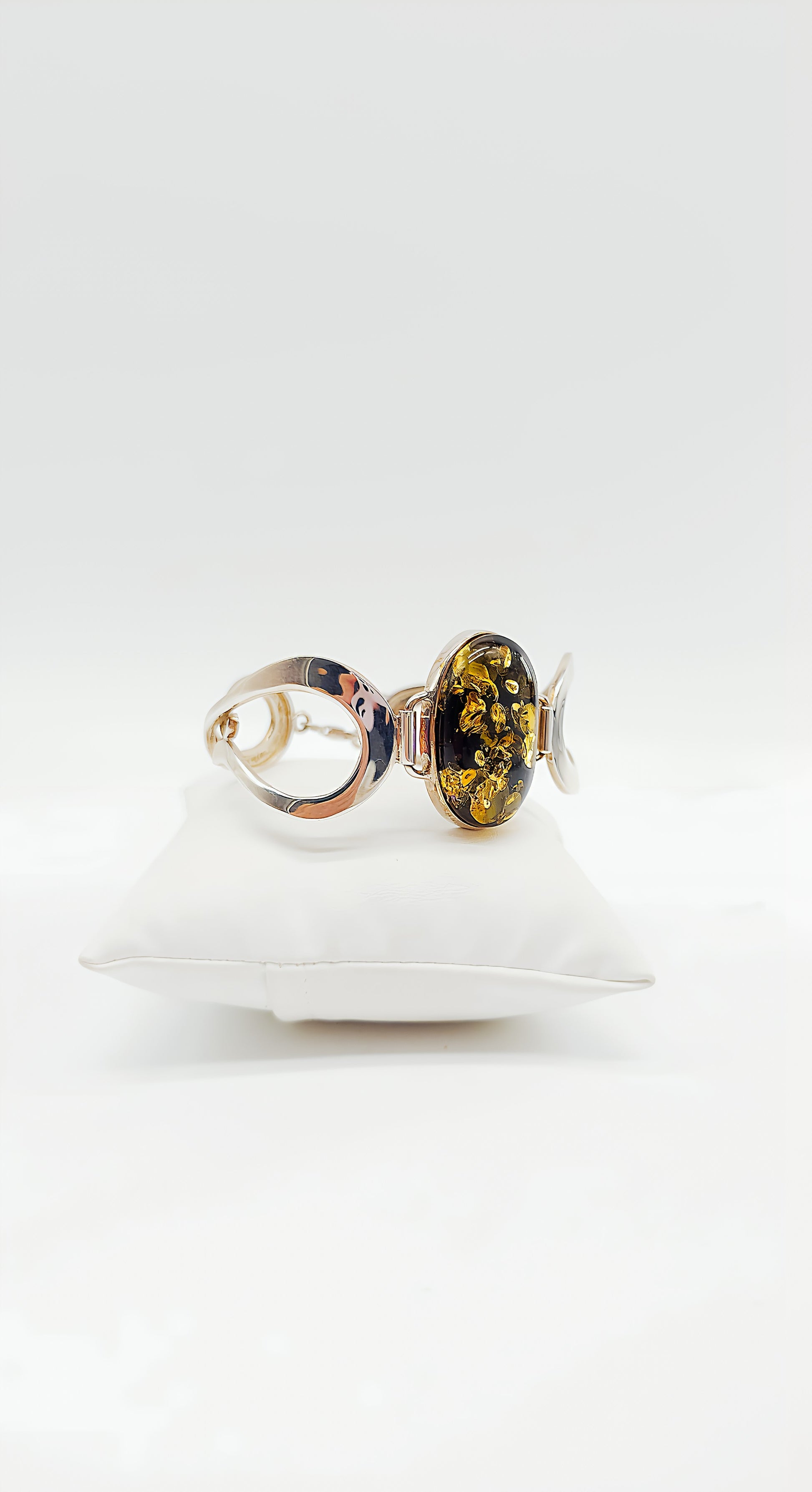 This exclusive 925 sterling silver bangle features a striking amber centerpiece that captures the light in a fascinating way. The bangle's minimalist yet sophisticated design perfectly showcases the unique texture and natural inclusions of the amber. The symmetrical shape of the bangle offers an elegant combination of geometric details and a focal oval stone. This piece of jewelry is ideal for sophisticated women who appreciate timeless elegance and understated sophistication. The bangle can be worn stylishly both everyday and on special occasions, adding a touch of luxury to any outfit.