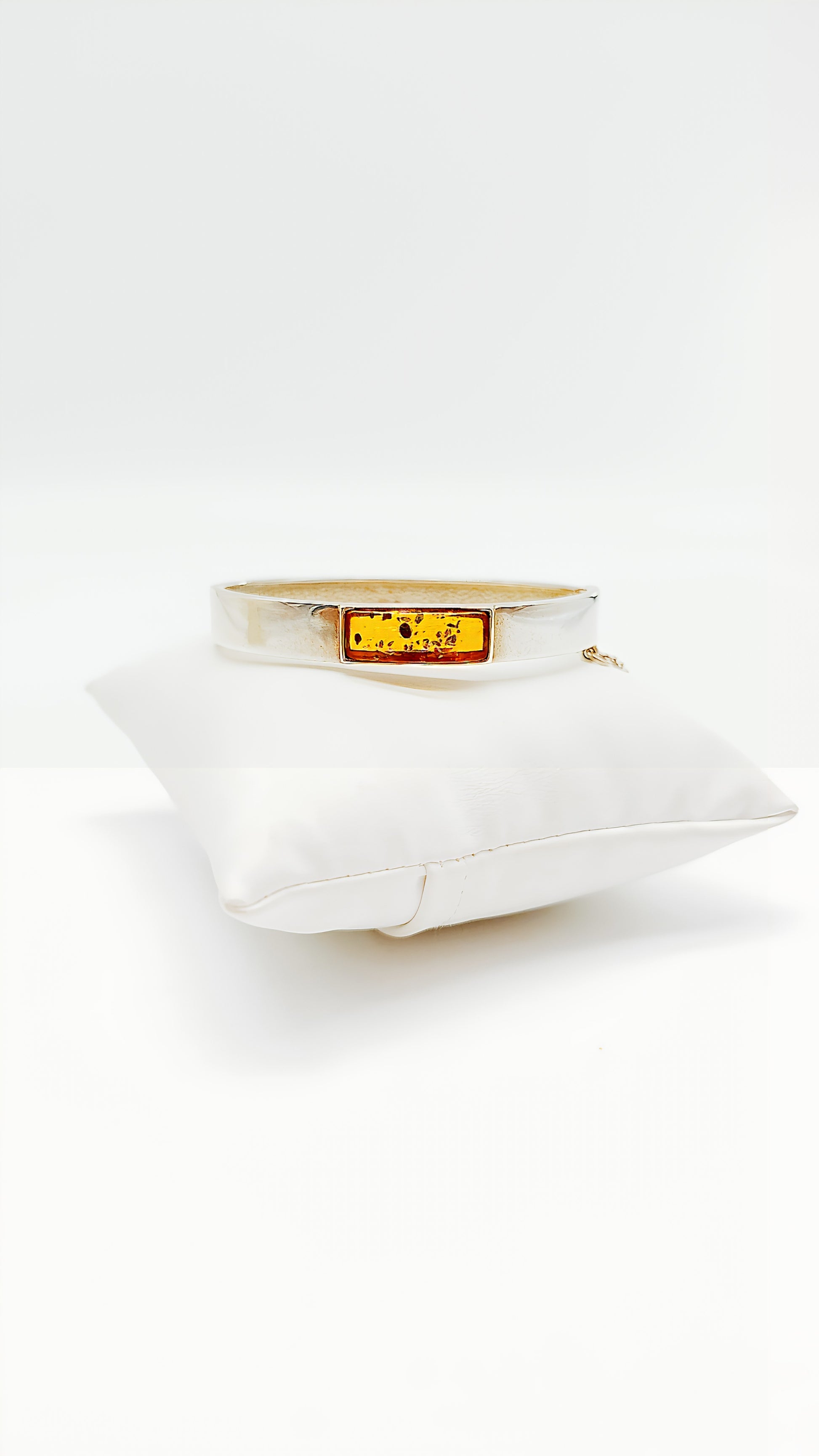 This 925 sterling silver bangle combines classic design with a touch of natural elegance. The rectangular yellow amber in the center lends the piece a warm and captivating radiance. The smooth silver setting accentuates the sparkling stone, making it the centerpiece. An ideal accessory for those who appreciate subtle yet striking jewelry. This bangle is perfect for both elegant occasions and casual outfits, making every wrist a focal point.
