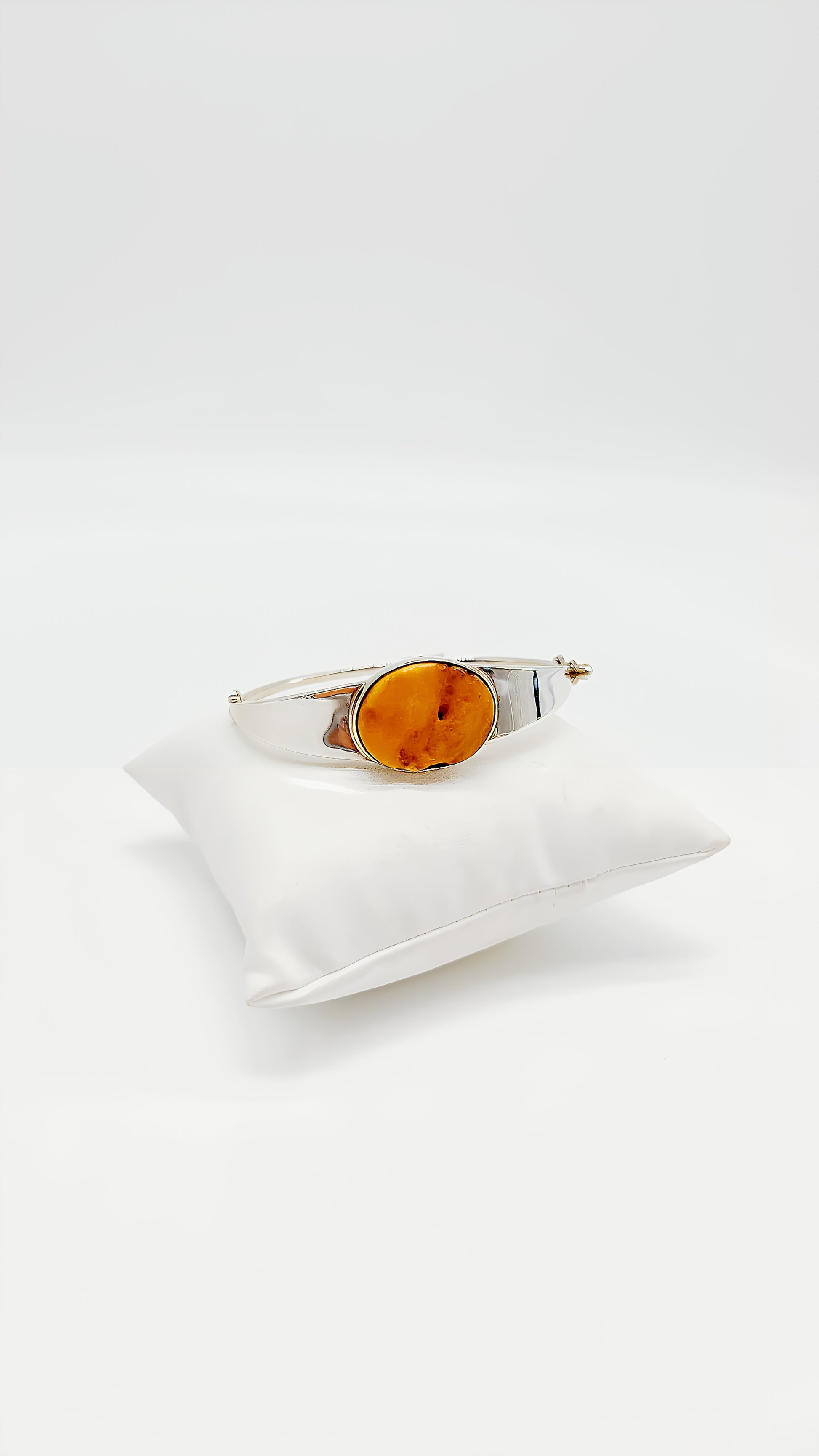This handcrafted 925 sterling silver bangle combines simple elegance with the natural warmth of amber. The large, golden stone in an oval setting perfectly showcases the unique structure of the amber and blends harmoniously with the clean design of the silver bangle. A piece of jewelry that can be worn for special occasions as well as everyday—timeless, stylish, and always an eye-catcher.