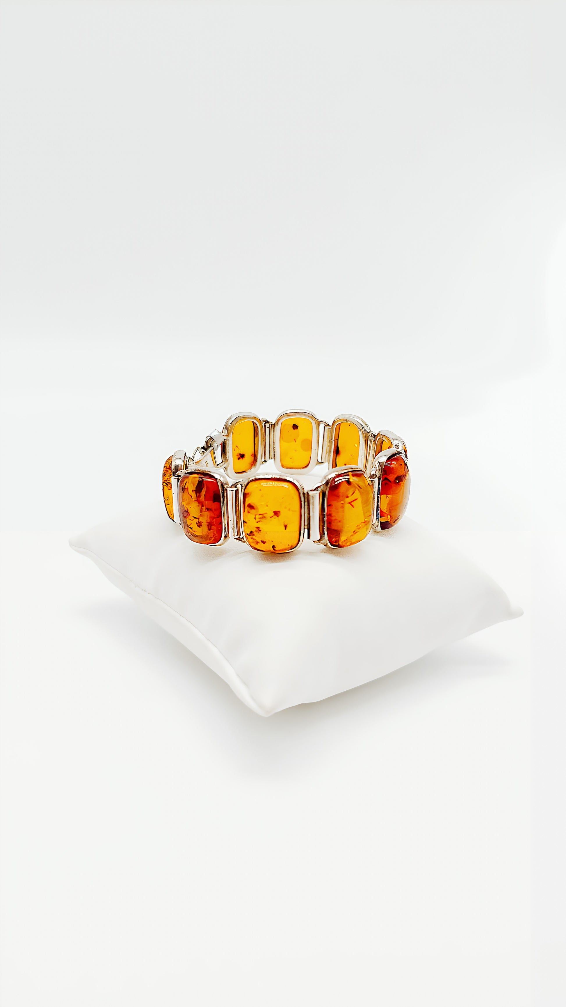 The polished amber stones are artfully set in a high-quality silver setting, perfectly highlighting the warm glow of the amber. This unique piece is ideal for anyone who loves unique jewelry and values natural materials.