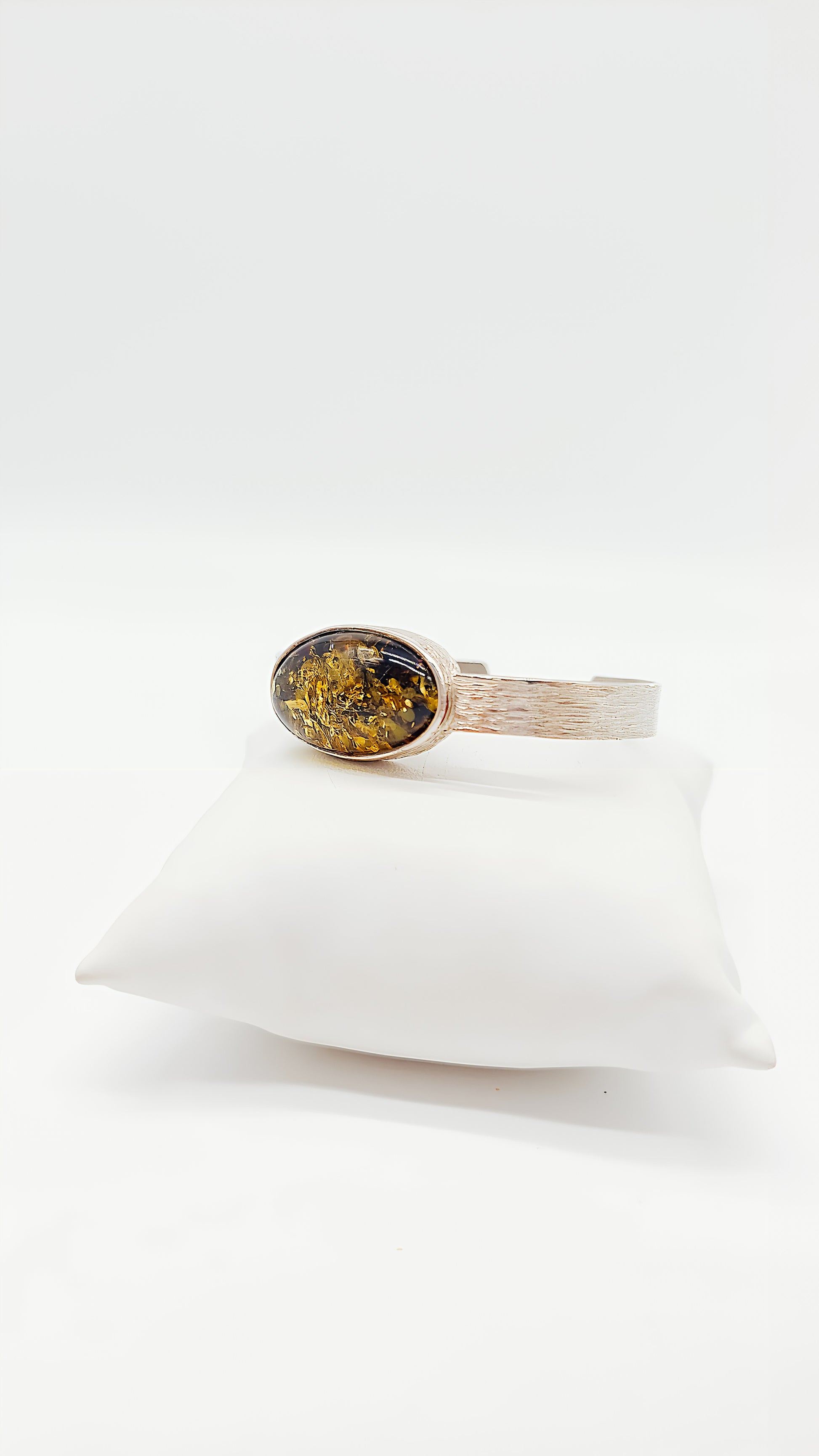 This bangle, crafted from 925 sterling silver and shimmering amber, is a true masterpiece of craftsmanship. The large, oval amber stone, set in a delicate silver setting, lends this bangle a distinctive radiance. The silver structure provides an elegant contrast to the natural beauty of the amber, which shimmers in warm tones in every light. Whether as a highlight for a special occasion or as a stylish everyday accessory, this bangle perfectly combines luxurious materials and timeless design.