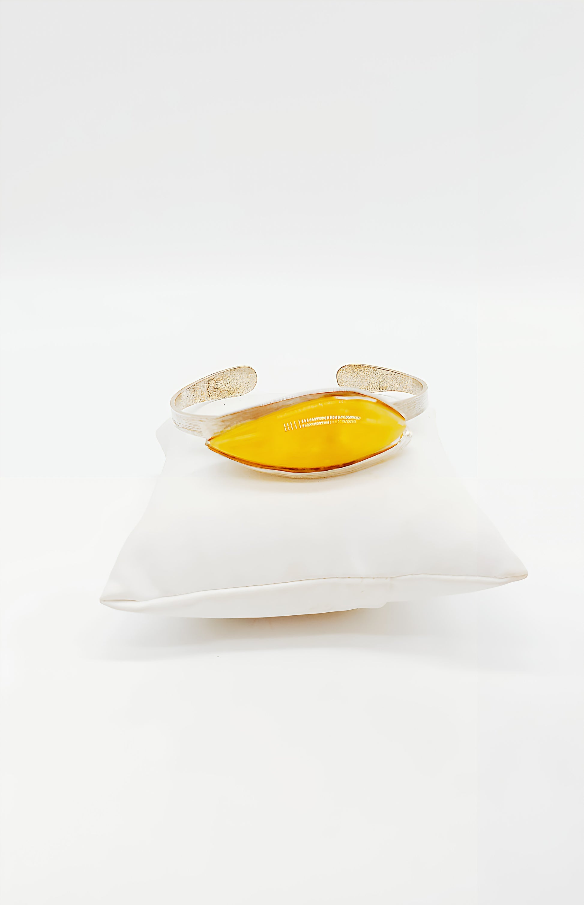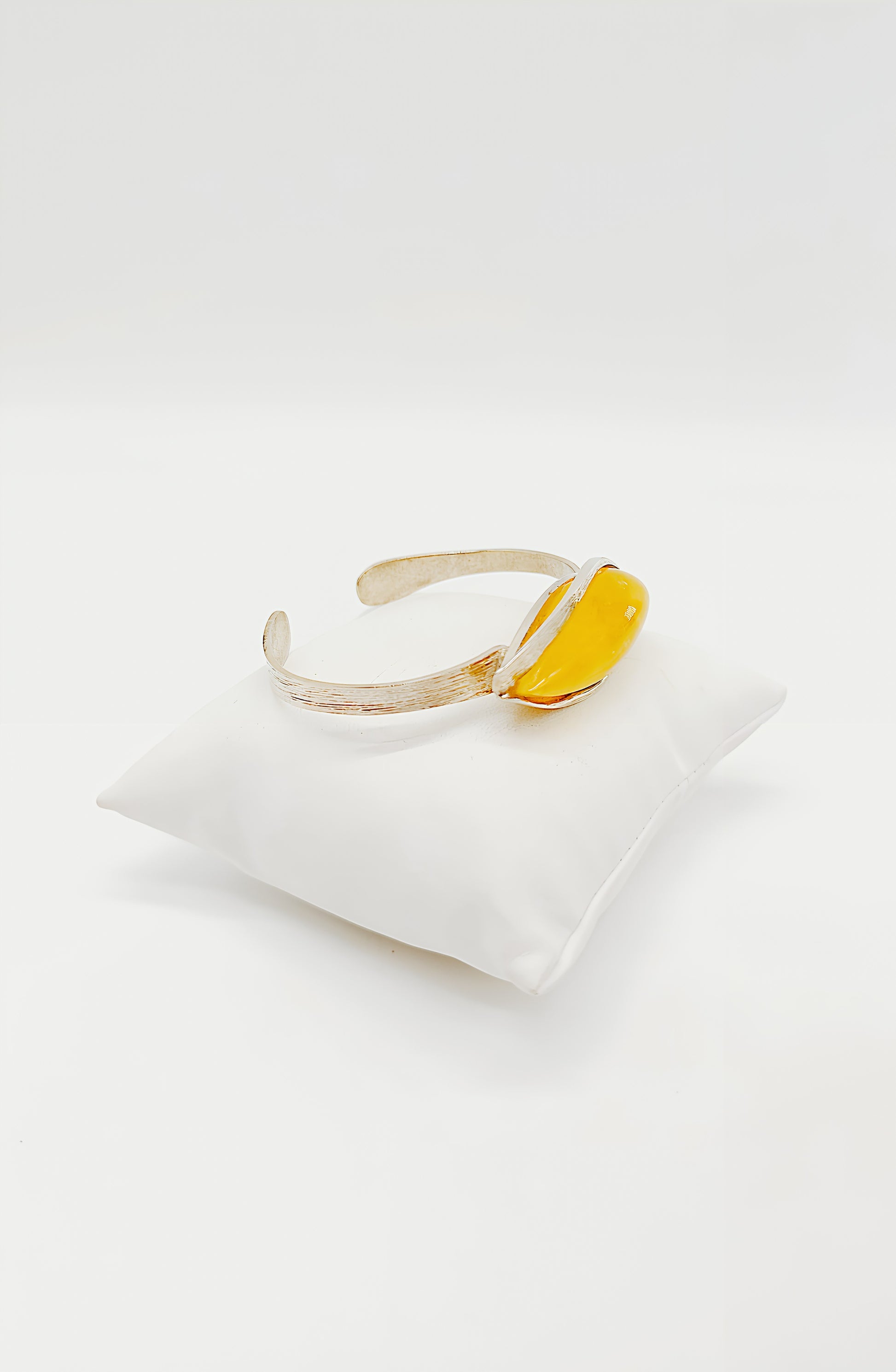 This 925 sterling silver bangle, crowned with a lustrous golden amber, is a true work of art. The warm, honey-colored amber radiates in a light drop design, stylishly framed by a textured silver setting. The blend of the natural beauty of the amber and the cool shimmer of the silver gives the bangle a luxurious yet simple elegance. Perfect for special occasions or to add that special something to your everyday look. A piece of jewelry that tells a story and exudes modern class.