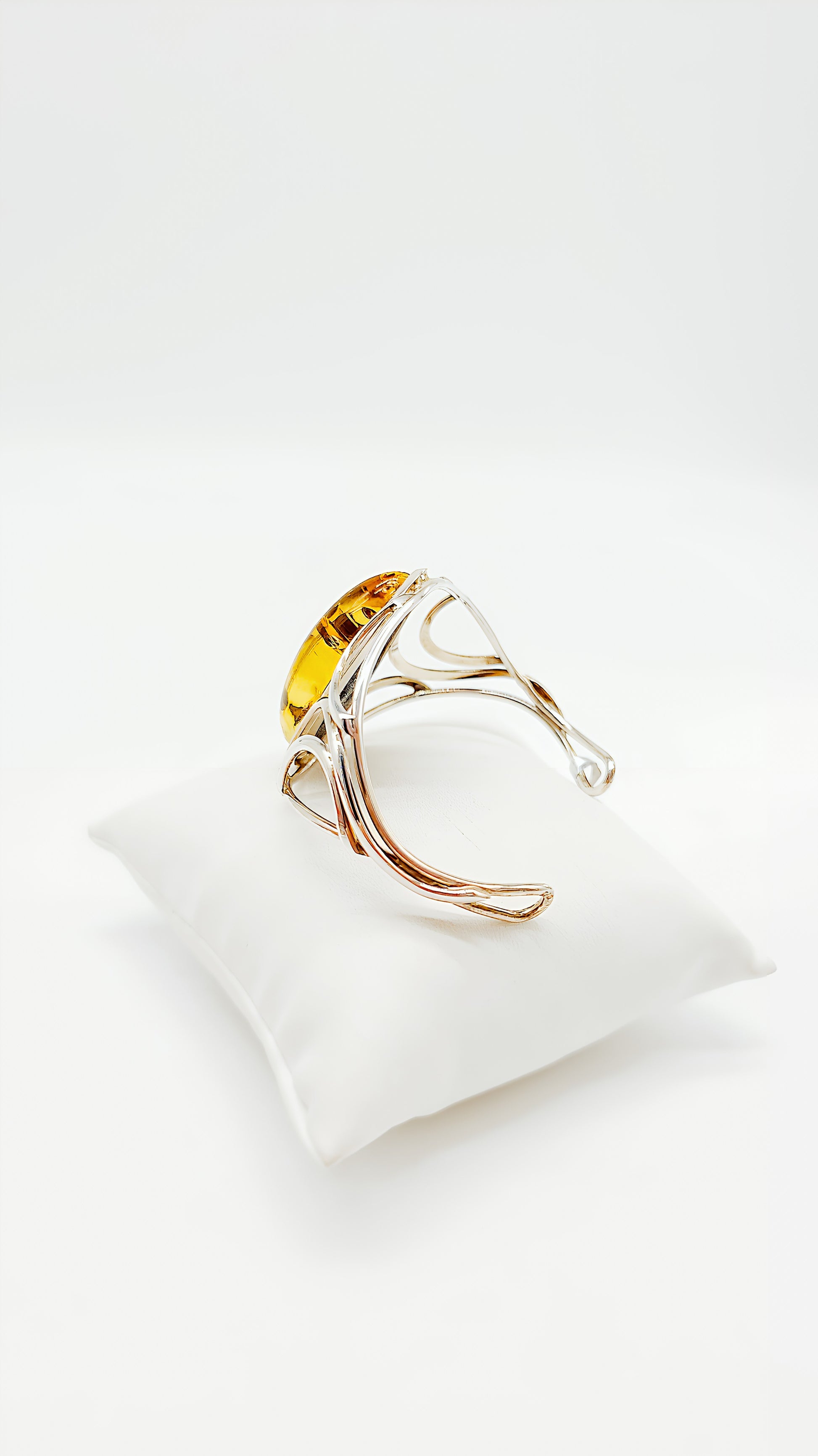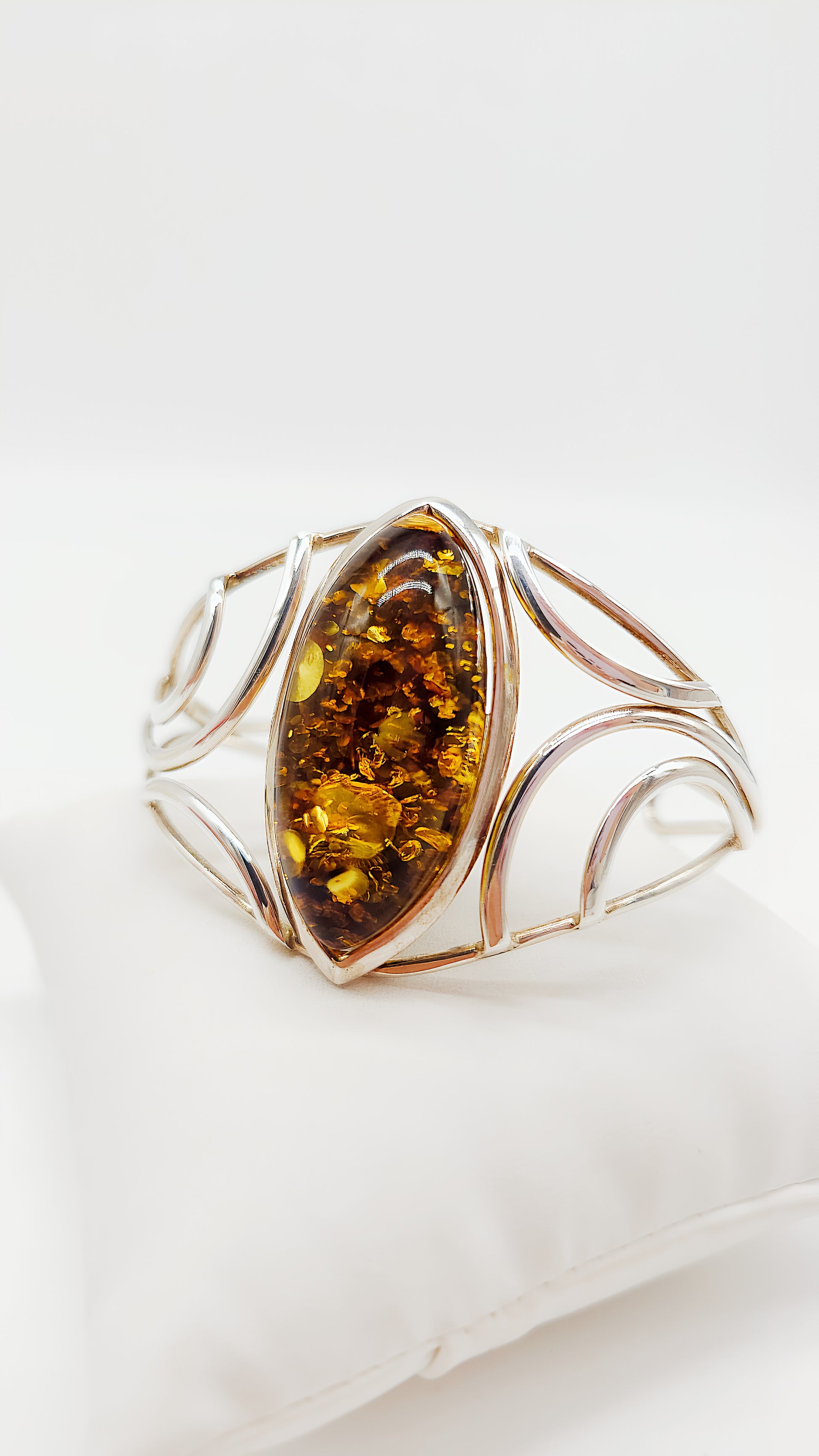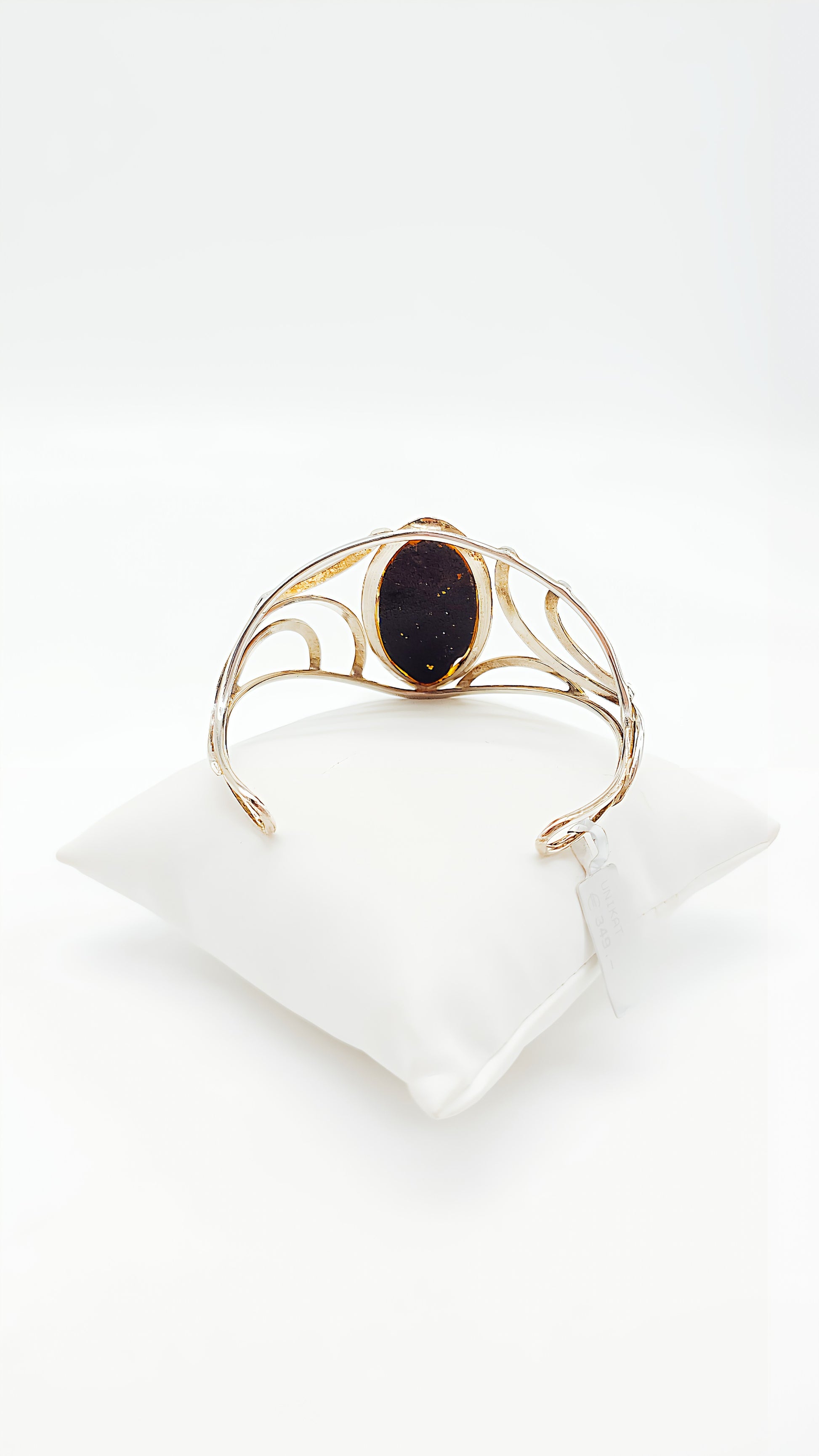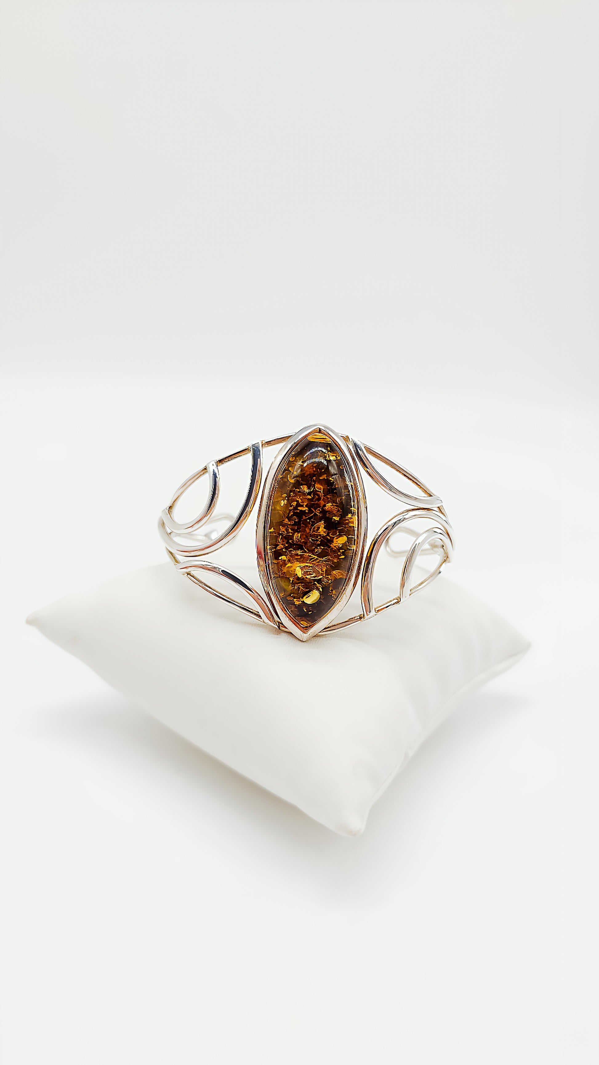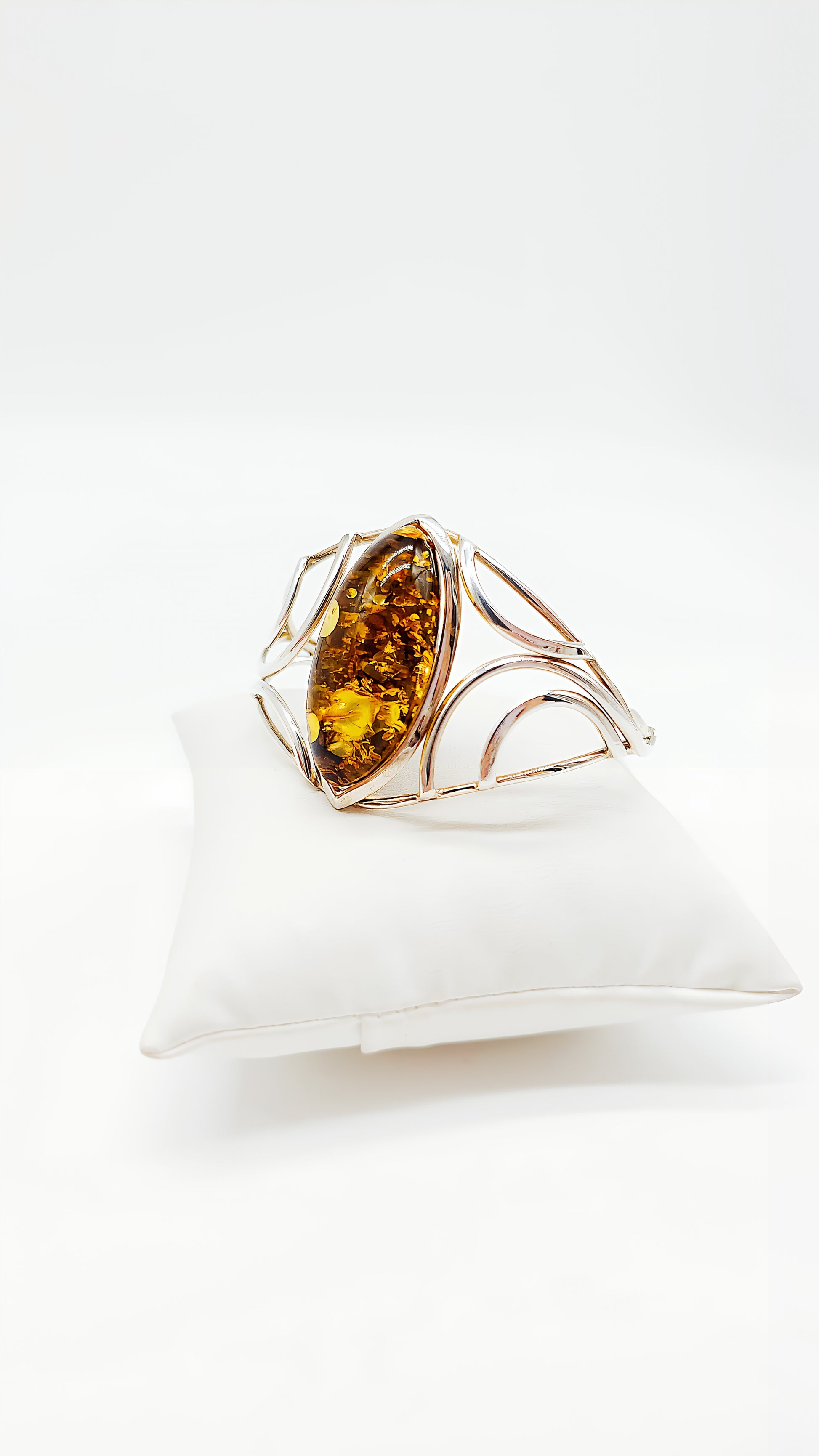 This artistic 925 sterling silver bangle captivates with its narrow, elongated amber stone held within an elegant, delicate silver frame. The amber shimmers in warm, golden-brown tones and perfectly captures the light. The silver lines give the piece a delicate, almost organic shape, reminiscent of the beauty of nature. This bangle is ideal for lovers of sophisticated, timeless jewelry that enhances any look.