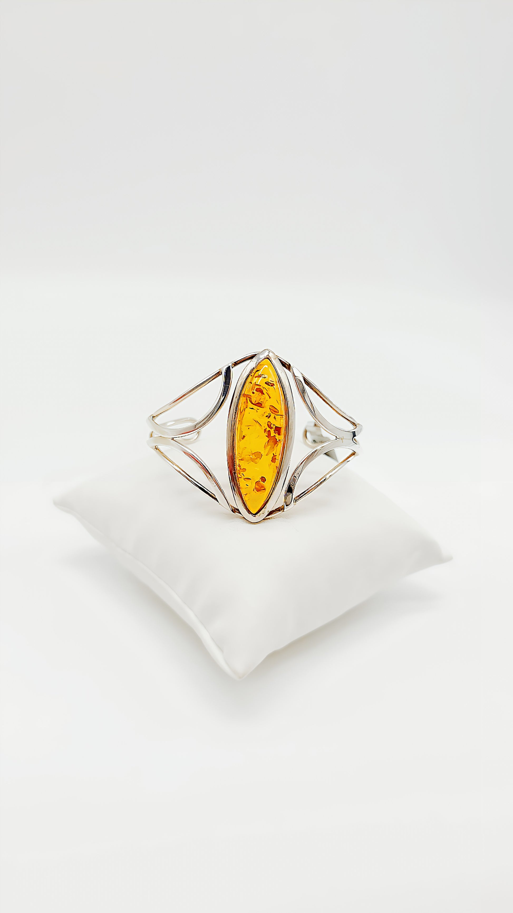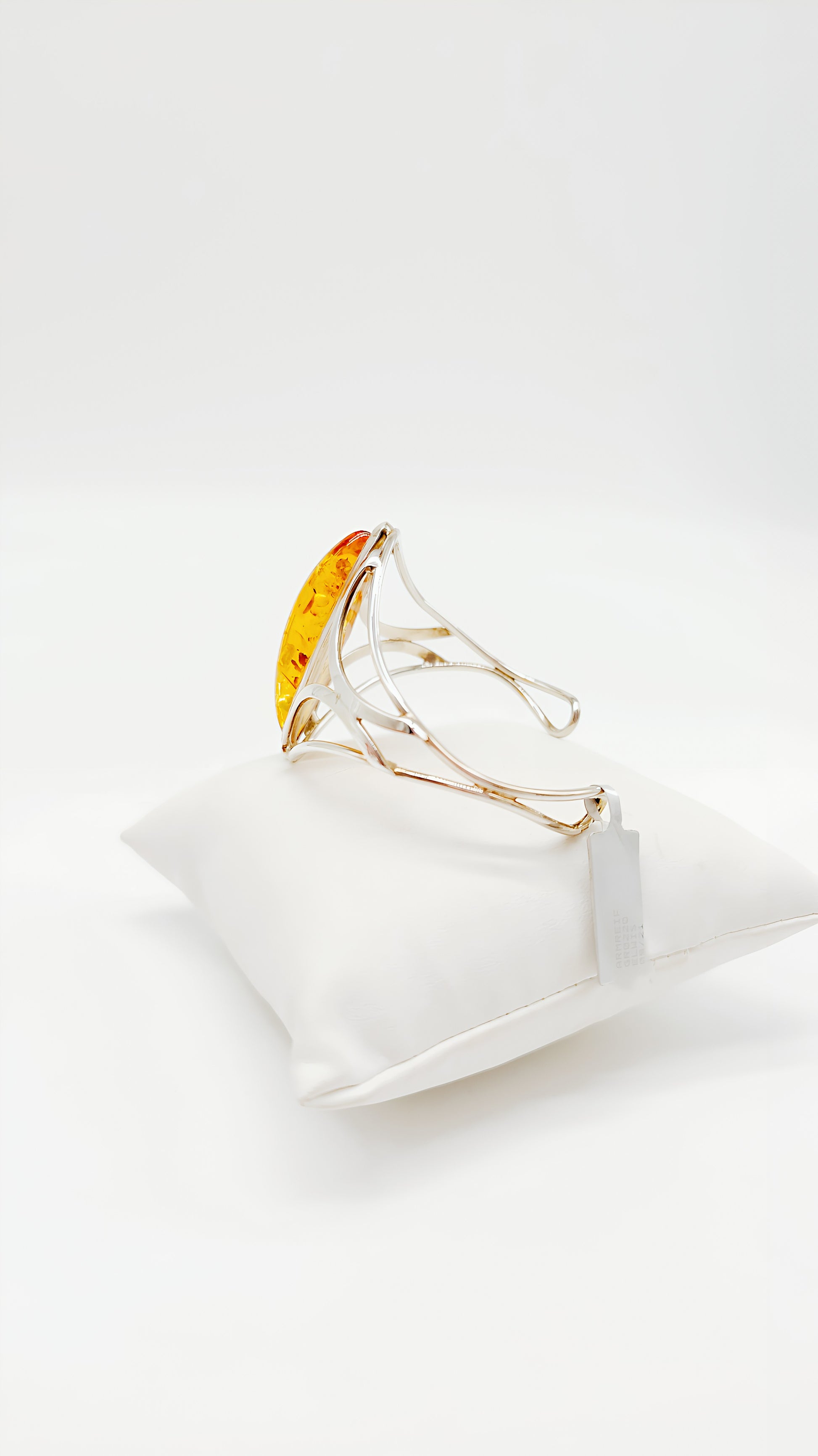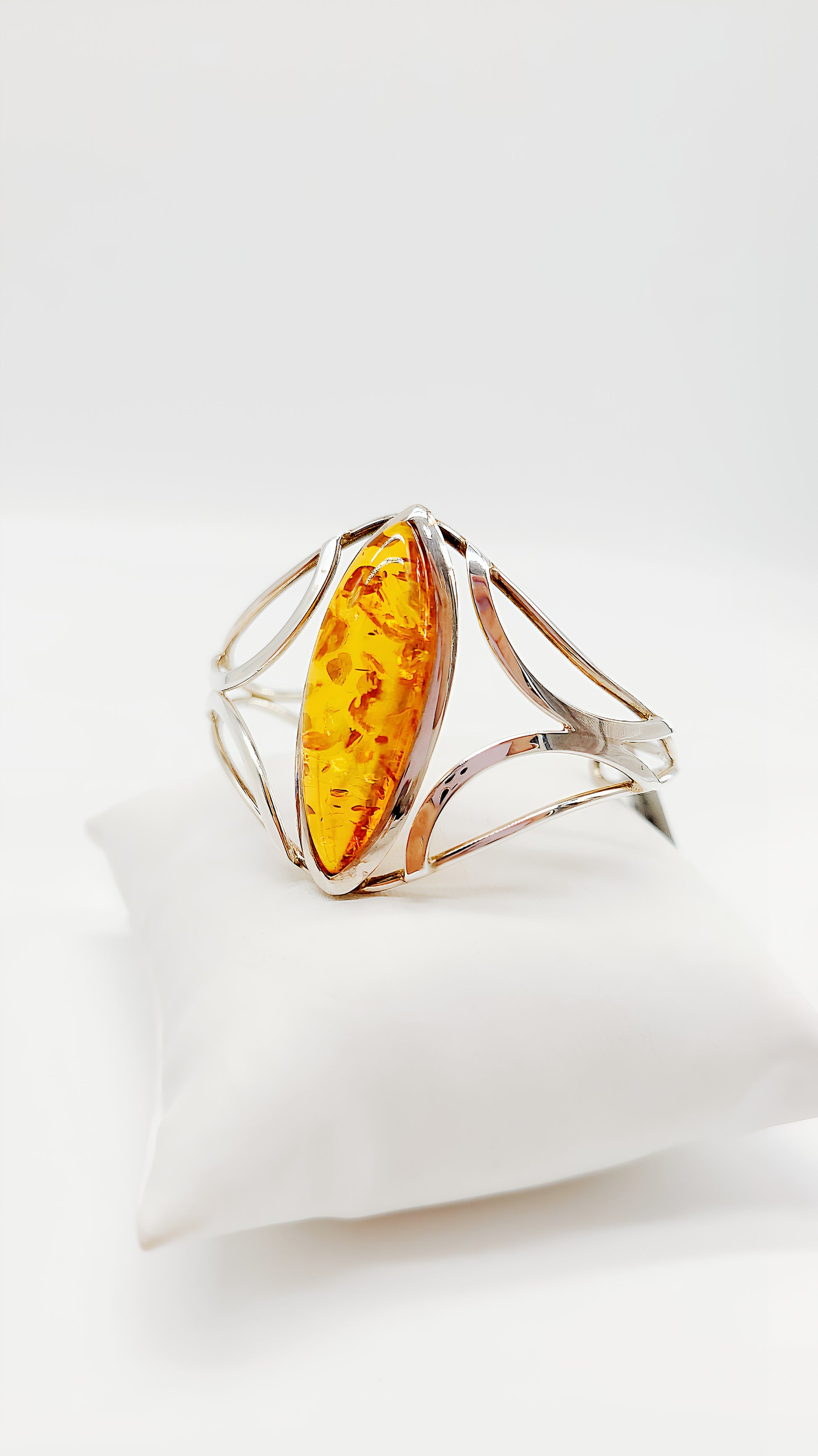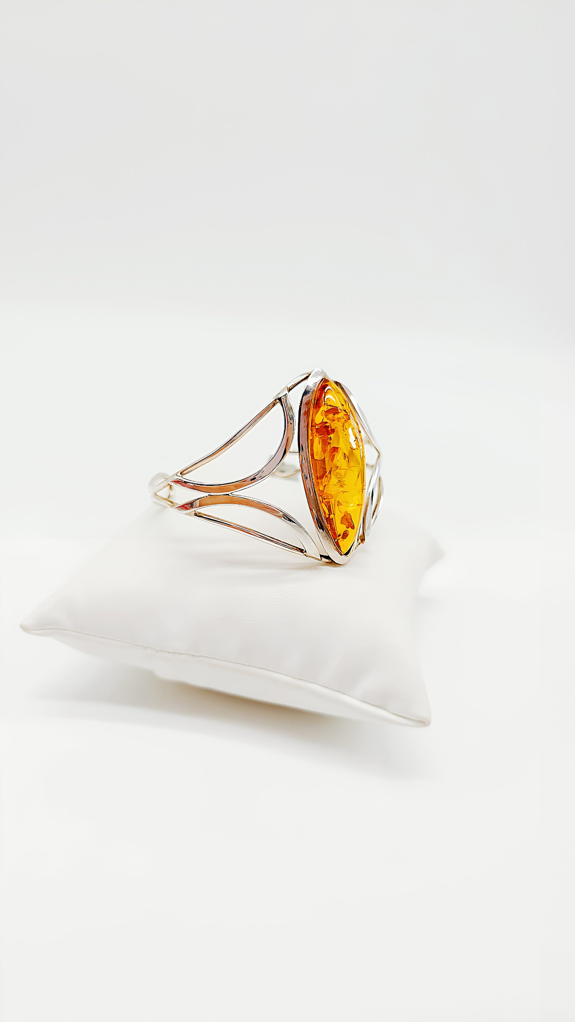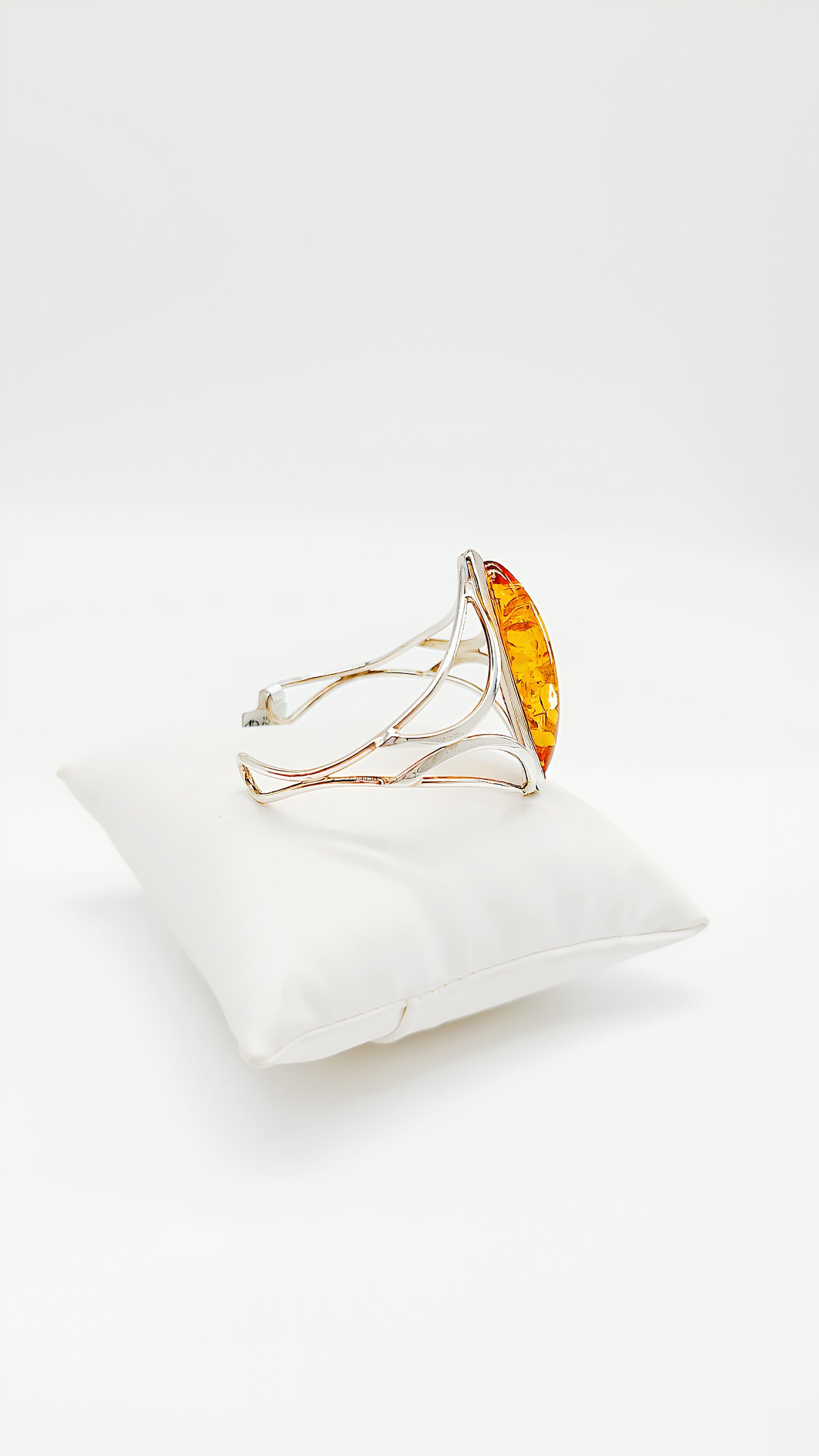 This elegant amber bangle for women combines luxurious design with the natural beauty of genuine amber. The vibrant orange natural stone is artfully integrated into a delicate silver setting, perfectly highlighting its radiant color intensity.