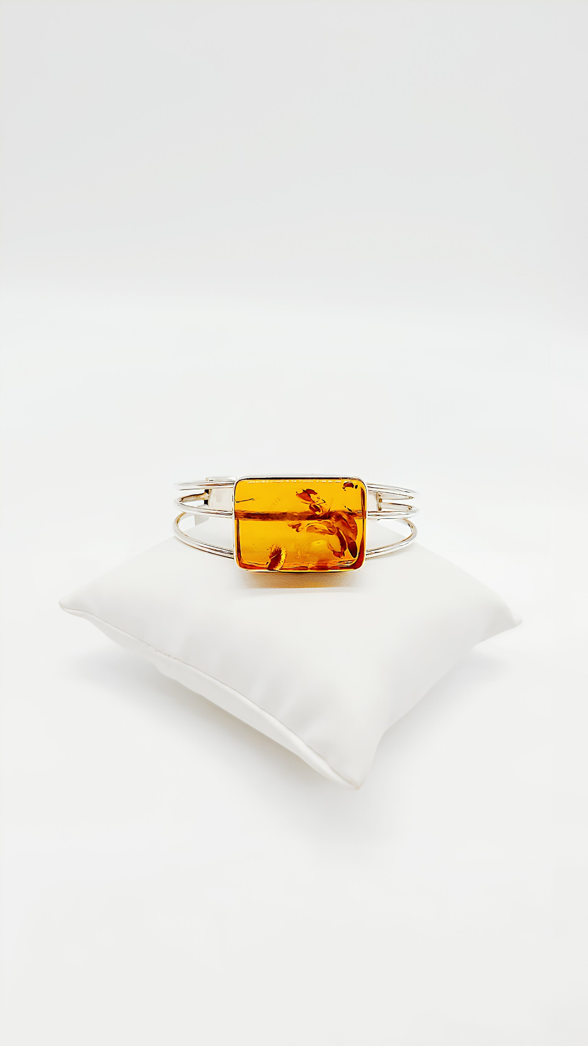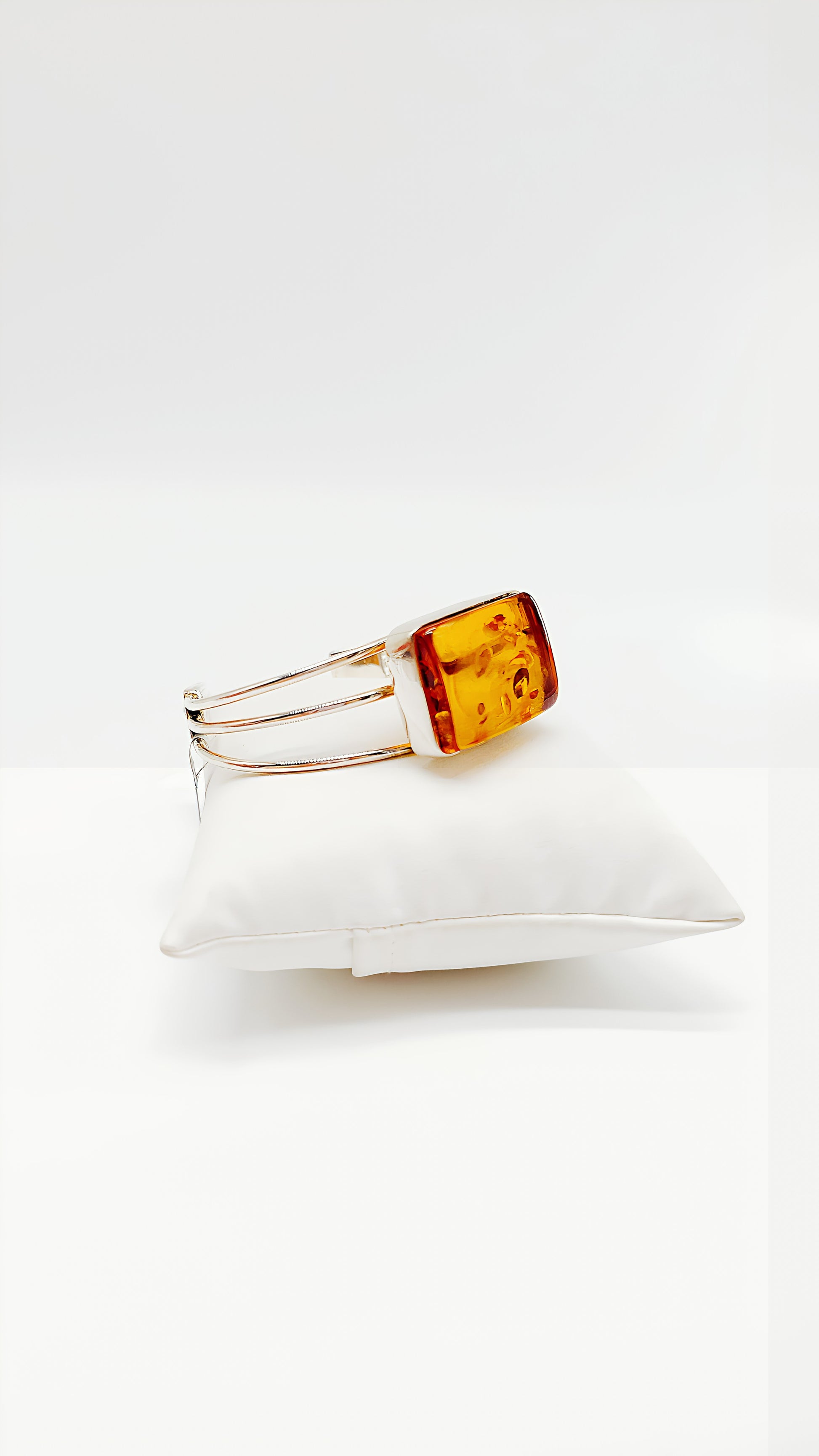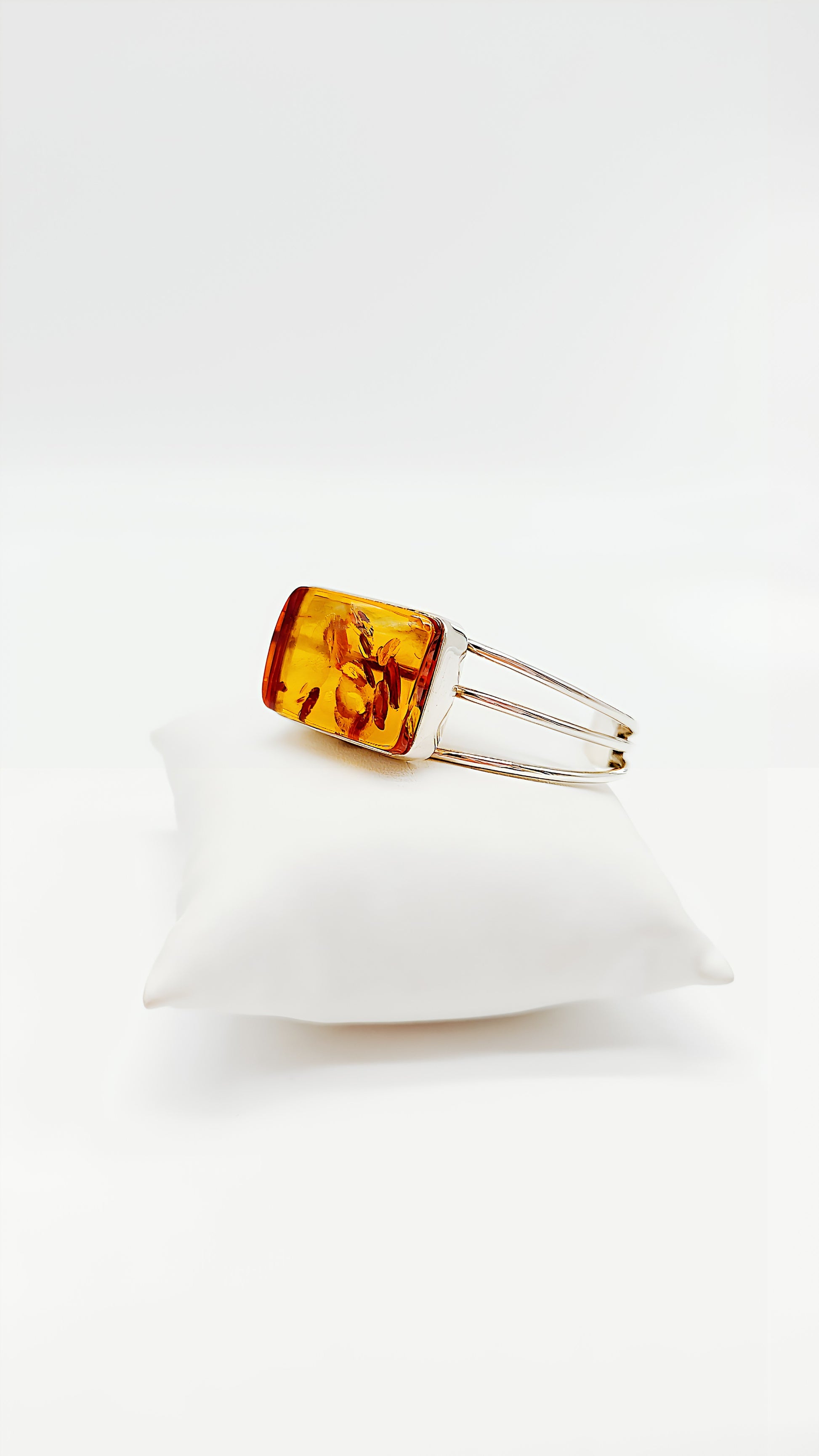 This elegant 925 sterling silver bangle features a rectangular, golden-yellow amber set in a modern silver frame. The amber shimmers in warm tones and catches the light in a captivating way. The clean lines of the design lend the piece a simple elegance that's ideal for everyday wear and special occasions. Perfect for those who love geometric shapes and classic materials.