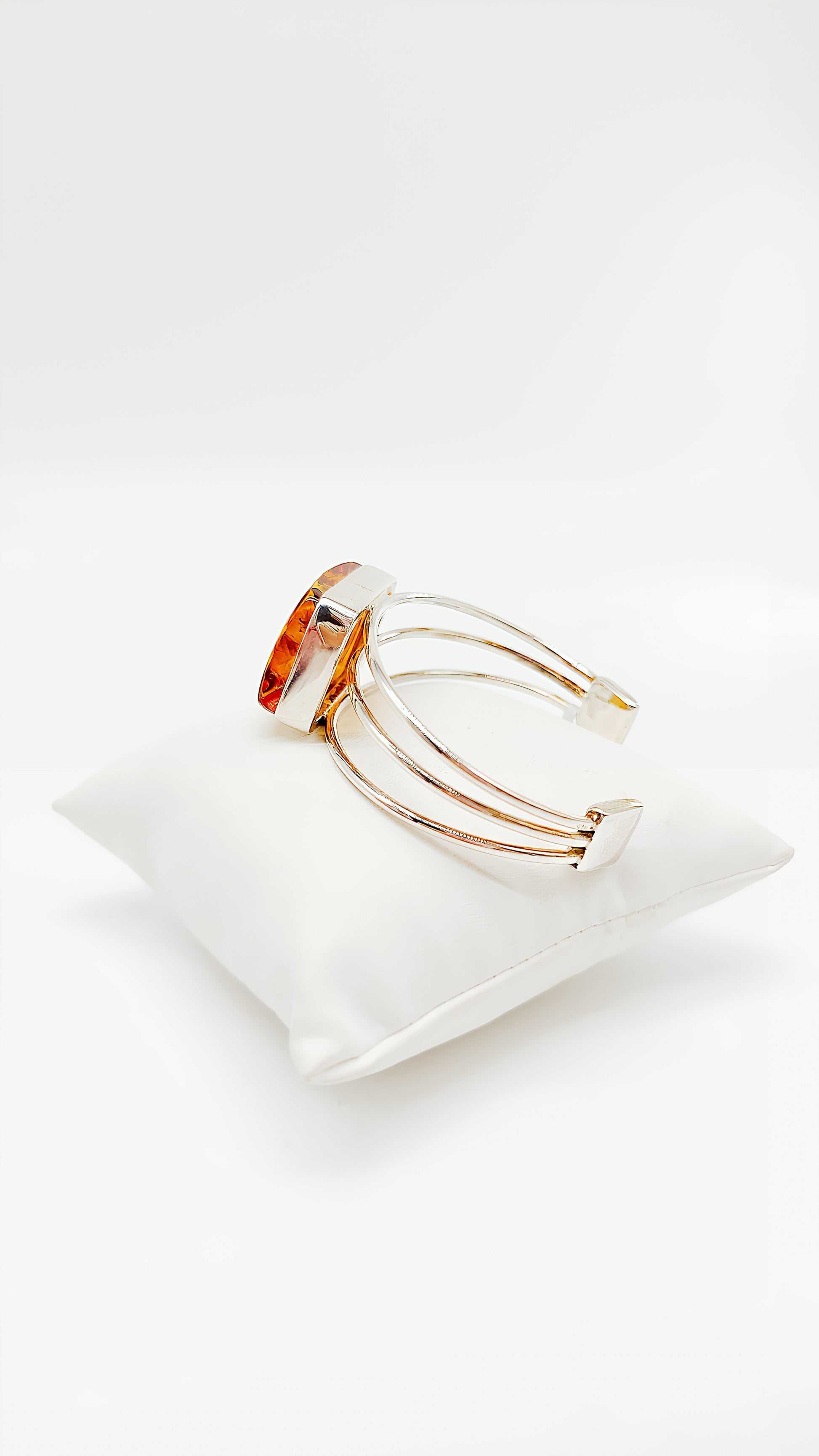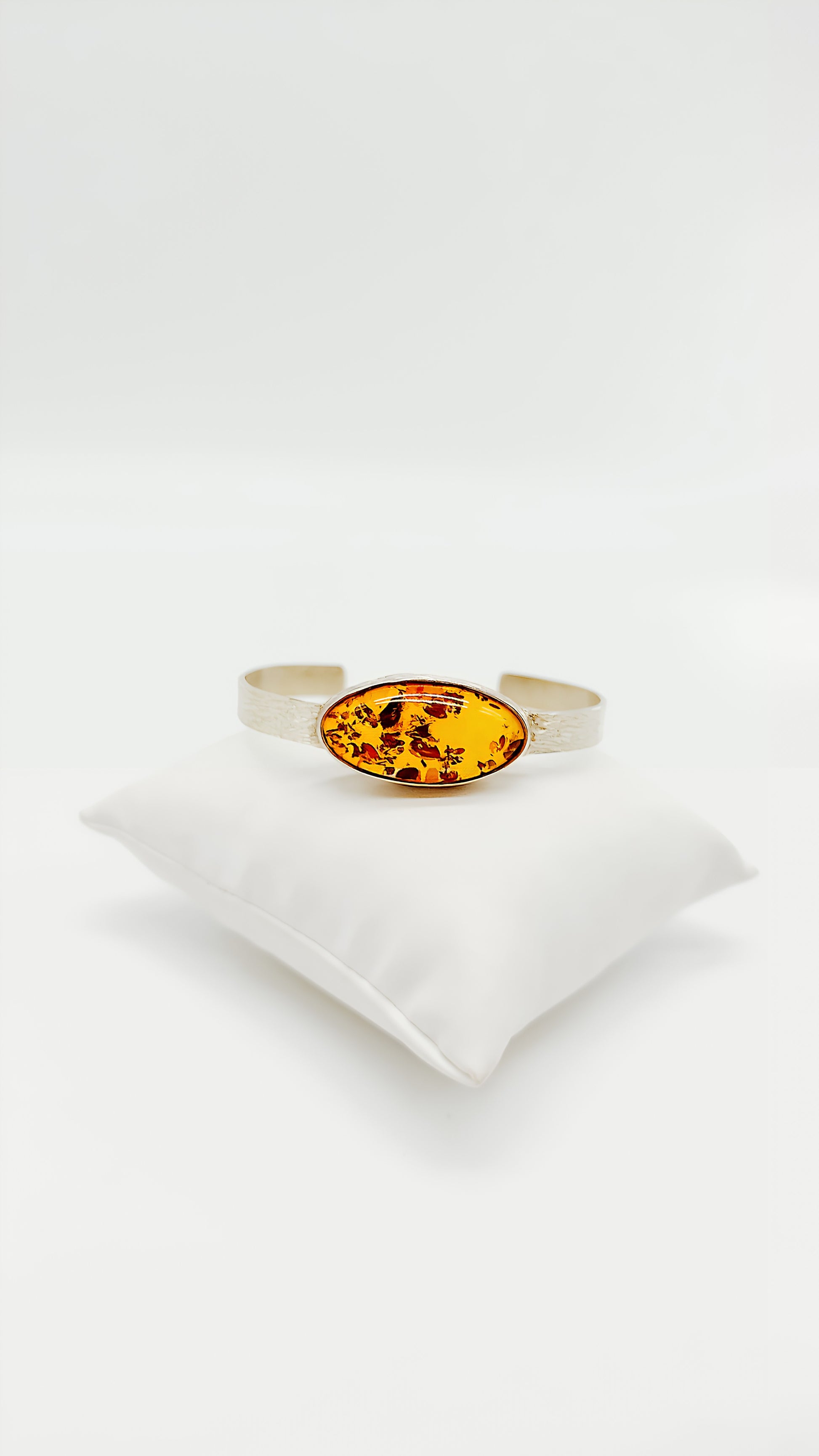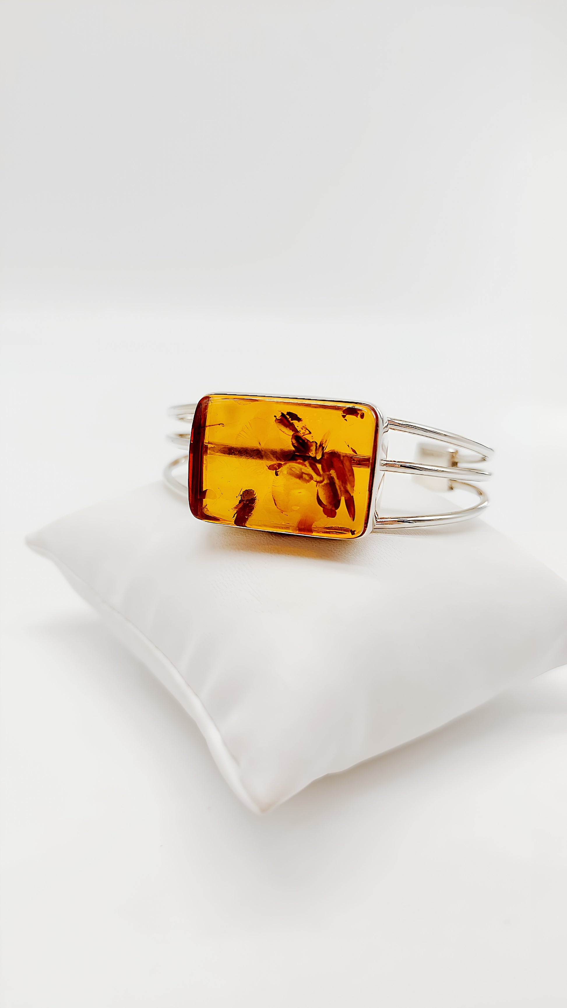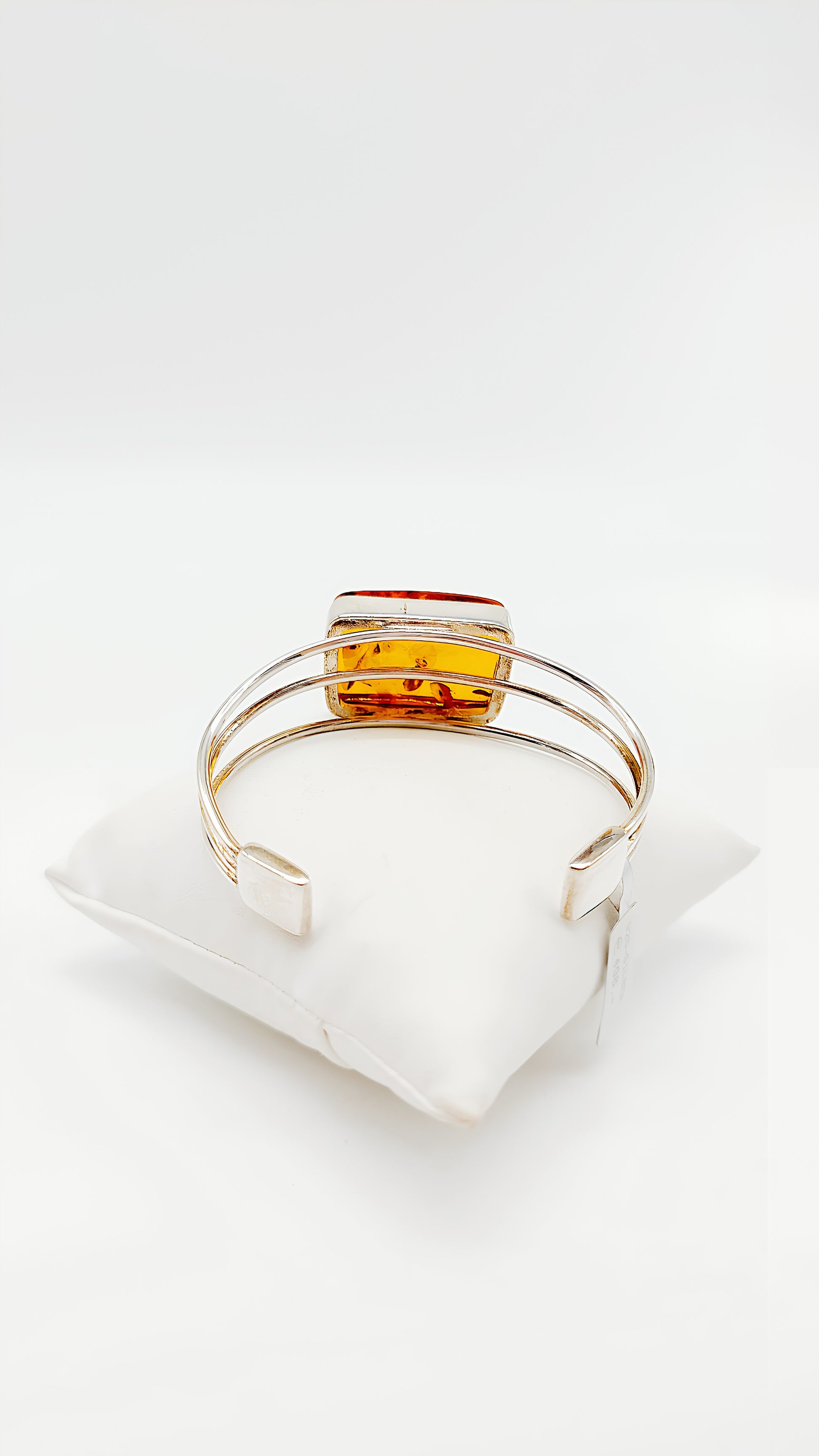 This elegant 925 sterling silver bangle features a rectangular, golden-yellow amber set in a modern silver frame. The amber shimmers in warm tones and catches the light in a captivating way. The clean lines of the design lend the piece a simple elegance that's ideal for everyday wear and special occasions. Perfect for those who love geometric shapes and classic materials.