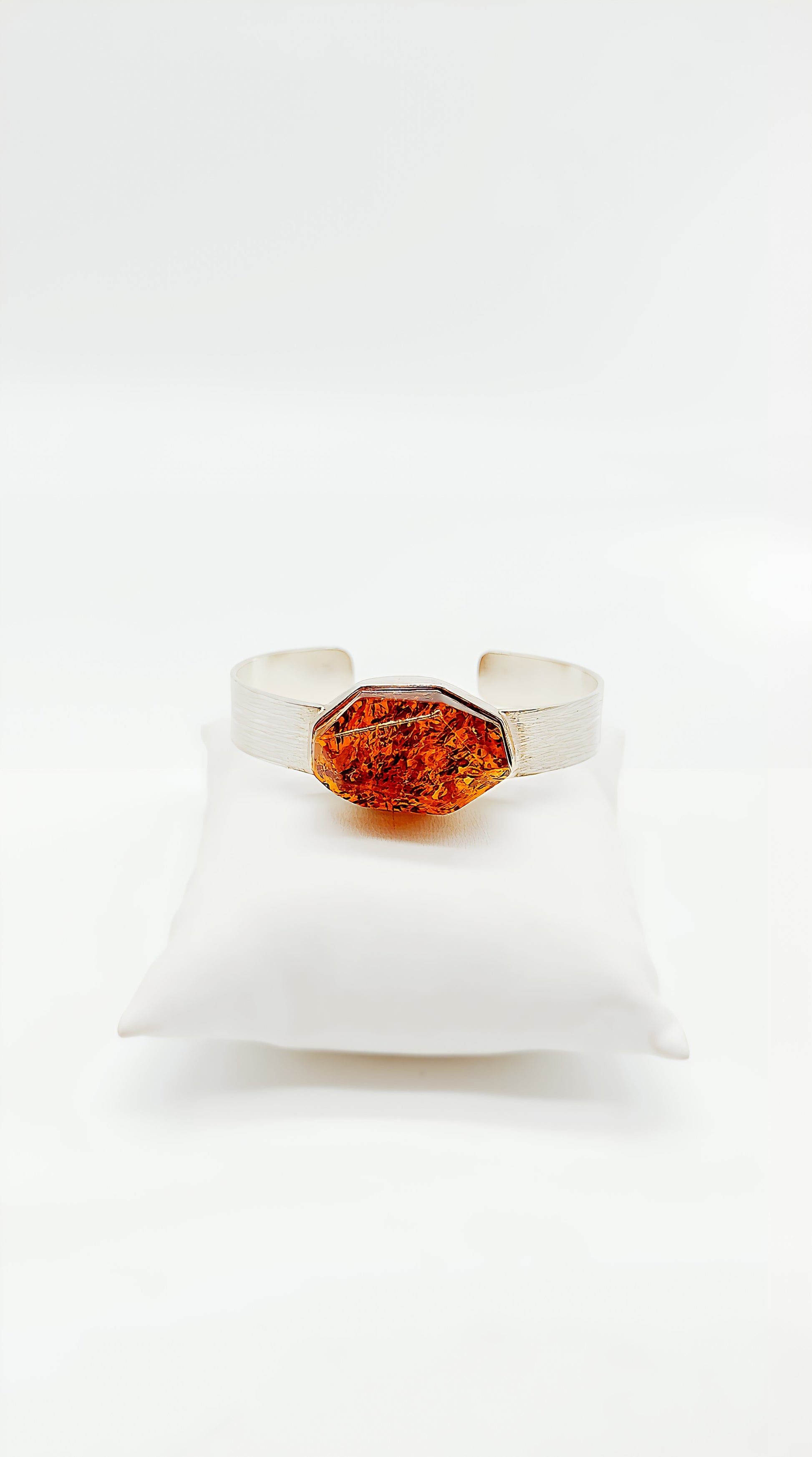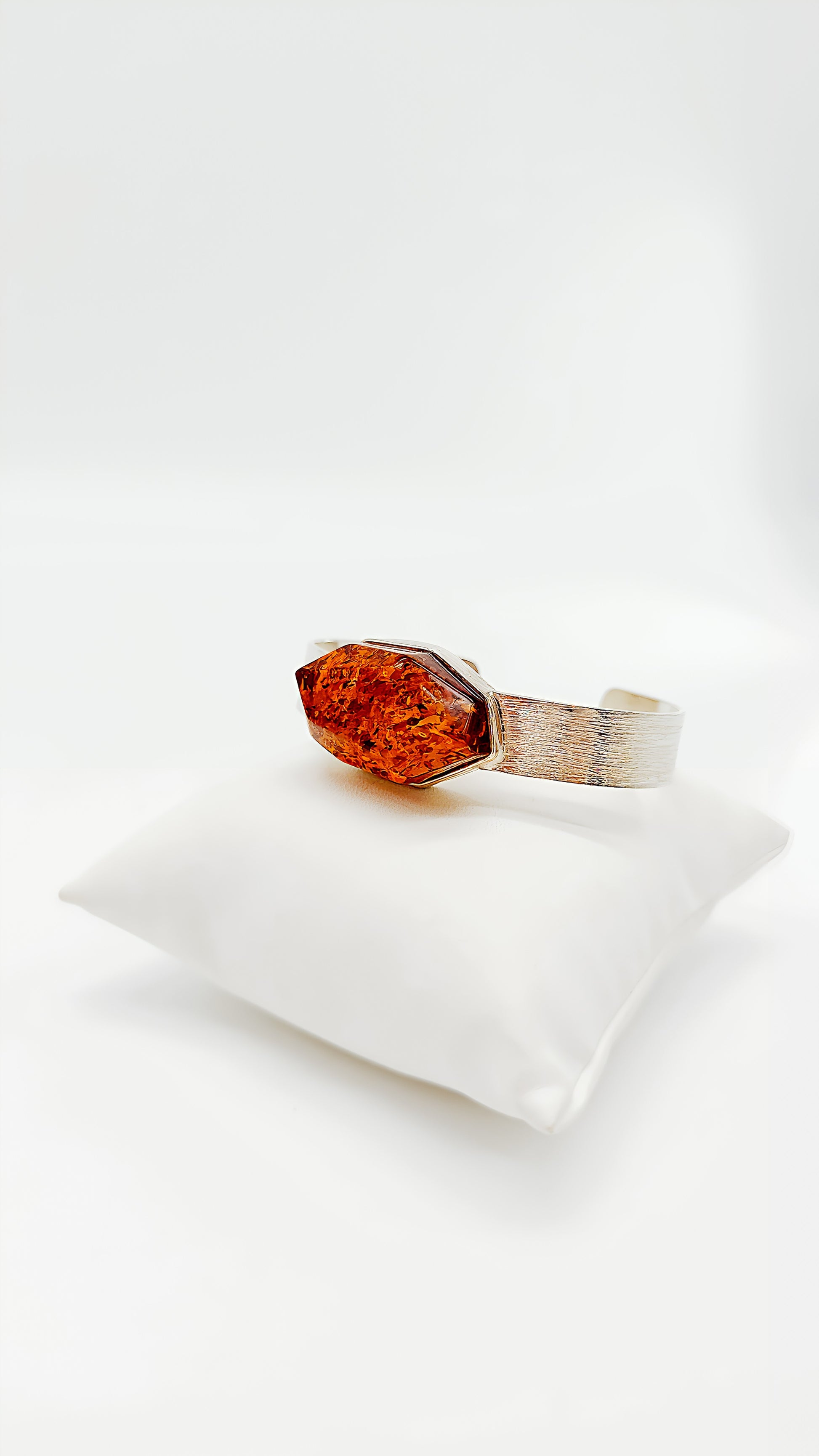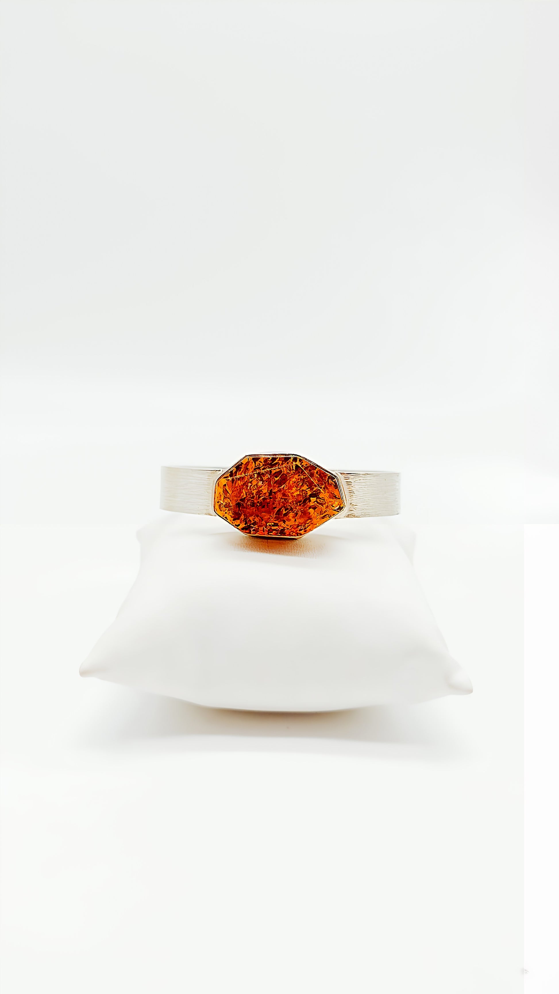 This artistic 925 sterling silver bangle captivates with its faceted amber set in a striking silver frame. The amber shimmers in warm orange tones, and its faceted shape lends it a special depth and sophistication. The minimalist, geometric design of the bangle perfectly showcases the stone, making this piece a sophisticated accessory for any occasion. A must-have for lovers of handmade and luxurious jewelry.