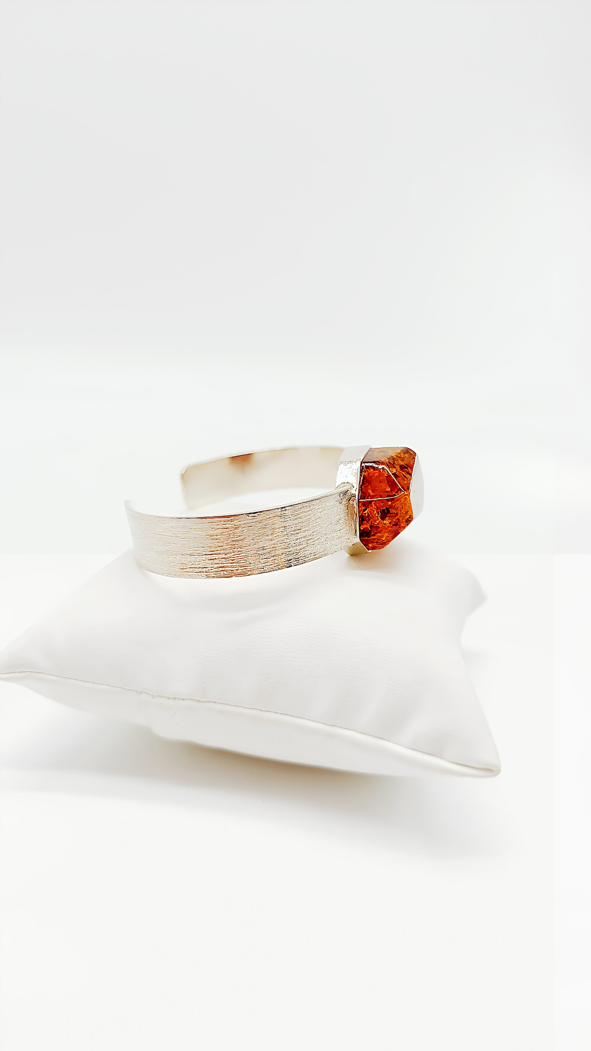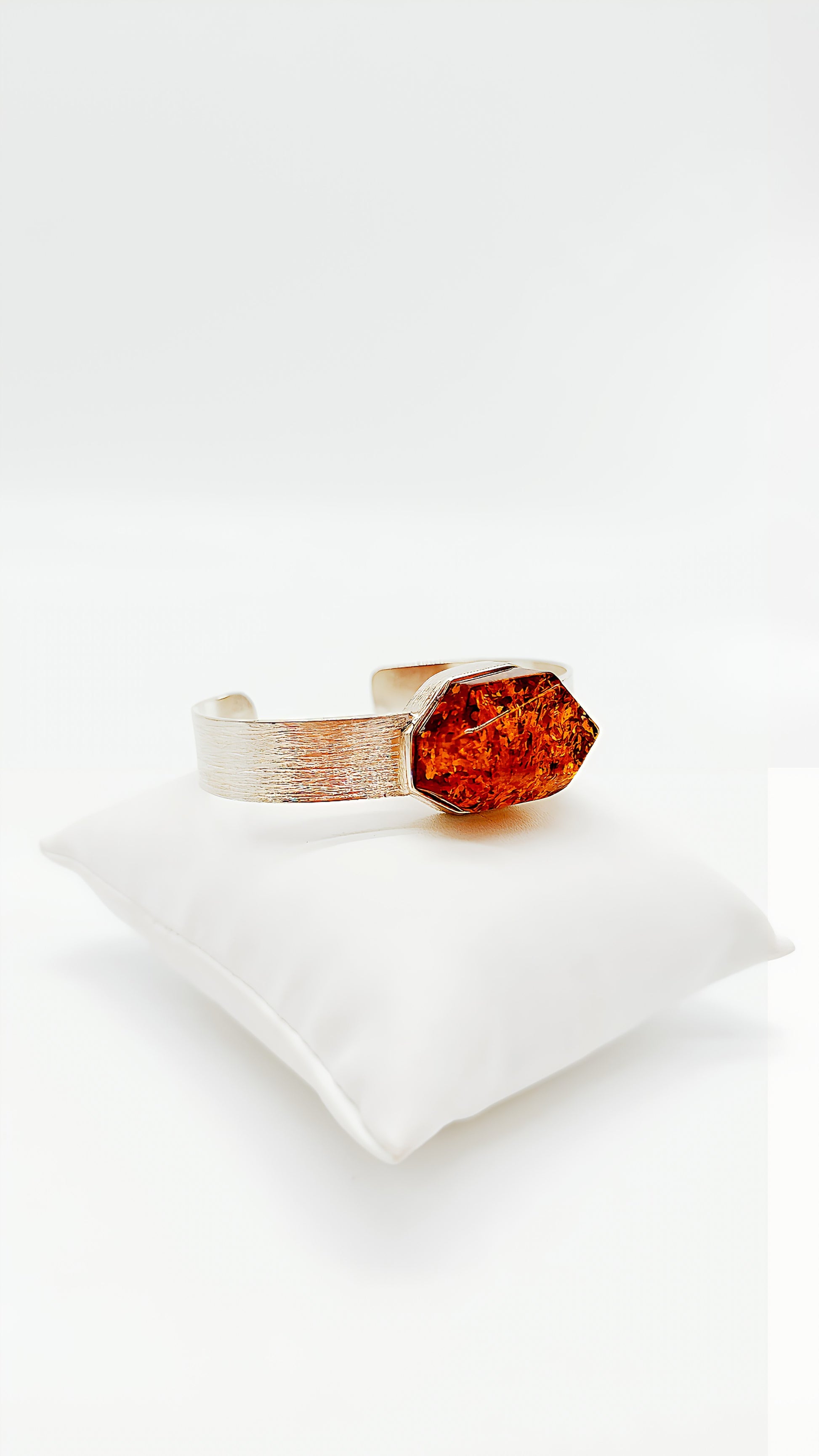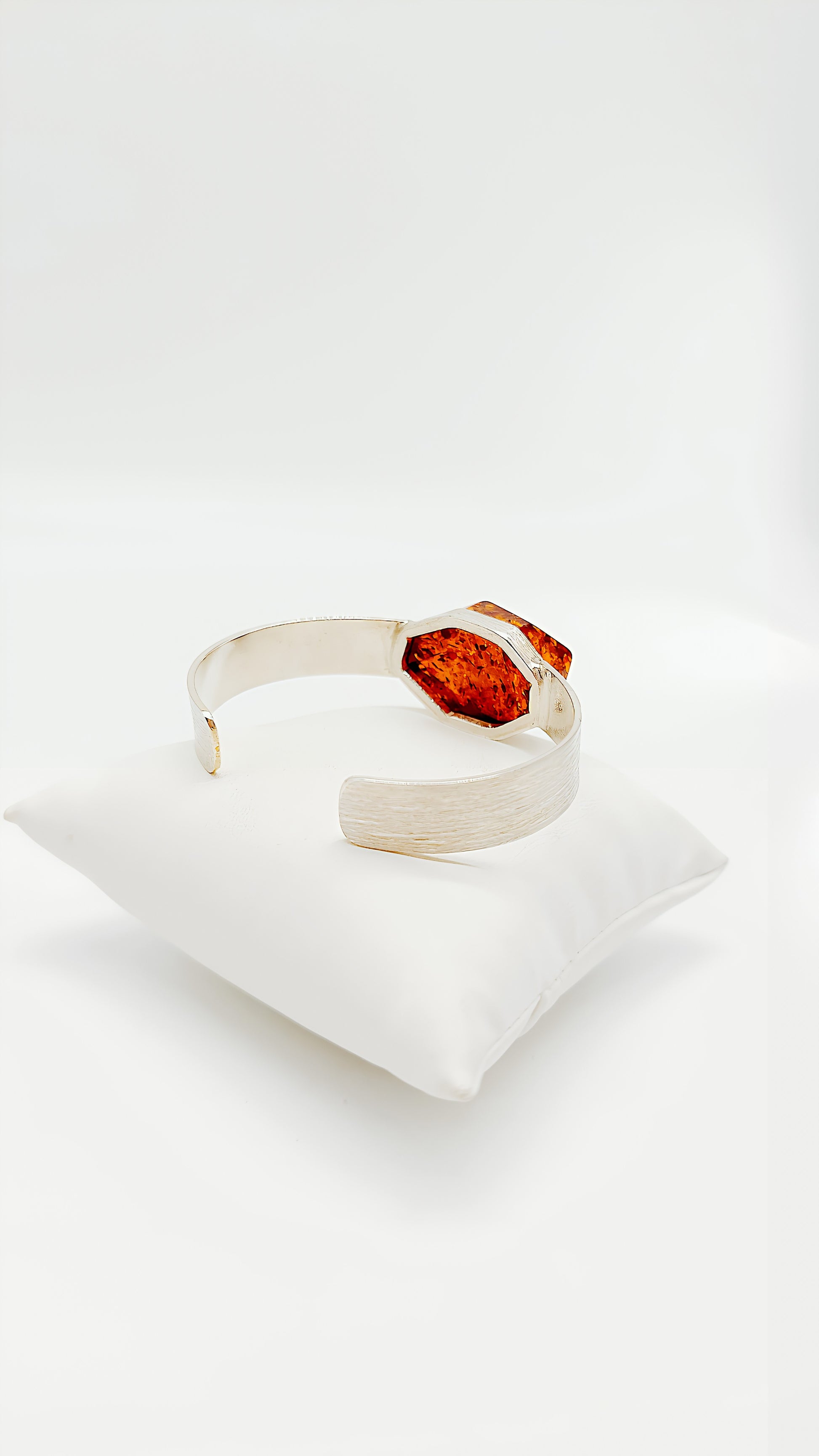 This artistic 925 sterling silver bangle captivates with its faceted amber set in a striking silver frame. The amber shimmers in warm orange tones, and its faceted shape lends it a special depth and sophistication. The minimalist, geometric design of the bangle perfectly showcases the stone, making this piece a sophisticated accessory for any occasion. A must-have for lovers of handmade and luxurious jewelry.