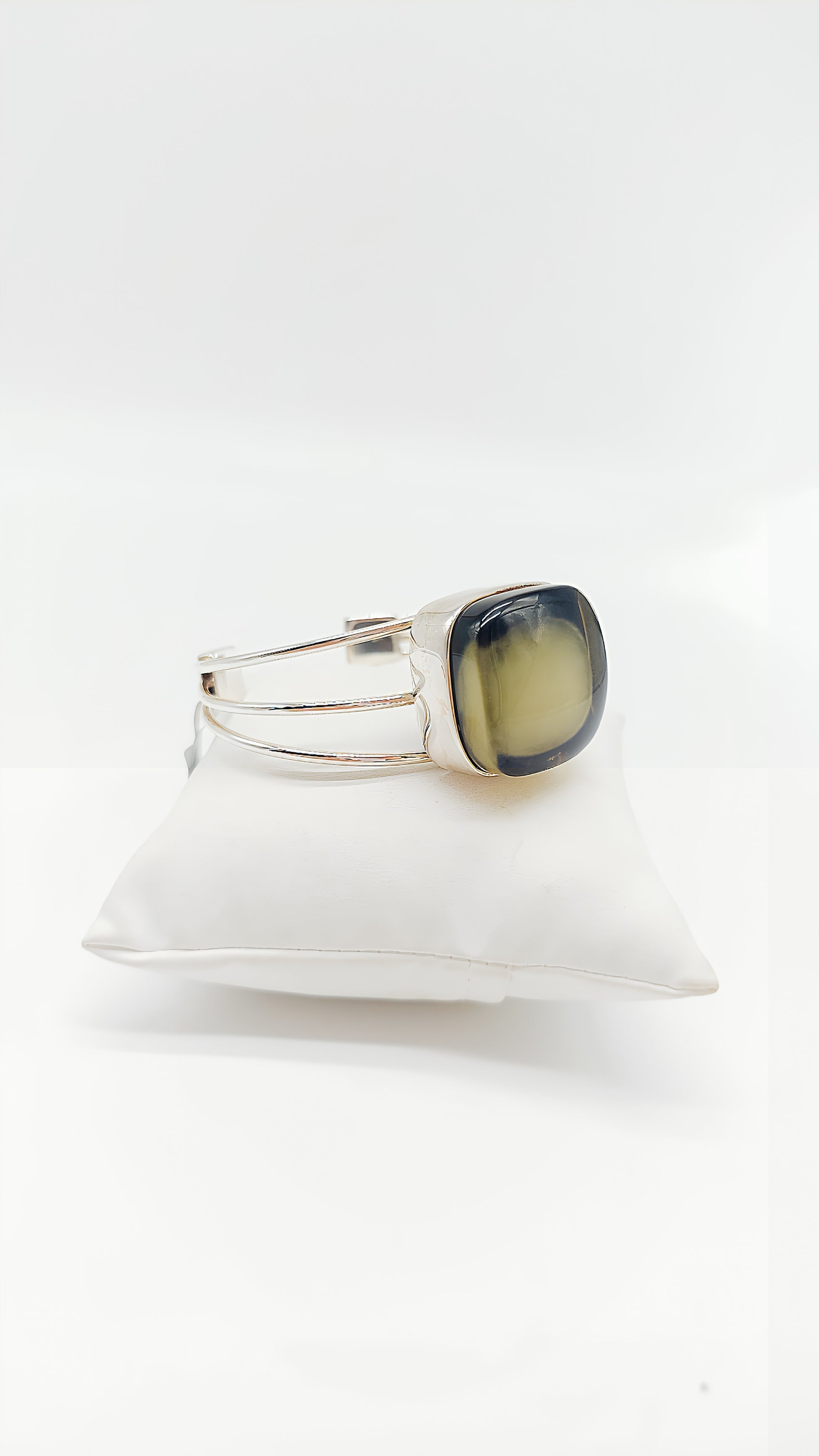 This stylish 925 sterling silver bangle features a square green amber set in a modern silver frame. The amber shimmers in deep, mysterious green tones, evoking the mystical depths of a forest. The bangle's clean, geometric design highlights the natural beauty of the amber and lends the piece a timeless elegance. Perfect for those who love simple luxury and the interplay of nature and design.