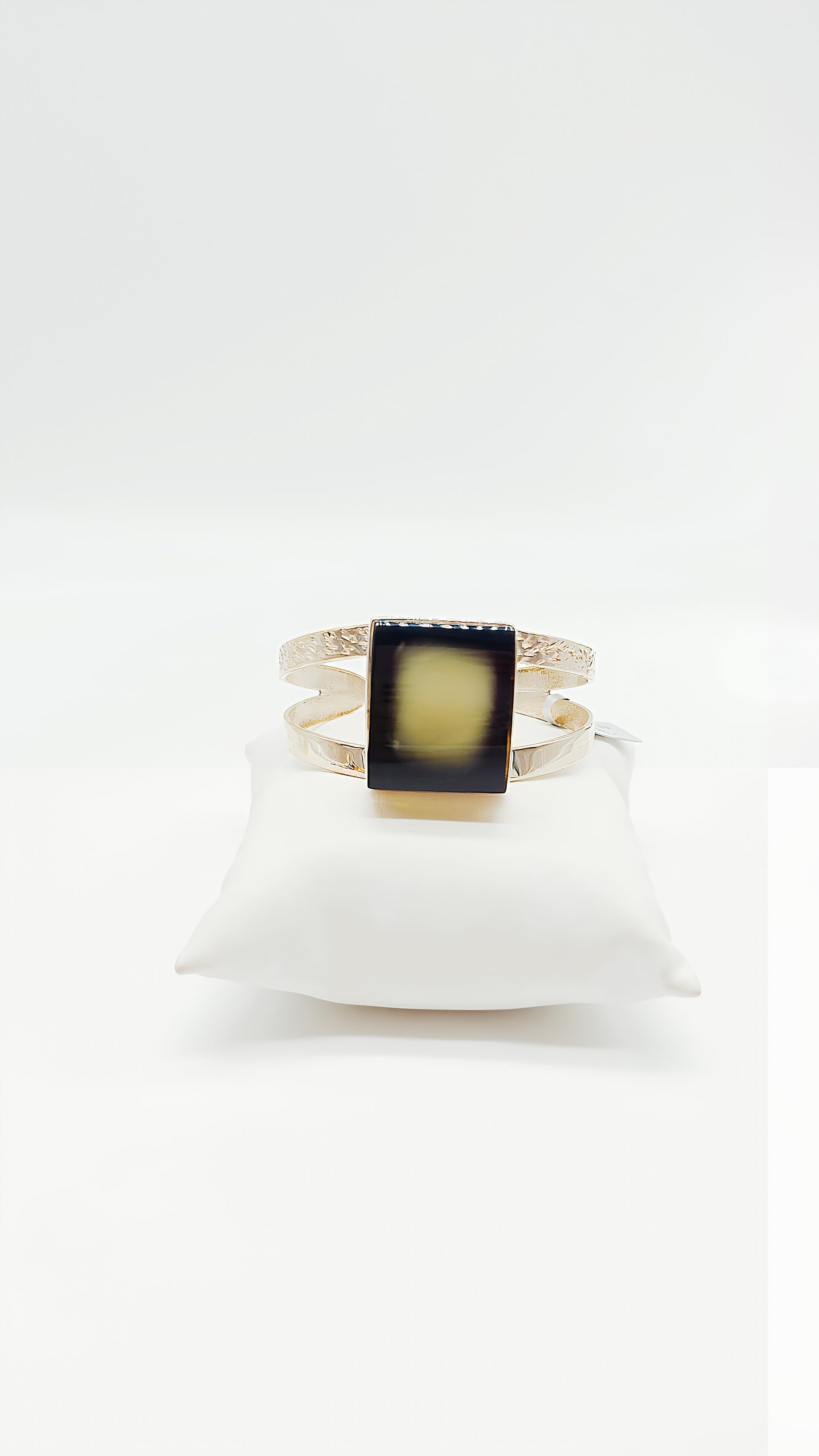 This striking 925 sterling silver bangle features a rectangular piece of green amber set in silver, captivating with its mystical depth. The stone's multifaceted luster is reminiscent of the play of light in a deep forest and lends the piece a special sophistication. The bangle's clean, geometric design highlights the natural beauty of the amber, making this accessory a true eye-catcher. Ideal for lovers of modern and luxurious jewelry.