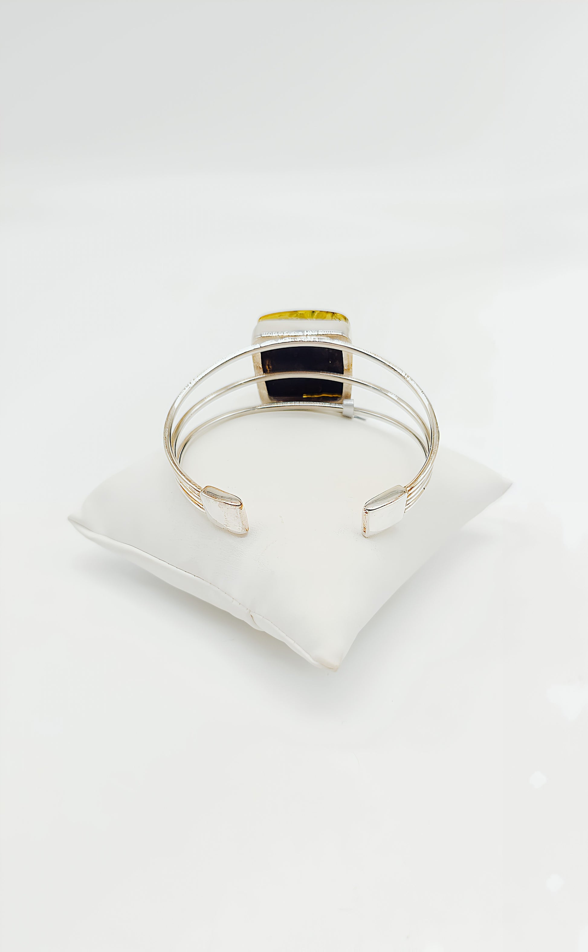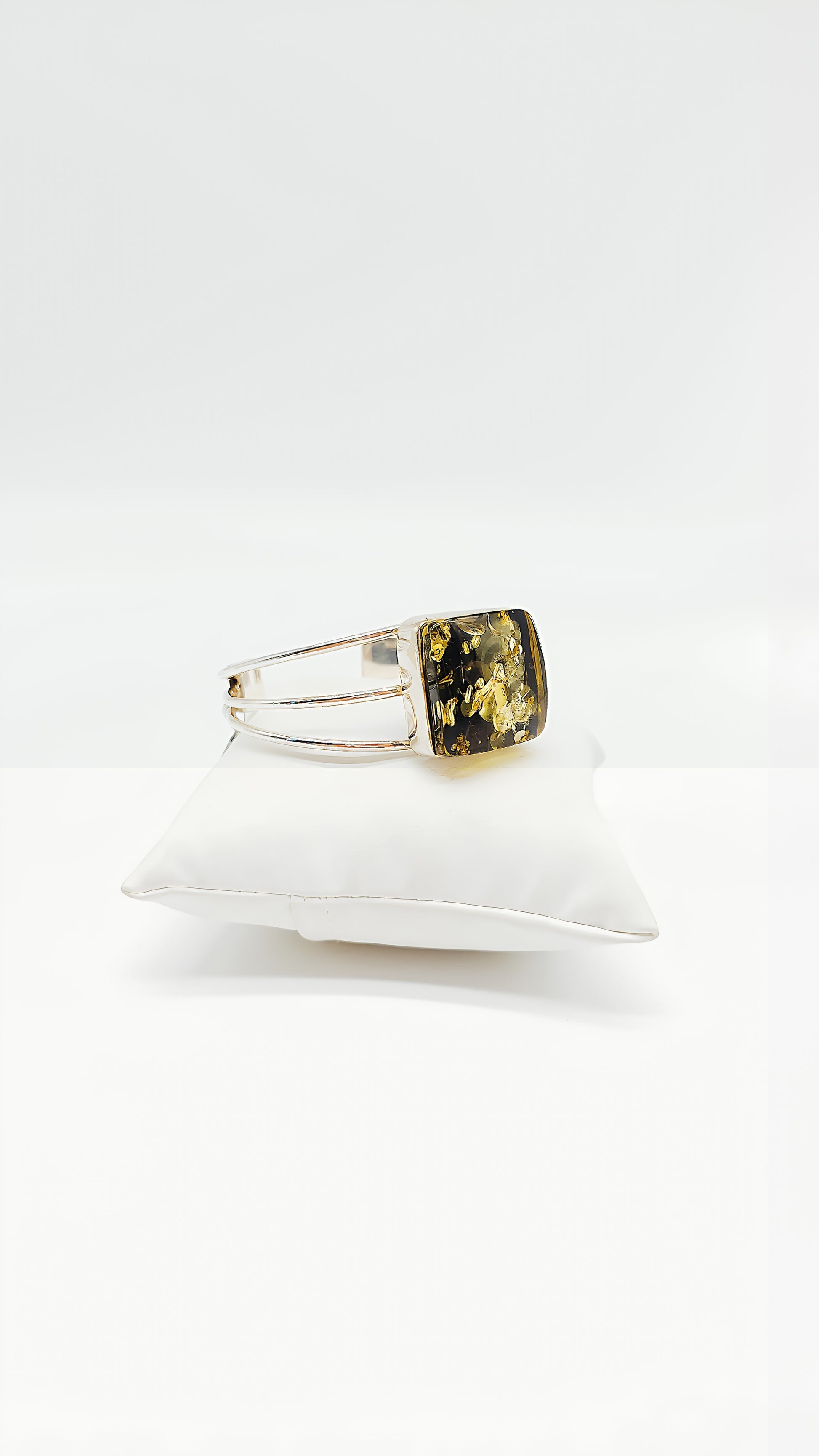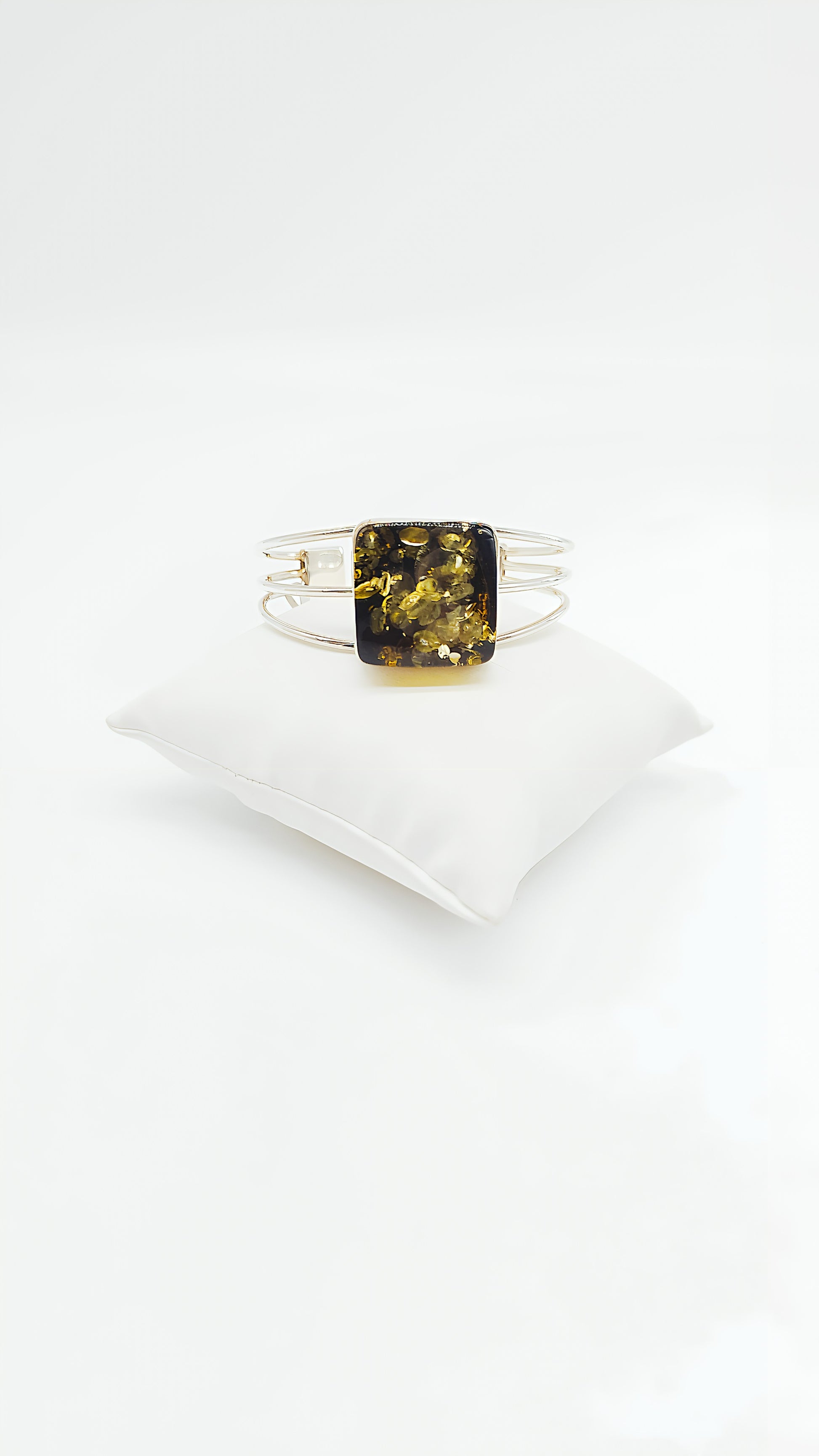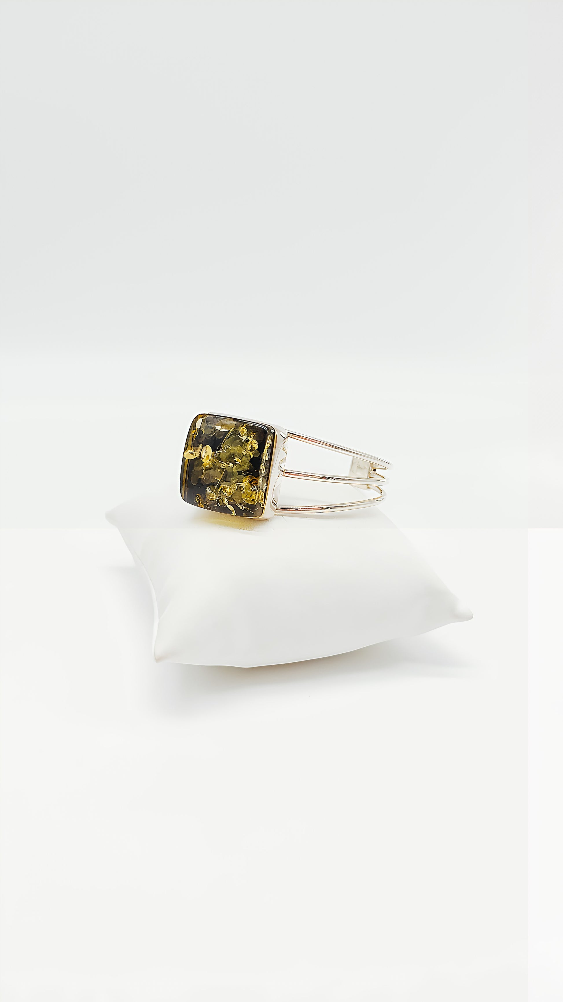 This luxurious bangle combines the mysterious beauty of green amber with the classic elegance of 925 sterling silver. The rectangular amber, set in silver, captivates with its mesmerizing green tones, reminiscent of the play of light in a forest. Every detail of this piece of jewelry expresses a connection to nature and refined design. This bangle is the perfect choice for anyone seeking an exceptional, luxurious accessory.