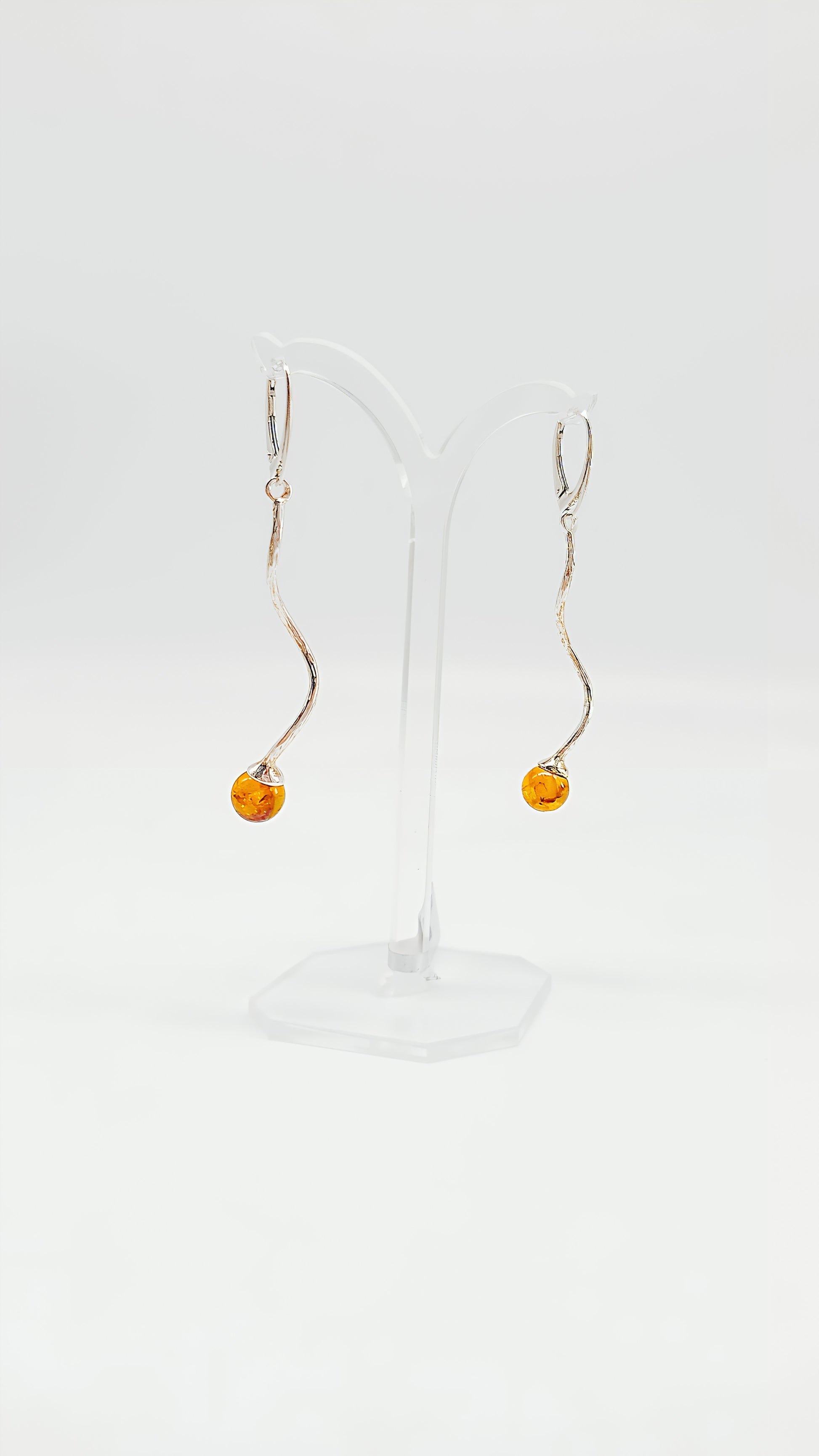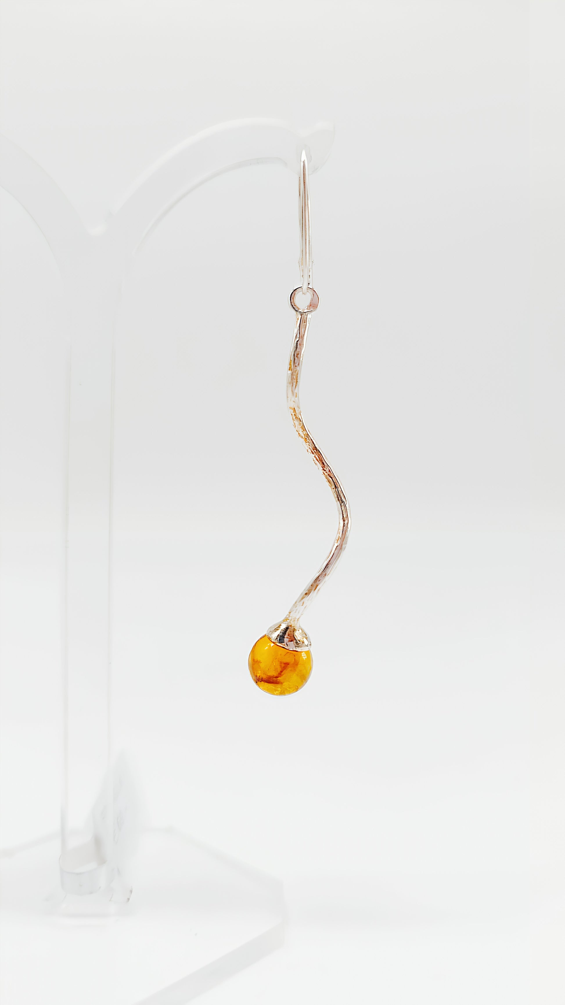 These extraordinary 925 sterling silver earrings are characterized by their flowing design, reminiscent of delicate drops. Small, amber-colored spheres dangle from the curved silver lines, shimmering in warm tones with every movement. The perfect earrings for those who want to combine lightness and elegance in their jewelry. These earrings offer a unique combination of natural materials and modern design and are a real eye-catcher for any occasion.