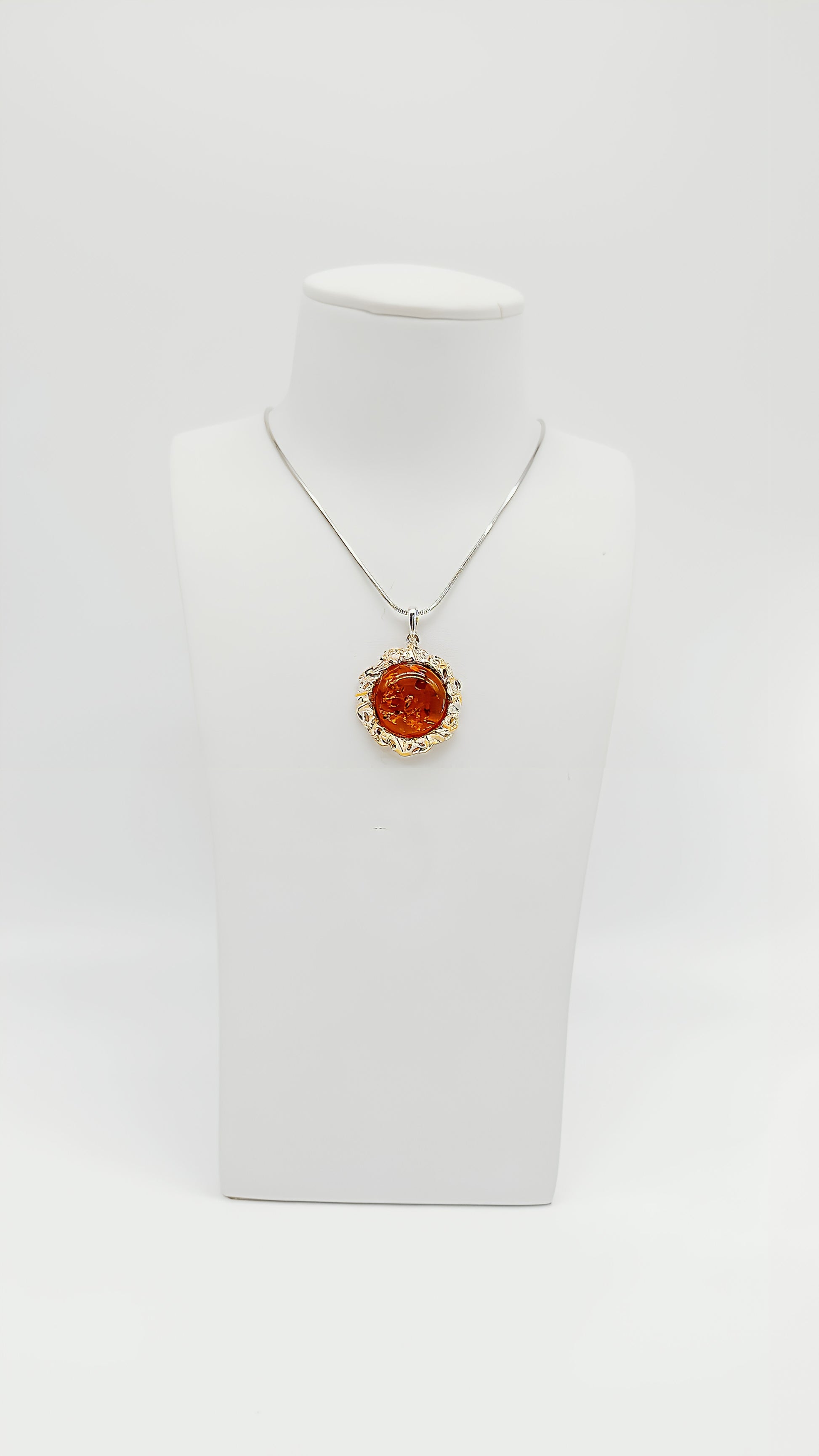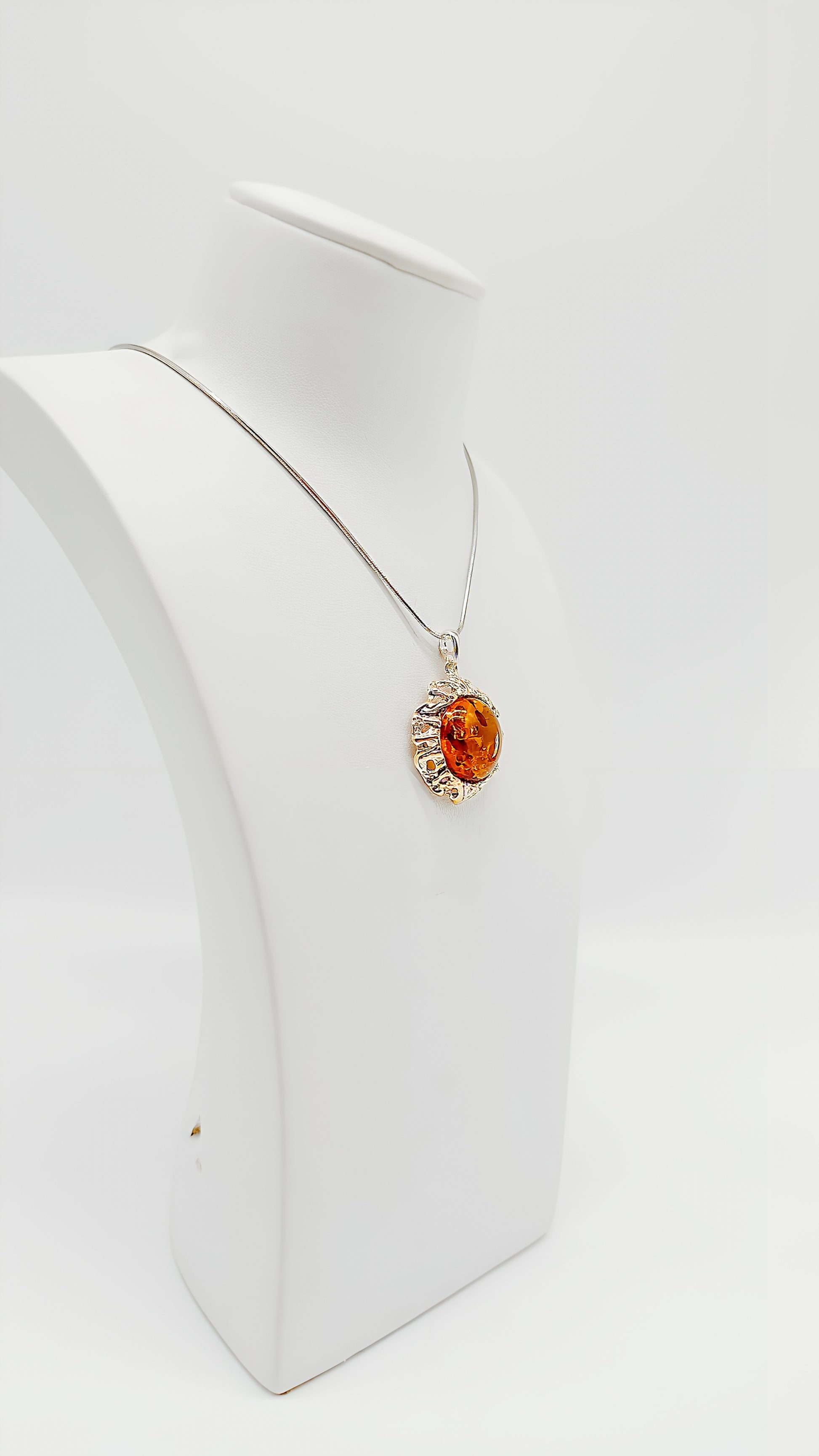 This elegant pendant crafted from 925 sterling silver combines the magic of amber with a sophisticated silver frame. The round design of the amber reflects its natural beauty, while the fine silver setting gives the piece a modern and luxurious touch. Perfect for special occasions or as an everyday highlight, this pendant will turn heads and is a must-have for any jewelry lover who values quality and style.