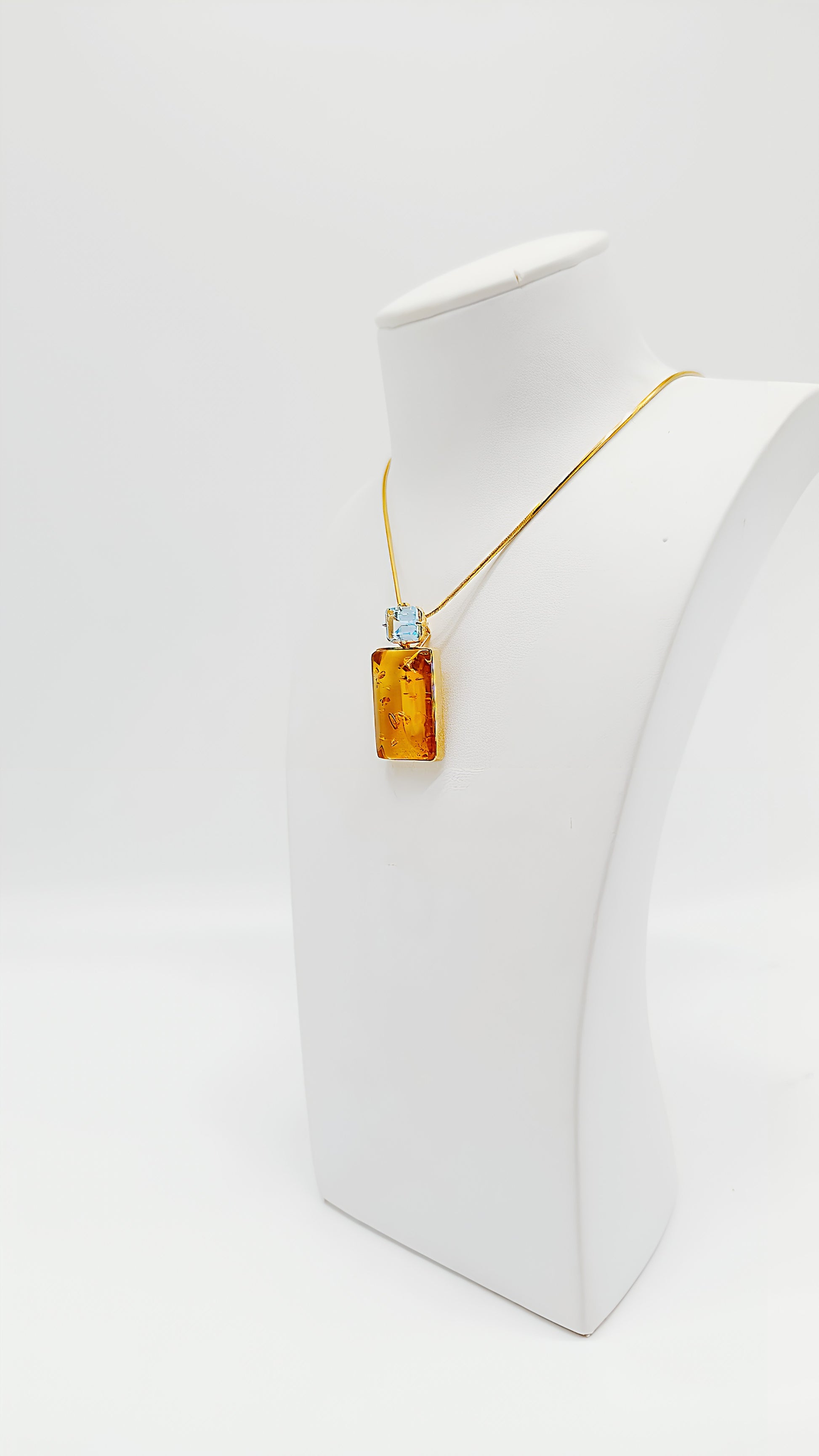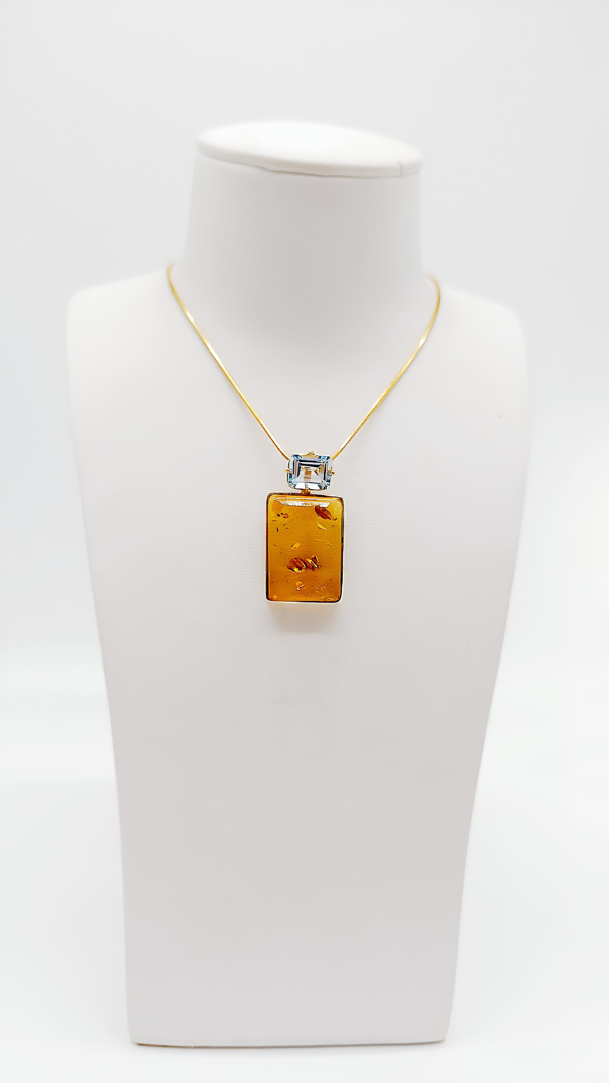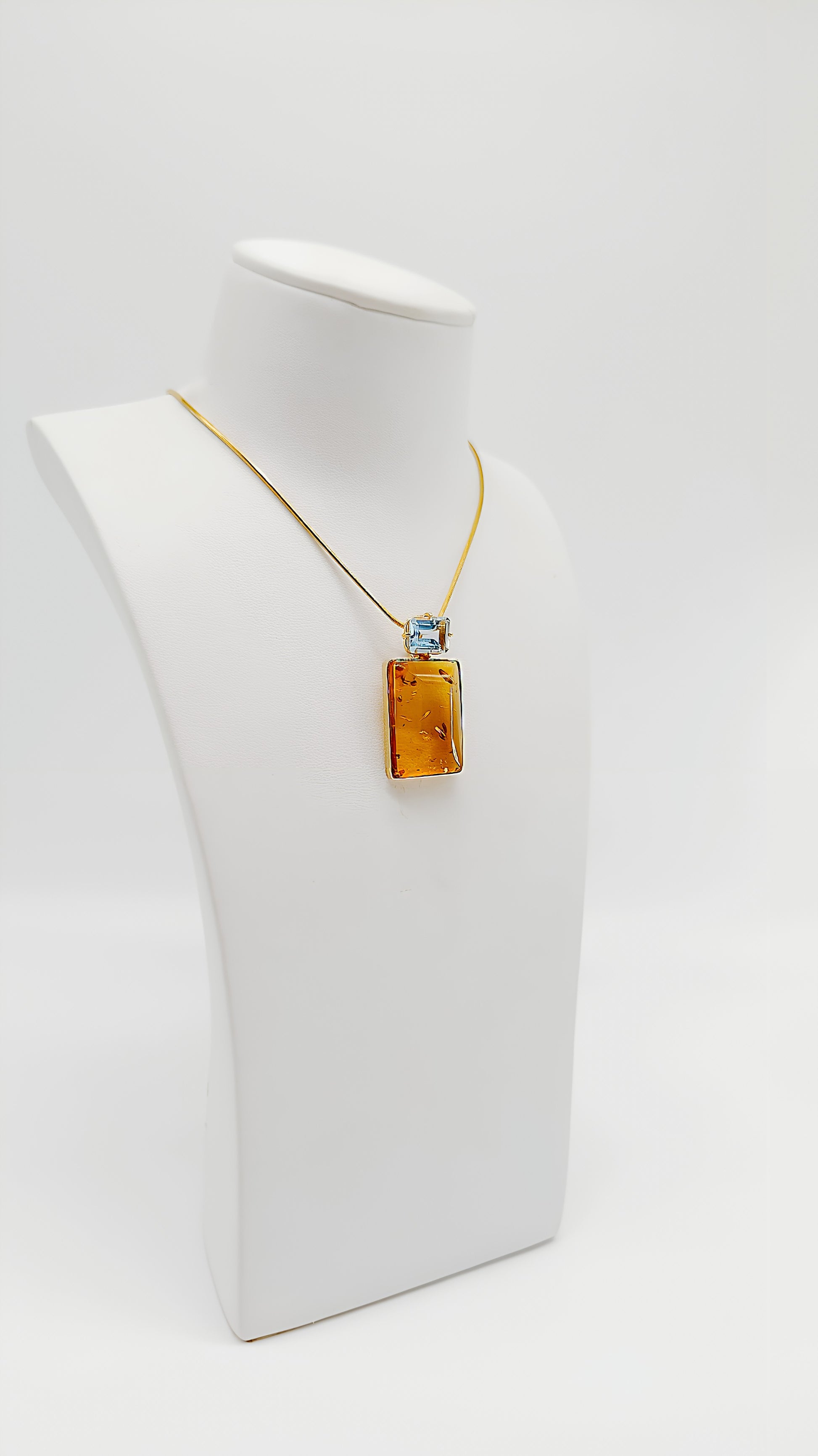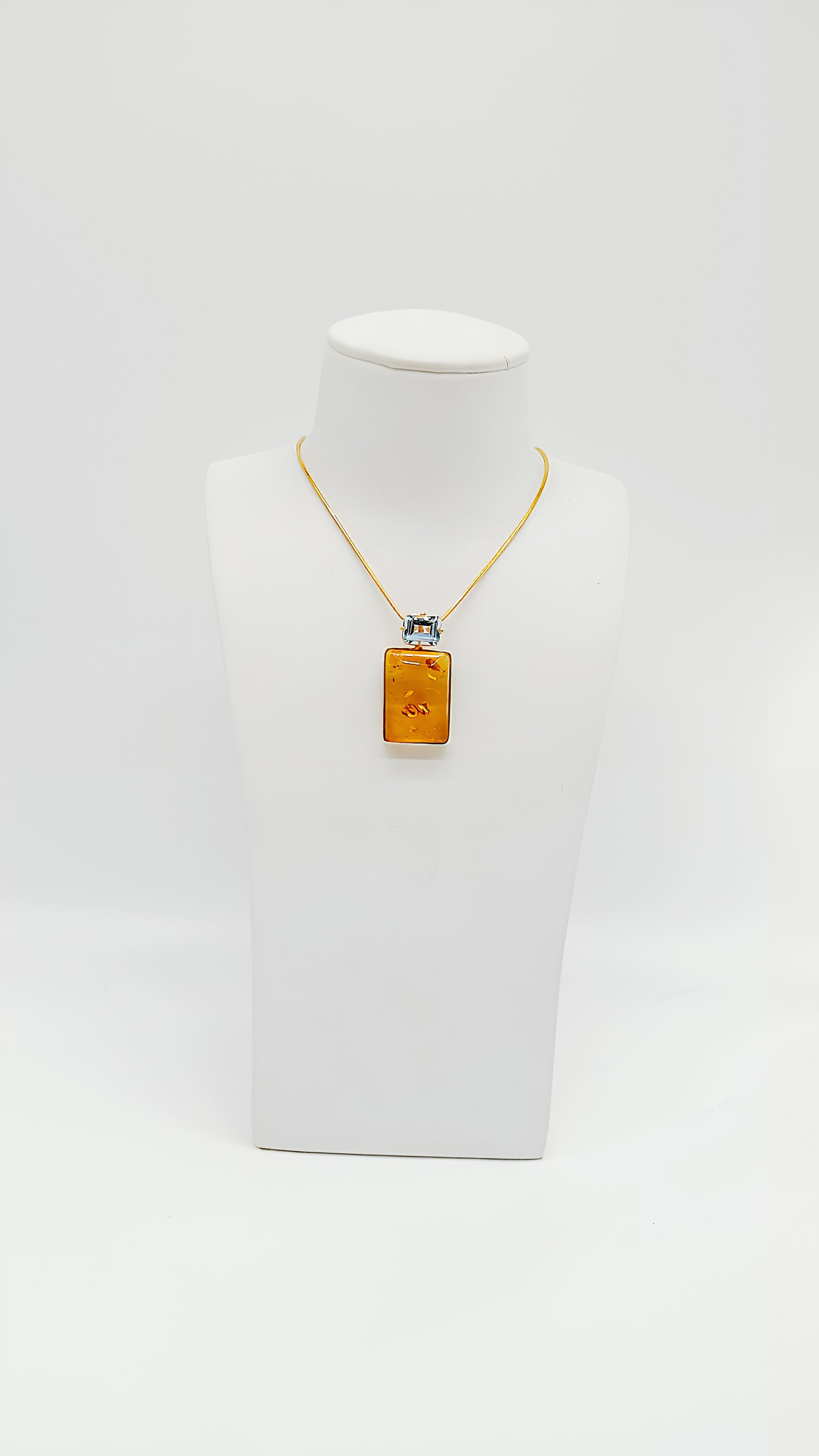 This elegant pendant made of gold-plated 925 sterling silver combines classic elegance with modern design. The rectangular, luminous, warm amber is framed by a high-quality gold-plated setting, creating a unique highlight. The simple elegance of the shape perfectly showcases the natural beauty of the amber. This piece of jewelry adds a luxurious touch to any outfit and is ideal for special occasions or as a stylish everyday accessory.
