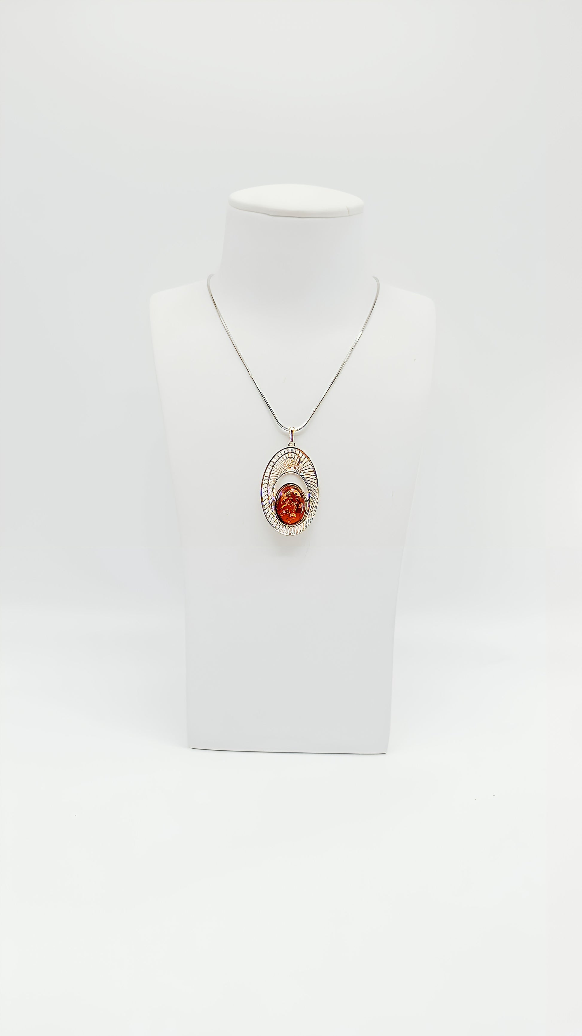 This extraordinary pendant crafted from 925 sterling silver combines the captivating beauty of genuine amber with an elegant oval design. The warm, golden color of the amber radiates in perfect contrast to the cool sheen of the high-quality silver. The delicate, handcrafted pattern of the silver frame lends this piece of jewelry a touch of exclusivity, making it a stylish companion for any occasion. A timeless accessory that enhances the wearer's natural beauty.