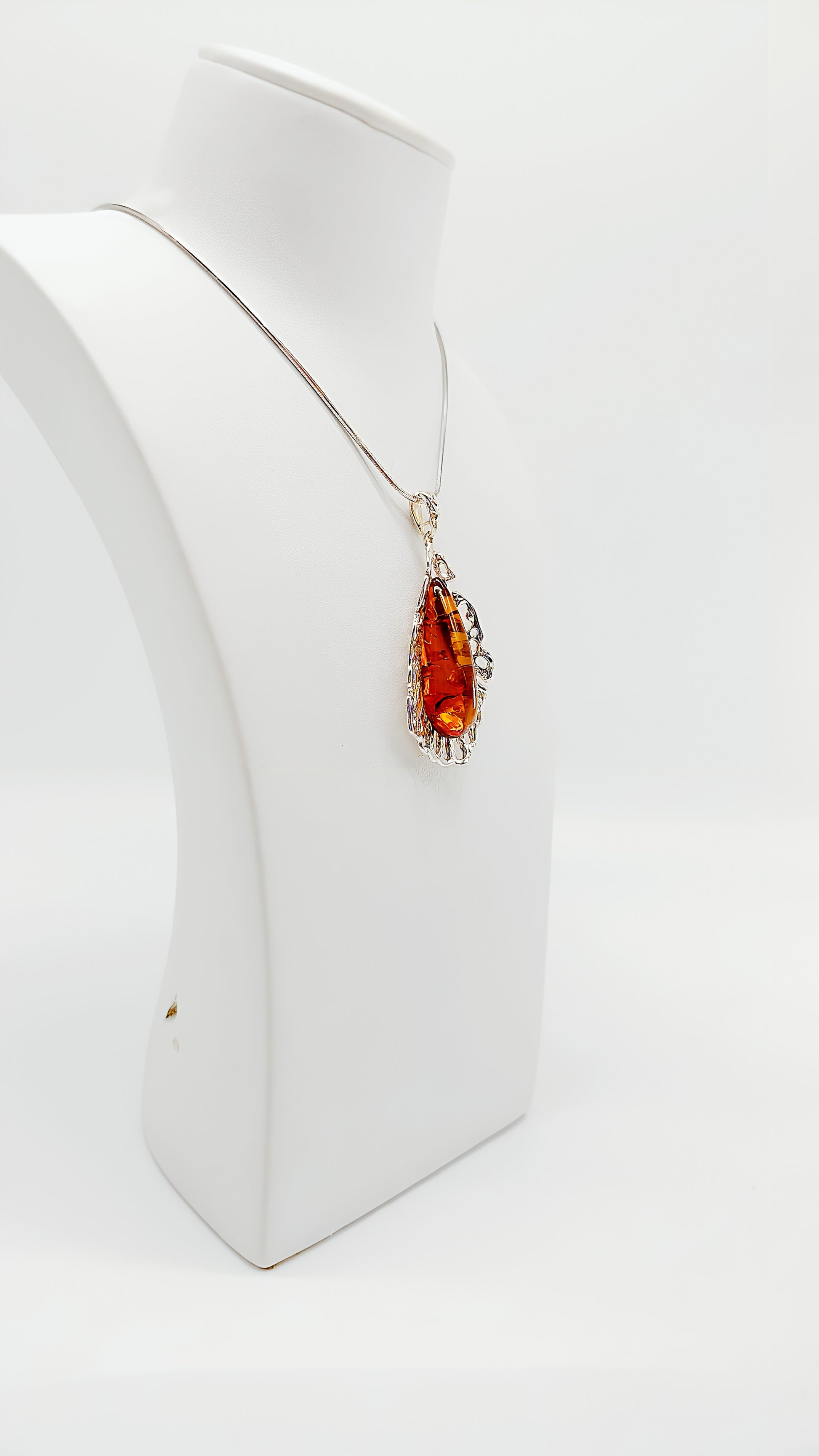 This captivating pendant crafted from 925 sterling silver features a teardrop-shaped amber stone framed by delicate silver details. The warm, honey-colored luminosity of the amber is perfectly enhanced by the artistic silver setting, giving the pendant a breathtaking radiance. A piece of jewelry that serves as a true highlight both for everyday wear and for special occasions, complementing your style in a unique way.