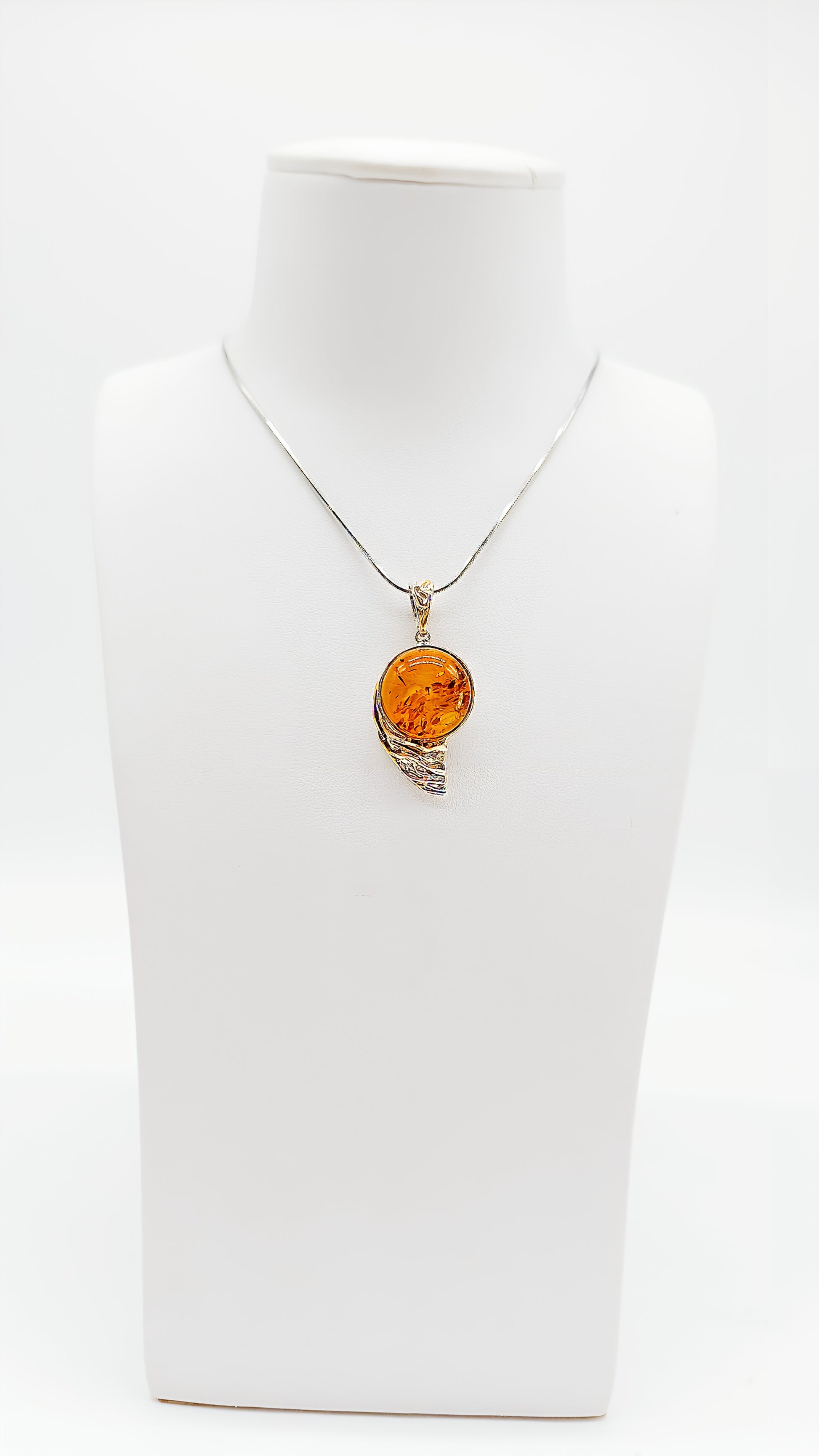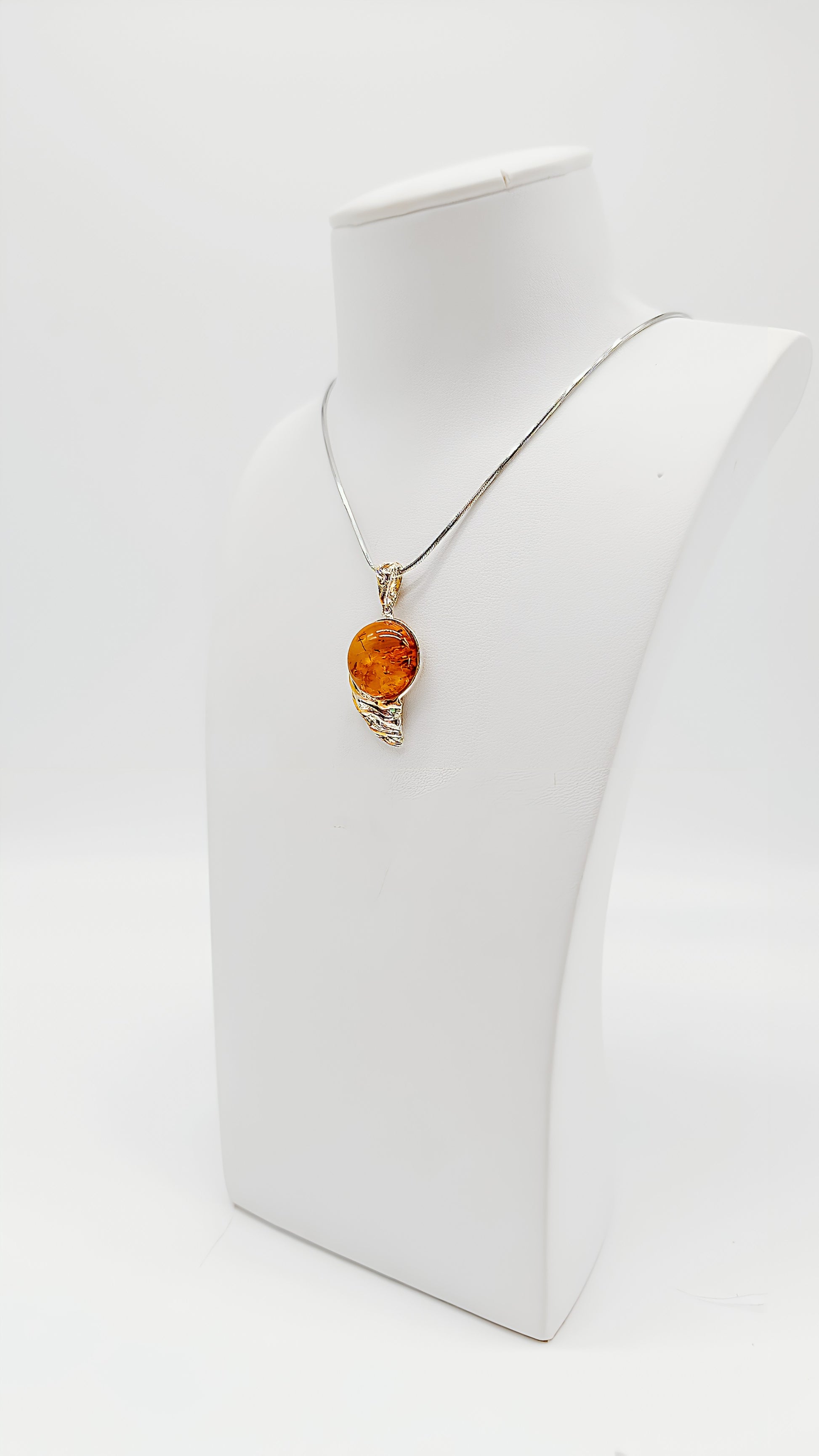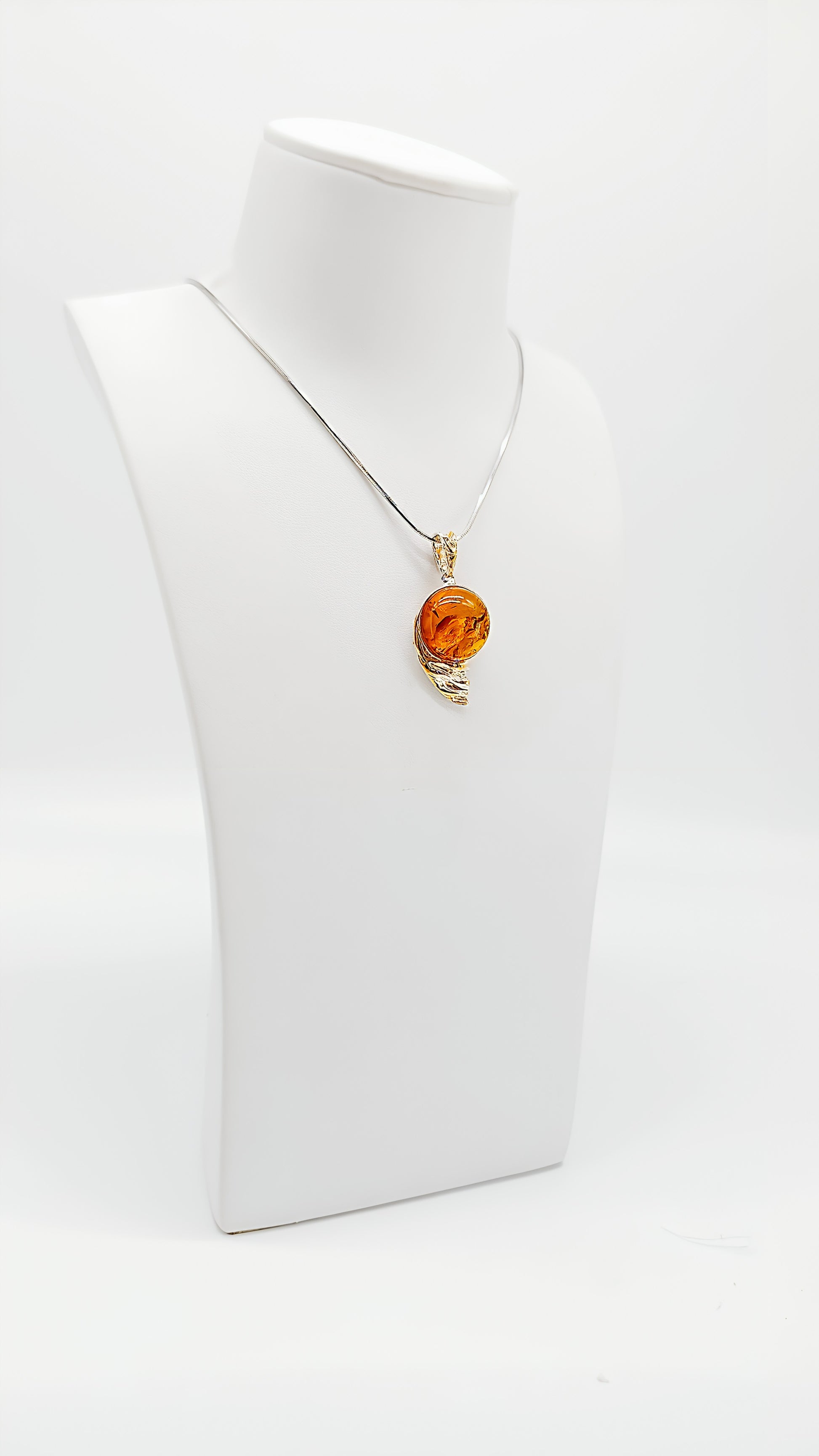 This extraordinary pendant made of 925 sterling silver captivates with its luminous amber stone framed by delicate gold-plated accents. The harmonious blend of silver and gold lends this piece of jewelry a unique elegance that's perfect for everyday wear as well as special occasions. The round amber reflects the light in a fascinating way, illuminating the pendant in warm golden tones—an absolute highlight for all jewelry lovers!