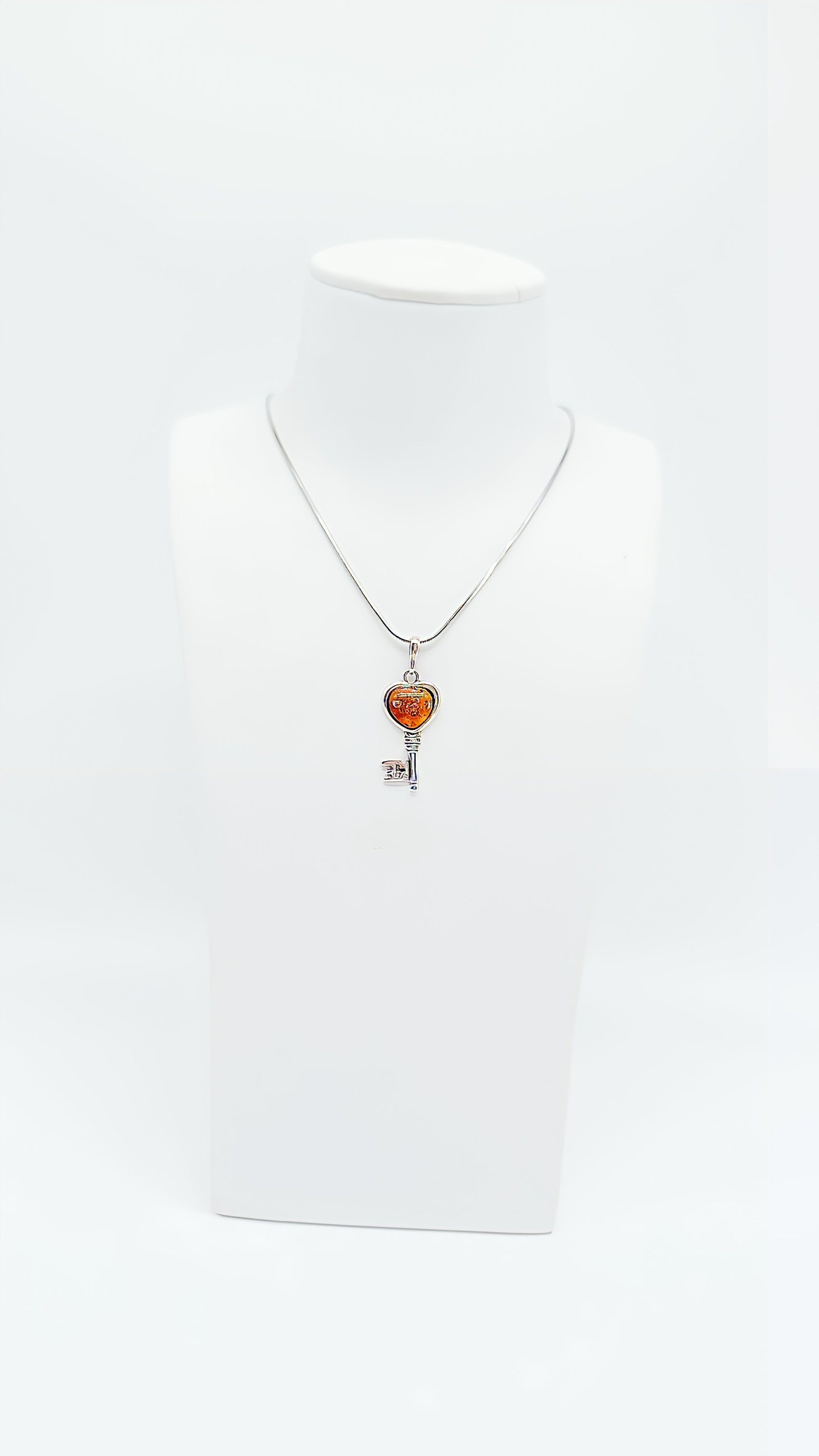 This elegant 925 sterling silver key-shaped pendant with a heart-shaped amber stone adds a special touch to any outfit. The amber reflects warm light and harmonizes perfectly with the cool silver. The stylish design combines the warmth of amber with the timeless elegance of silver, making this pendant an ideal accessory for special occasions or as an everyday companion. An exceptional piece of jewelry that is both romantic and modern.