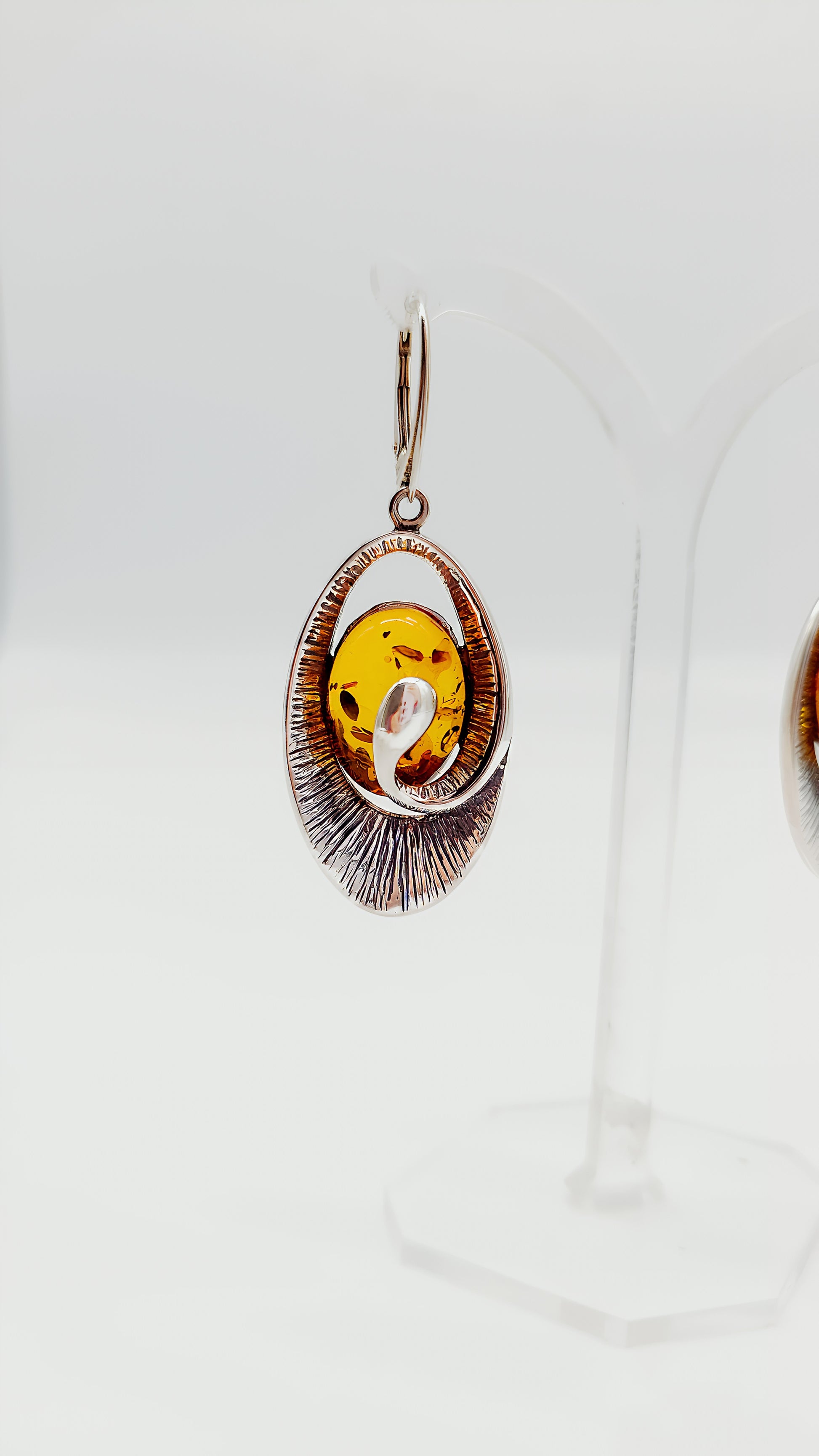 These 925 sterling silver earrings combine the natural charm of amber with an elegant oval design. The radiant amber in the center is perfectly showcased by the delicate silver pattern, giving the piece a special depth and charisma. An ideal accessory for anyone who loves classic elegance with a touch of nature.