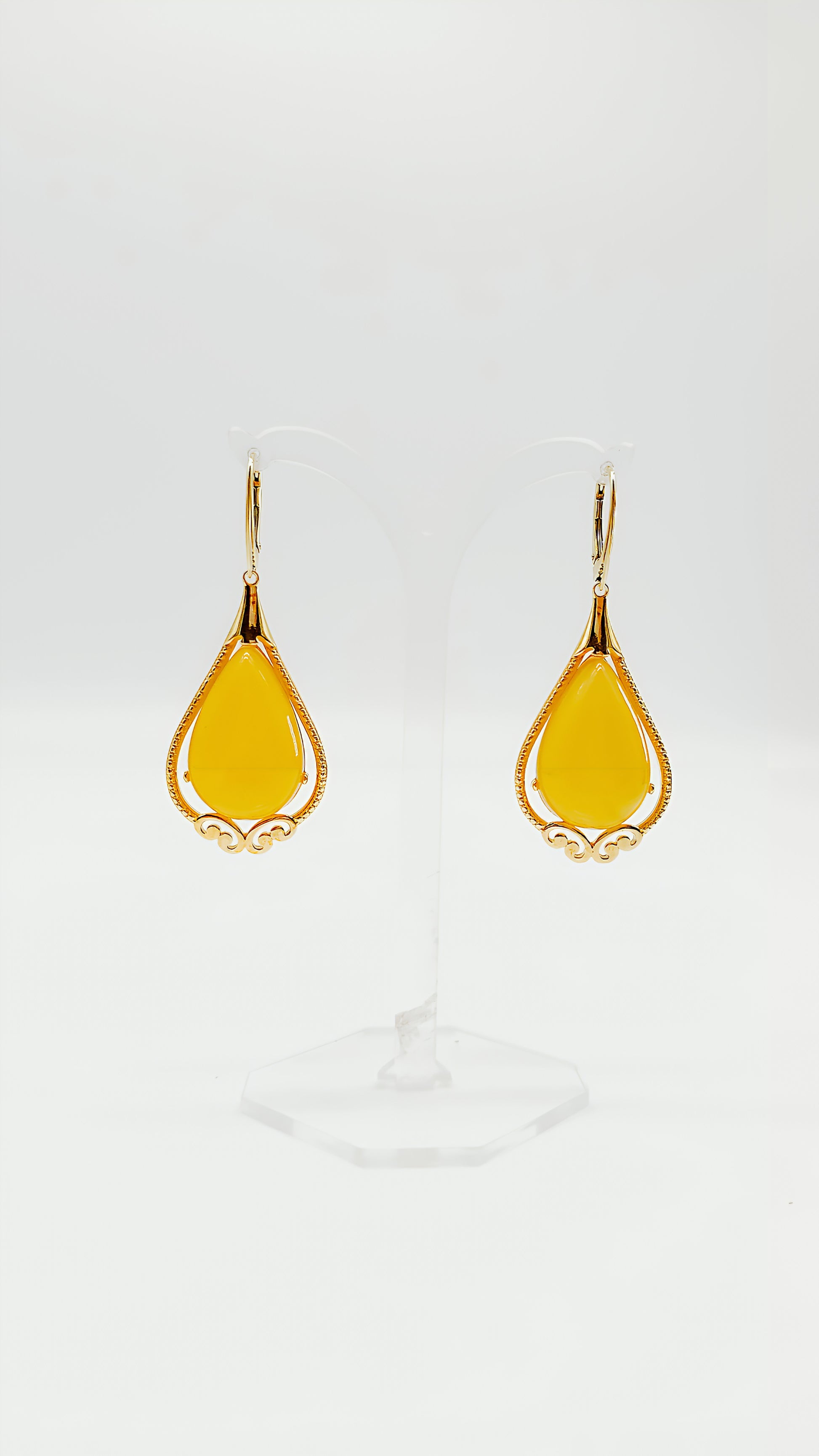These elegant earrings, crafted from gold-plated 925 sterling silver, feature a vibrant yellow amber drop framed by delicate embellishments. The warm glow of the amber meets the elegant gold accents, giving the piece a luxurious yet natural look. Perfect for adding an extra dose of elegance and warmth to any outfit—whether for special occasions or as an everyday highlight.