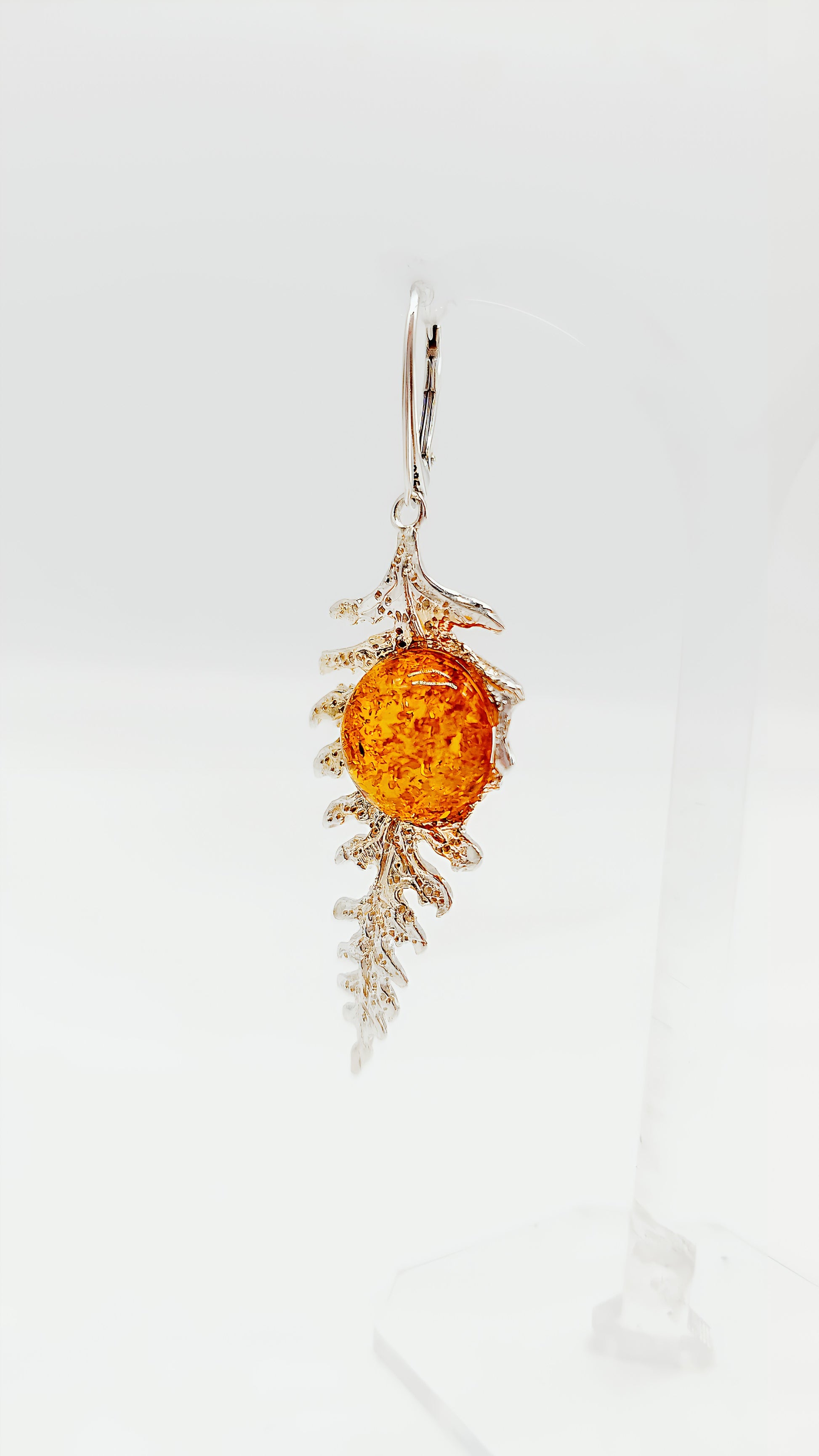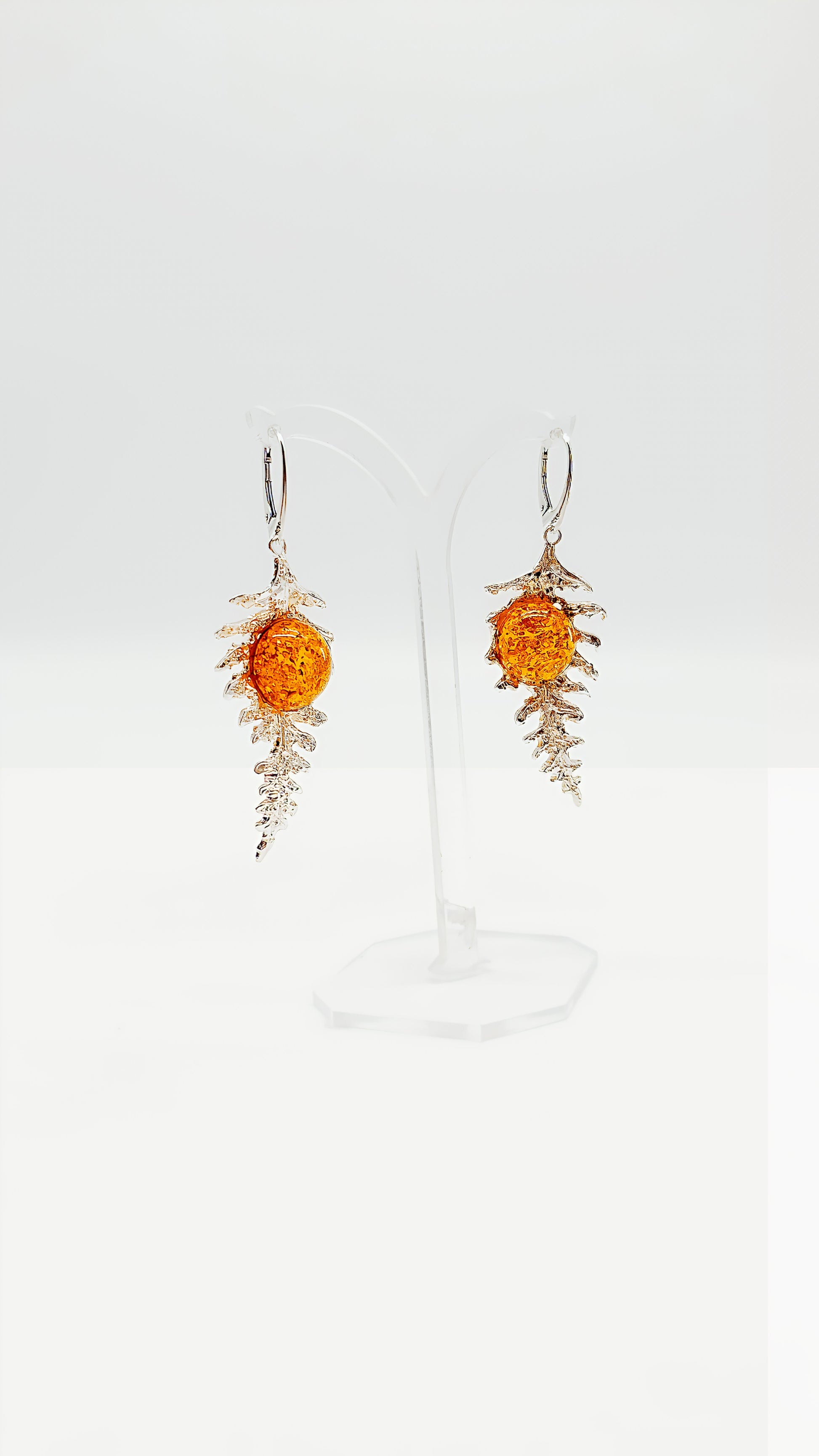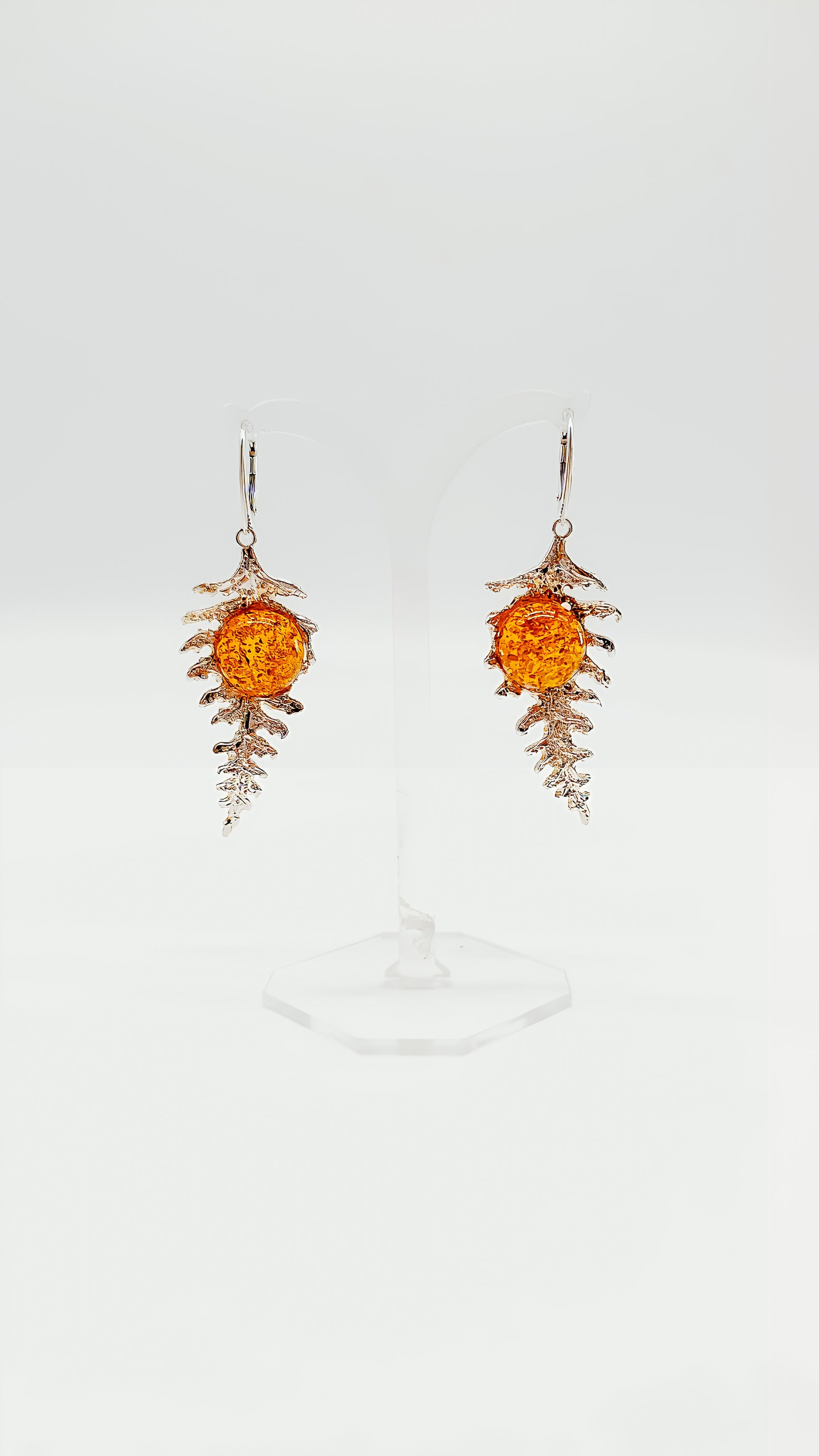These unique 925 sterling silver and amber earrings bring the beauty of nature directly to you. The vibrant amber in warm orange tones is perfectly showcased by a delicate silver leaf design. A stylish accessory reminiscent of forest leaves, they add a touch of elegance and naturalness to your look.