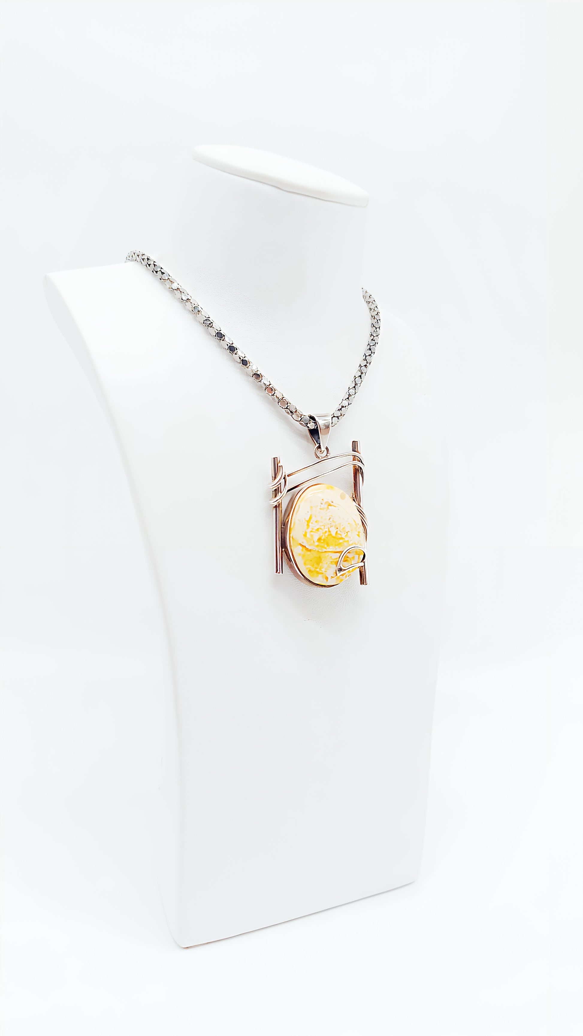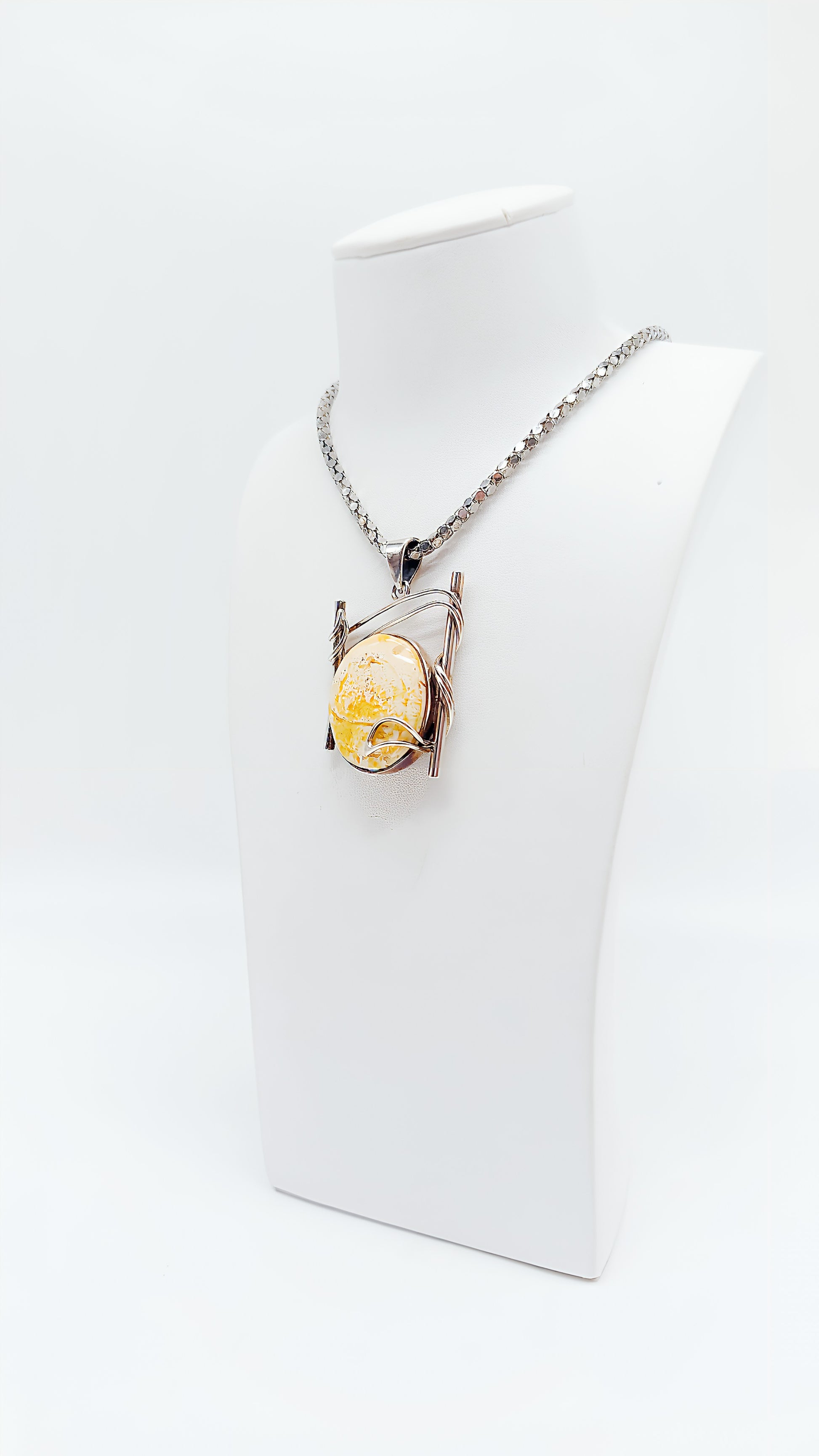 This exceptional amber pendant crafted from 925 sterling silver combines traditional beauty with a modern, artistic design. The warm, honey-colored amber is embedded in a sophisticated, delicate silver setting, making this piece a true eye-catcher. Perfect for women who prefer a creative and elegant style. Each piece is unique and ideal as a unique gift for special occasions or as a statement piece for your own look.