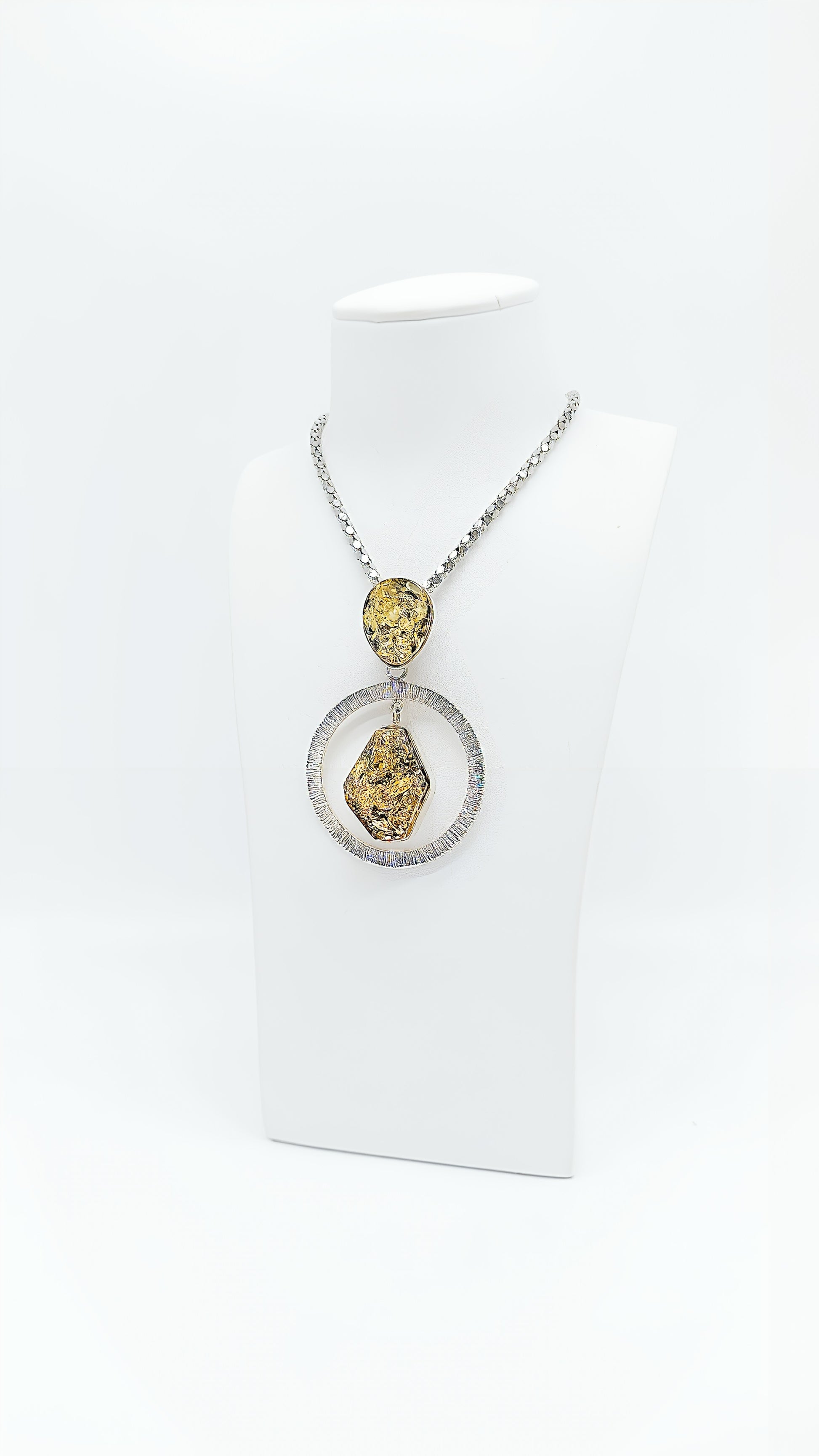 This extravagant amber pendant crafted from 925 sterling silver combines artistic design with natural beauty. The warm, geometric amber is held by two elegant frames, giving it a modern yet sophisticated appeal. The playful combination of circular and polygonal shapes makes this pendant a real eye-catcher and a truly unique piece. Ideal for women who appreciate exceptional style. Perfect as a special gift or as an exclusive accessory for elegant occasions.