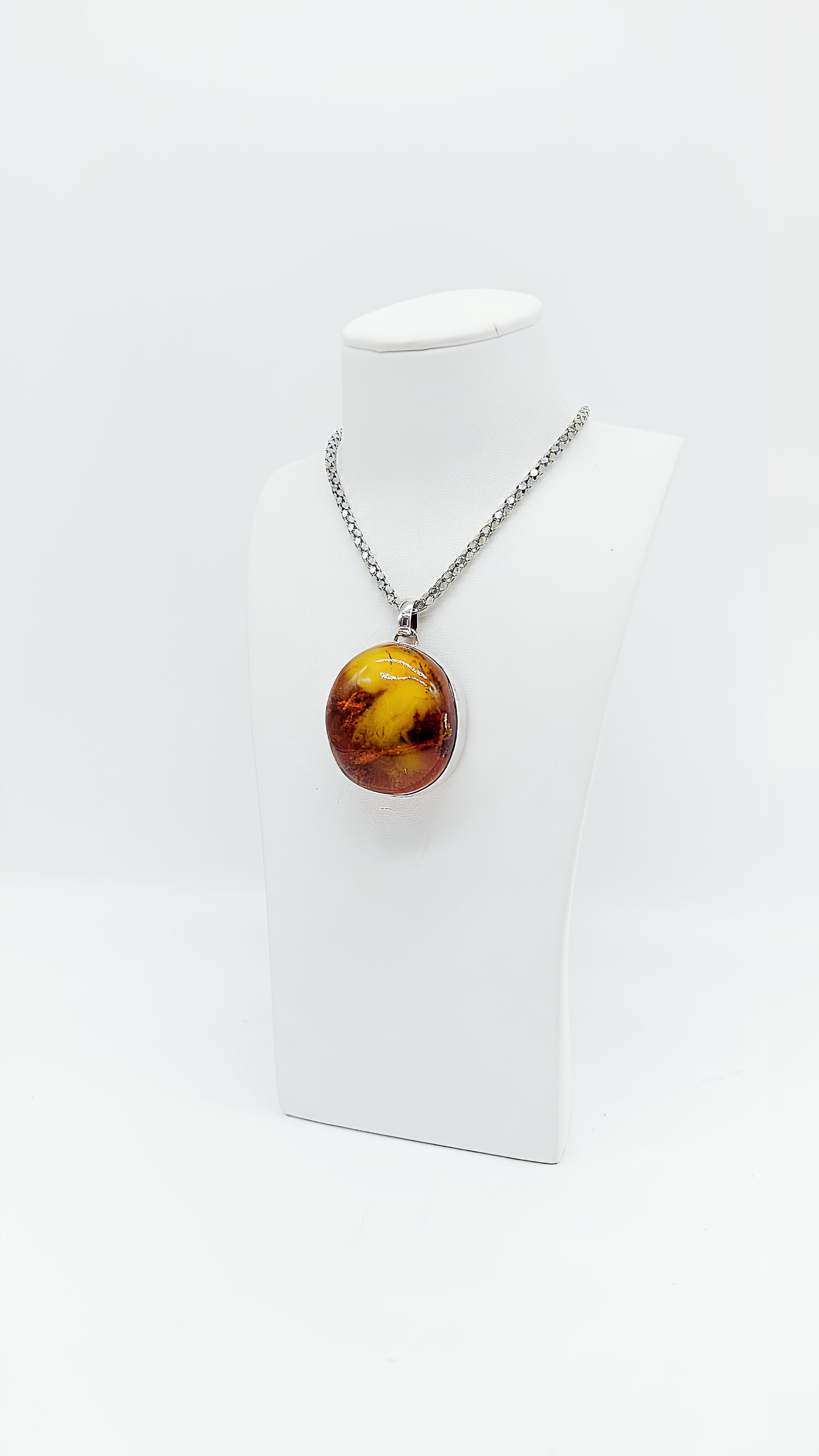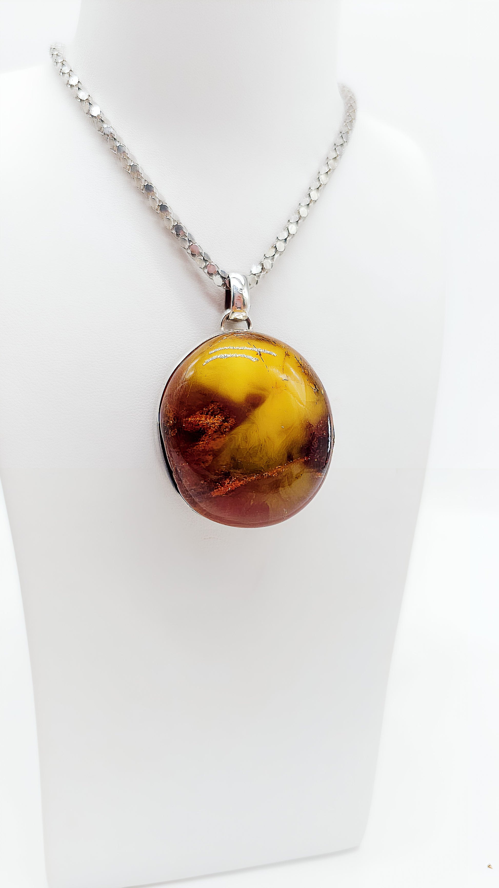 This round amber pendant crafted from 925 sterling silver combines the natural beauty of amber with an elegant and timeless design. The amber glows in warm tones and displays a harmonious play of colors, perfectly framed by the simple silver setting. An ideal piece of jewelry for women who appreciate natural elegance and want to add a special touch to their look. Perfect as a gift for nature lovers or for special occasions.