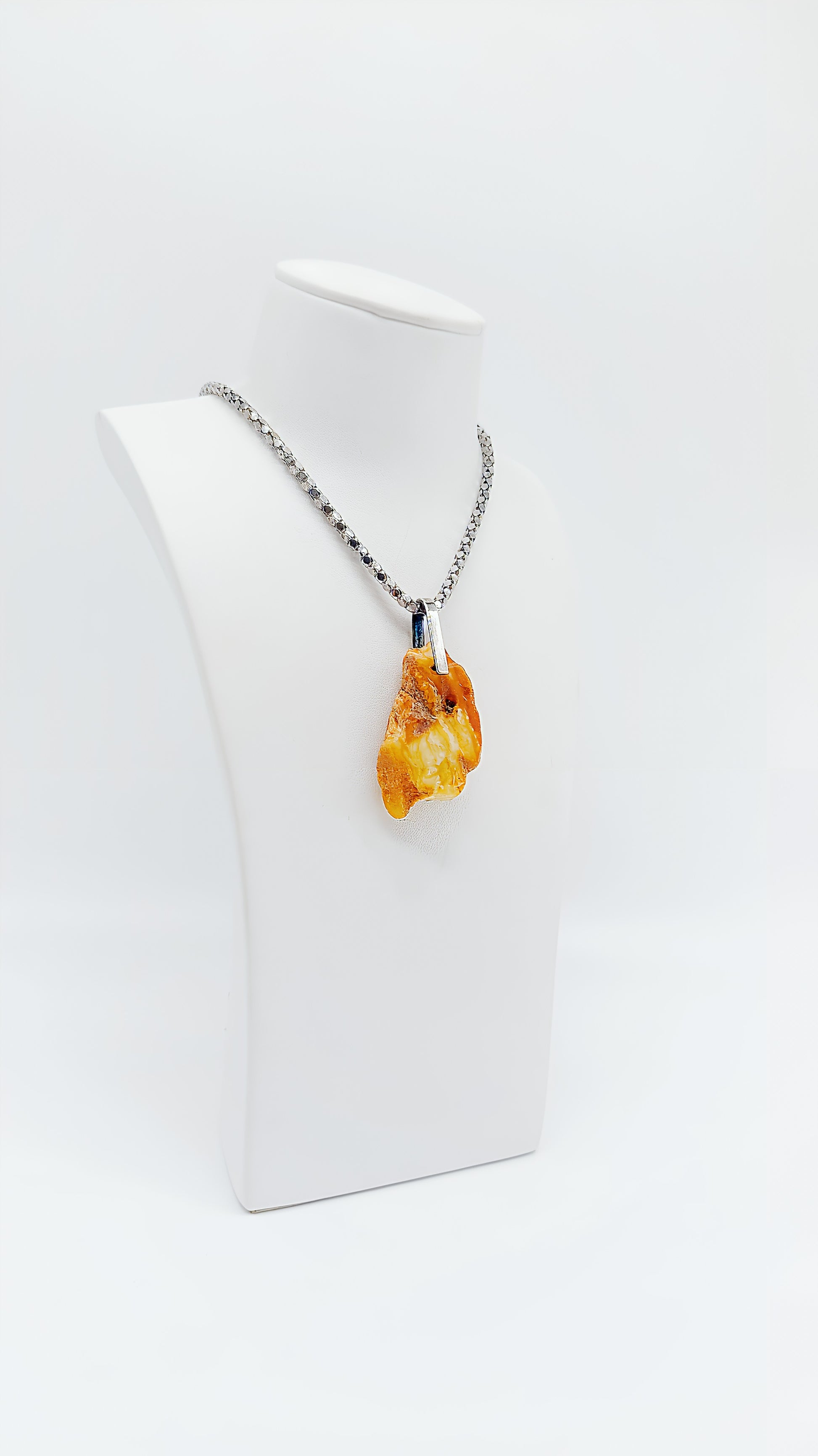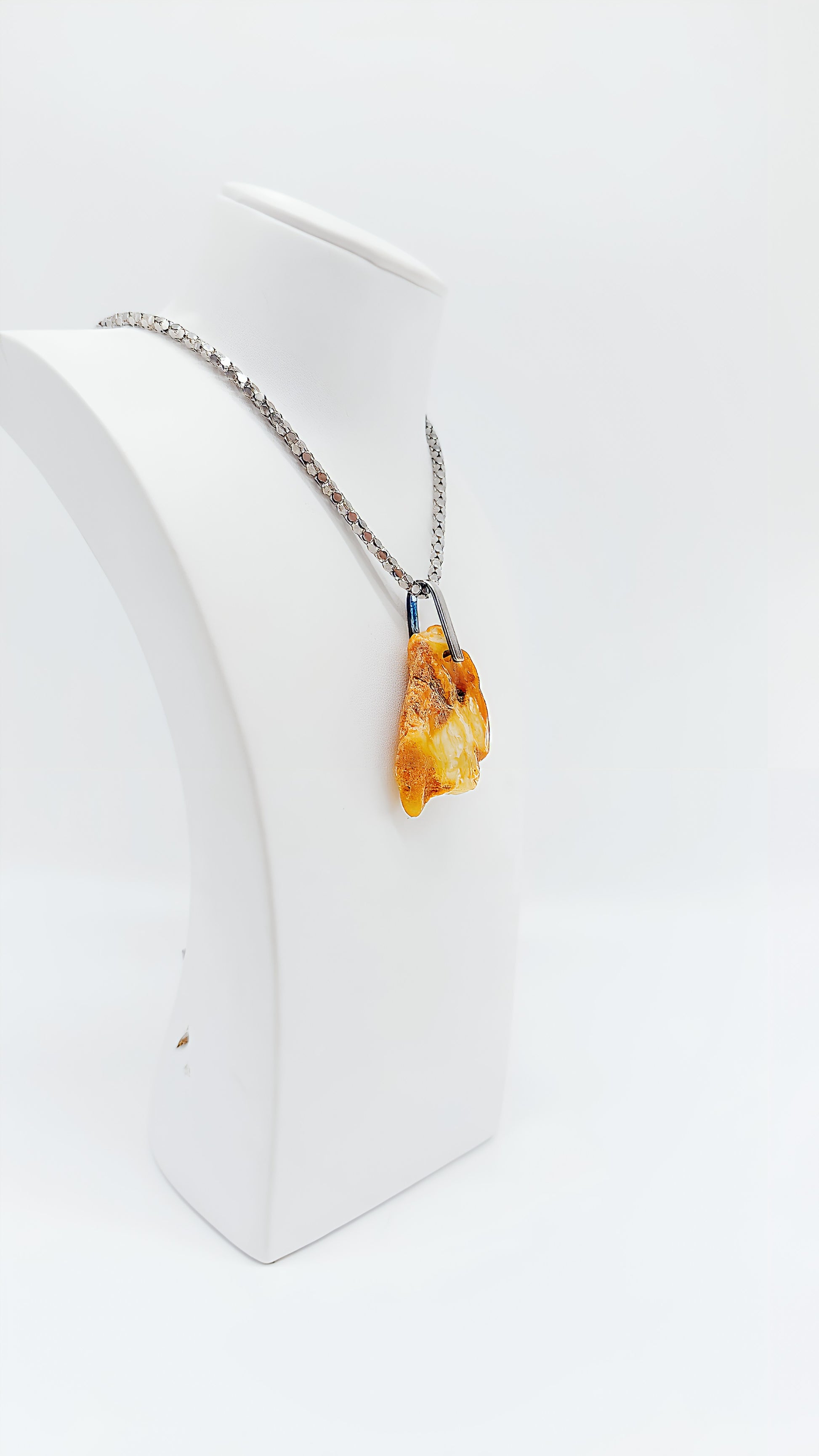 This extraordinary amber pendant crafted from 925 sterling silver showcases amber in its most natural and original form. The unpolished, raw amber boasts a fascinating structure and warm color, perfectly enhanced by the simple silver setting. A unique piece, ideal for women who appreciate the raw beauty of nature and individual pieces of jewelry. Perfect as a gift or as a statement piece for your own jewelry style.