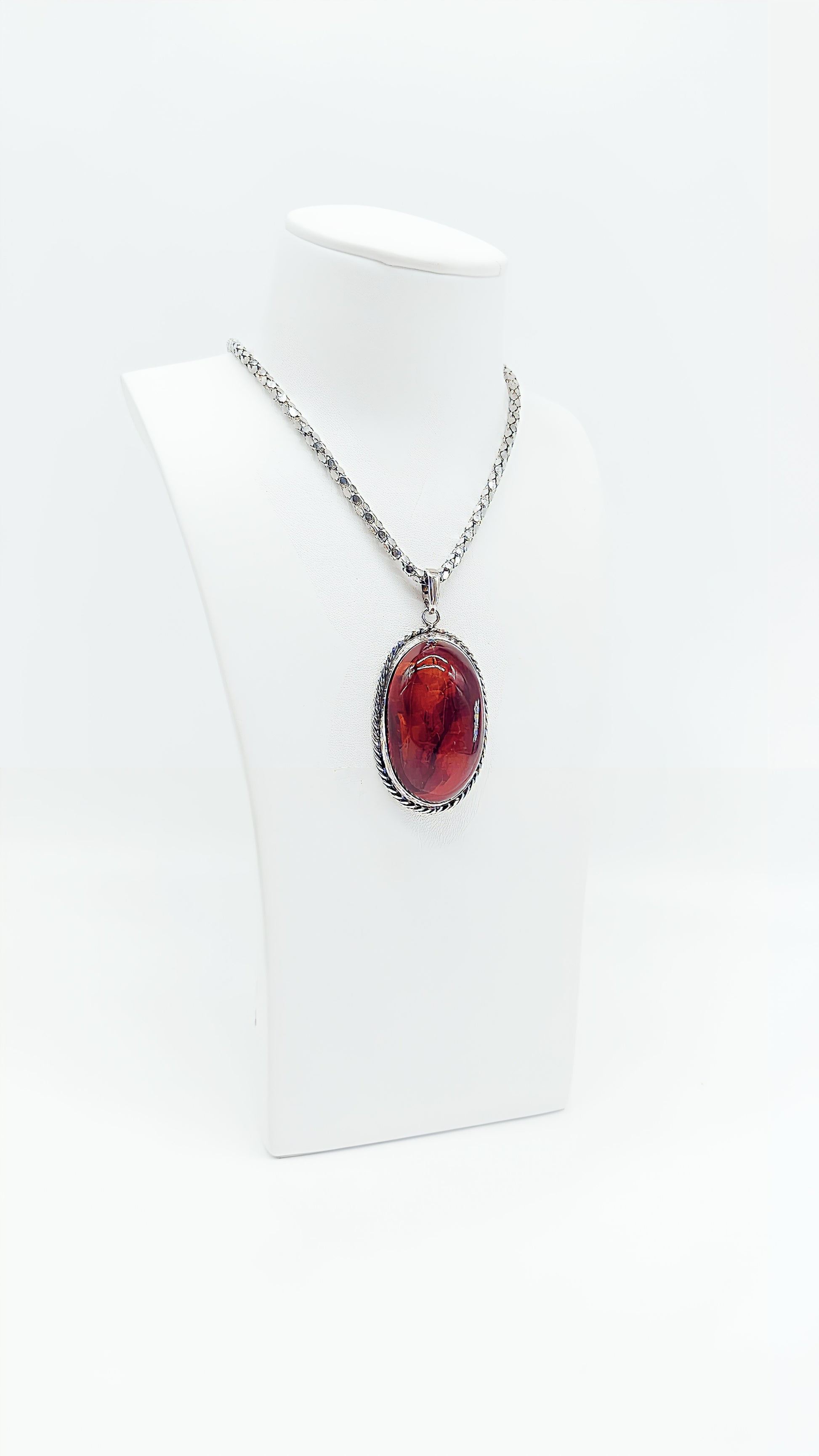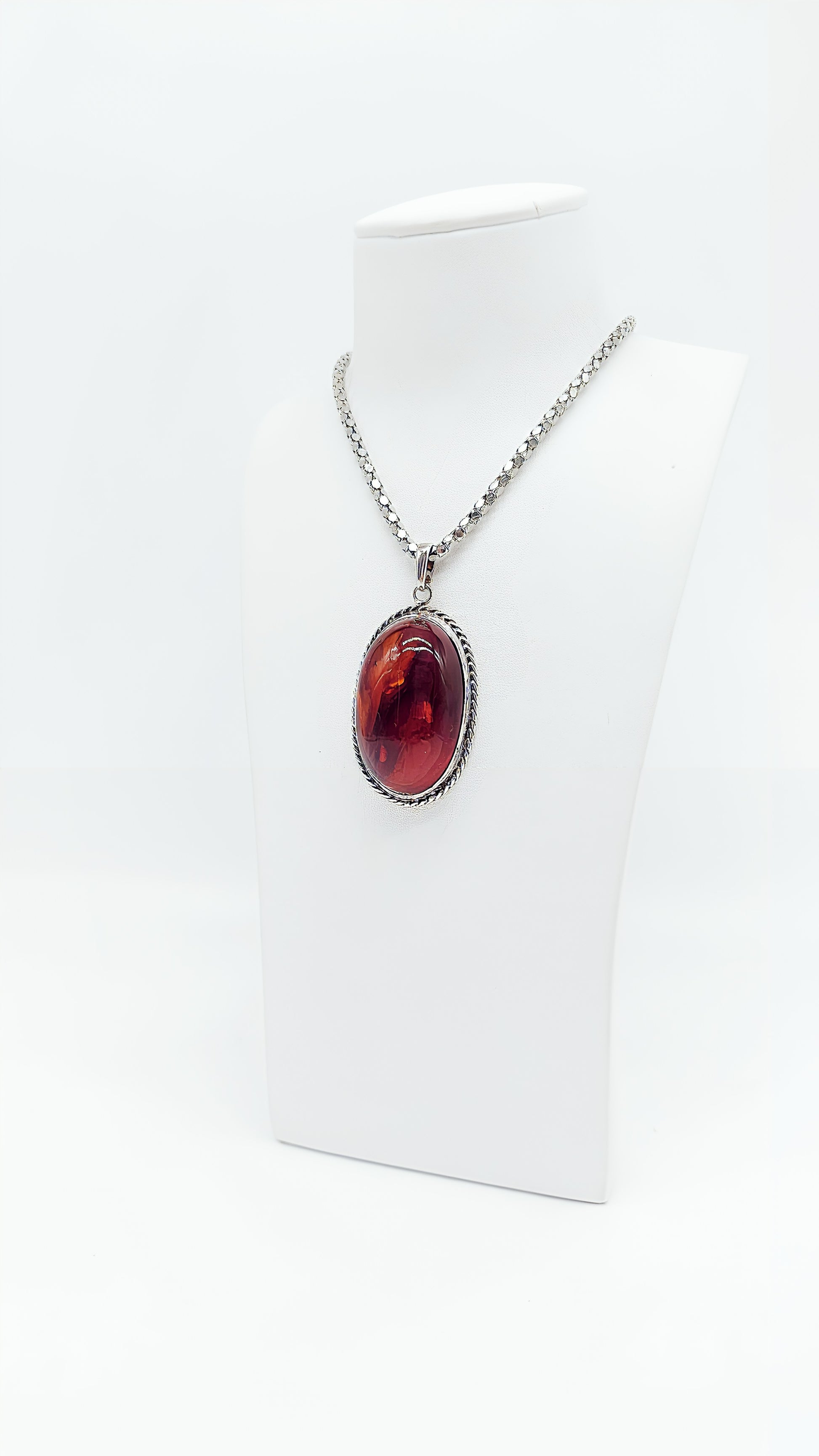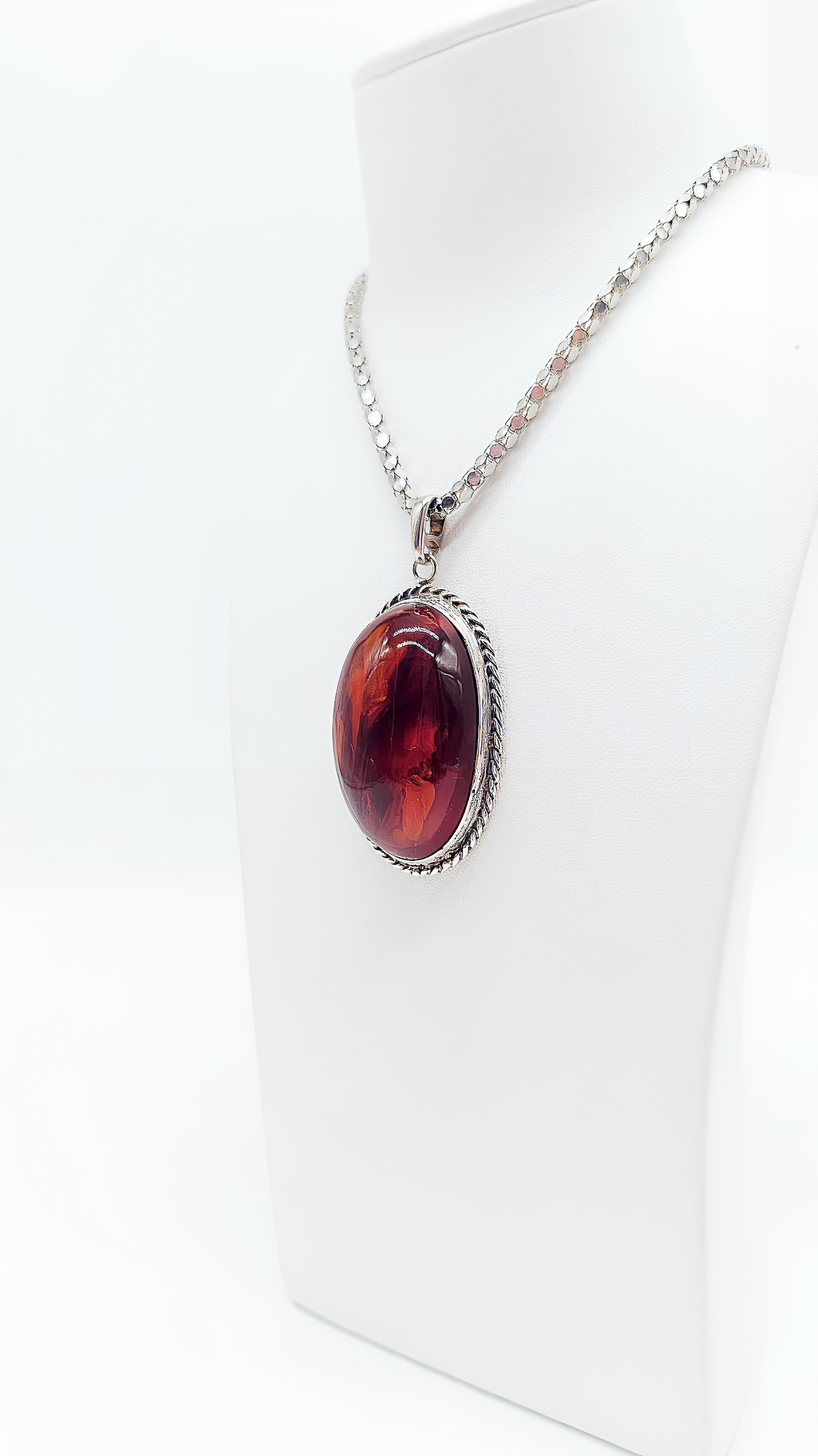 This captivating amber pendant crafted from 925 sterling silver captivates with its intense, deep red hue. The oval shape of the amber is framed by an artfully designed silver setting that highlights the stone's natural radiance. Each piece is unique, perfect for women who value elegance and individuality in their jewelry. A wonderful gift for special occasions or as a sophisticated everyday accessory.