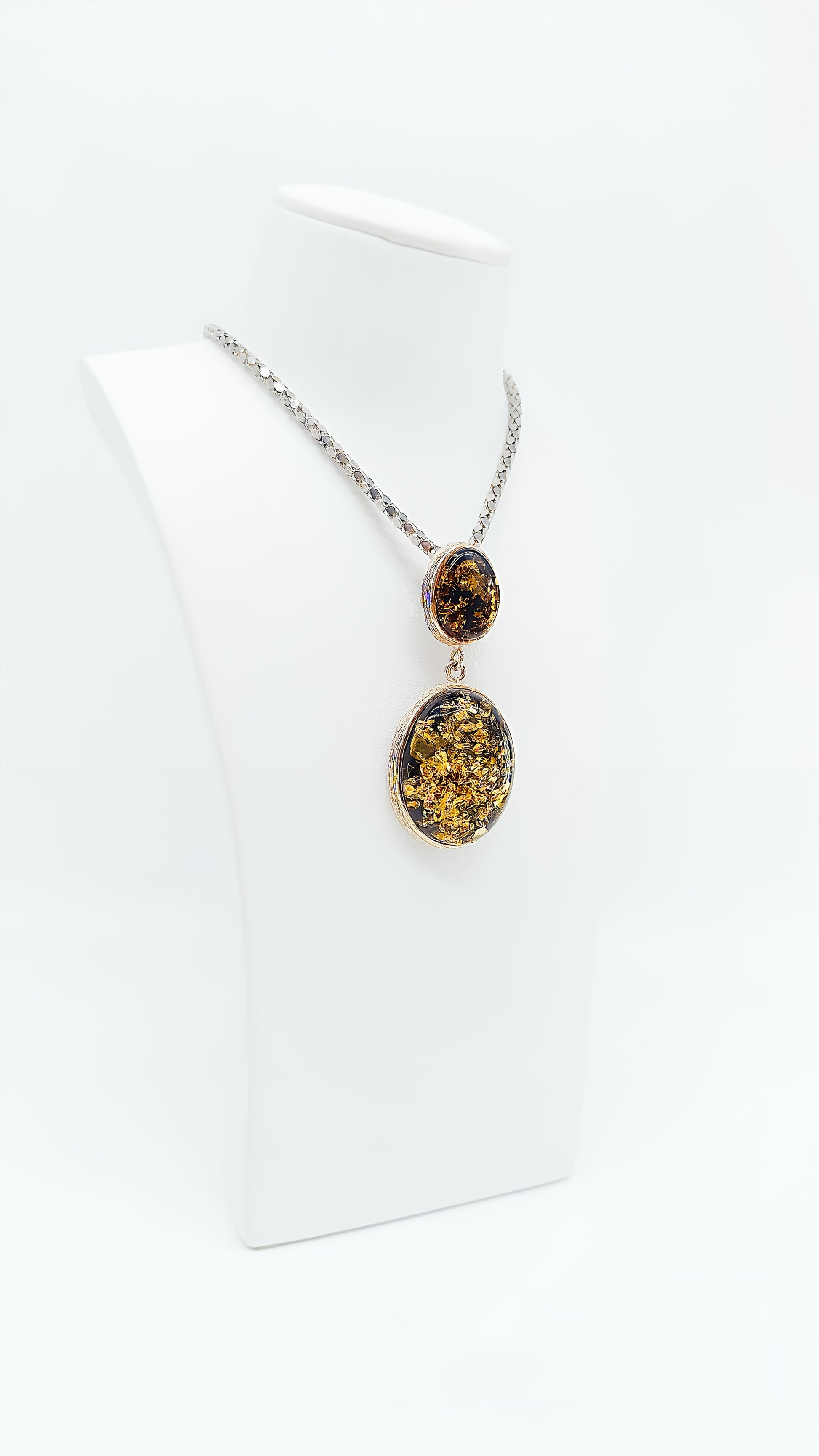 This unique double-row amber pendant crafted from 925 sterling silver is sure to catch the eye. Two sparkling amber stones of varying sizes combine to create a stunning design that perfectly showcases the natural beauty of the amber. The golden-brown tones of the amber radiate a warmth that is further enhanced by the delicate silver setting. An ideal piece of jewelry for women who value luxury and nature equally. Perfect as a gift for a special occasion or to enhance your own outfit.