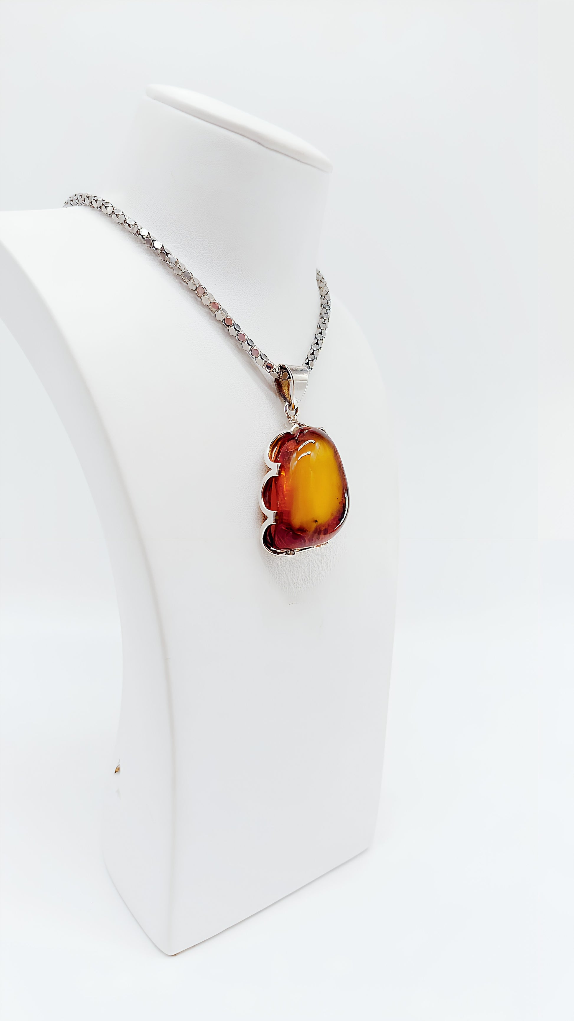 This extraordinary amber pendant crafted from 925 sterling silver combines the natural beauty of amber with a handcrafted silver setting. The honey-colored amber shimmers in warm tones and is a true eye-catcher thanks to its organic shape and artistic setting. This unique piece is ideal for women who appreciate individual and stylish jewelry. Perfect as a gift or as a unique everyday accessory.
