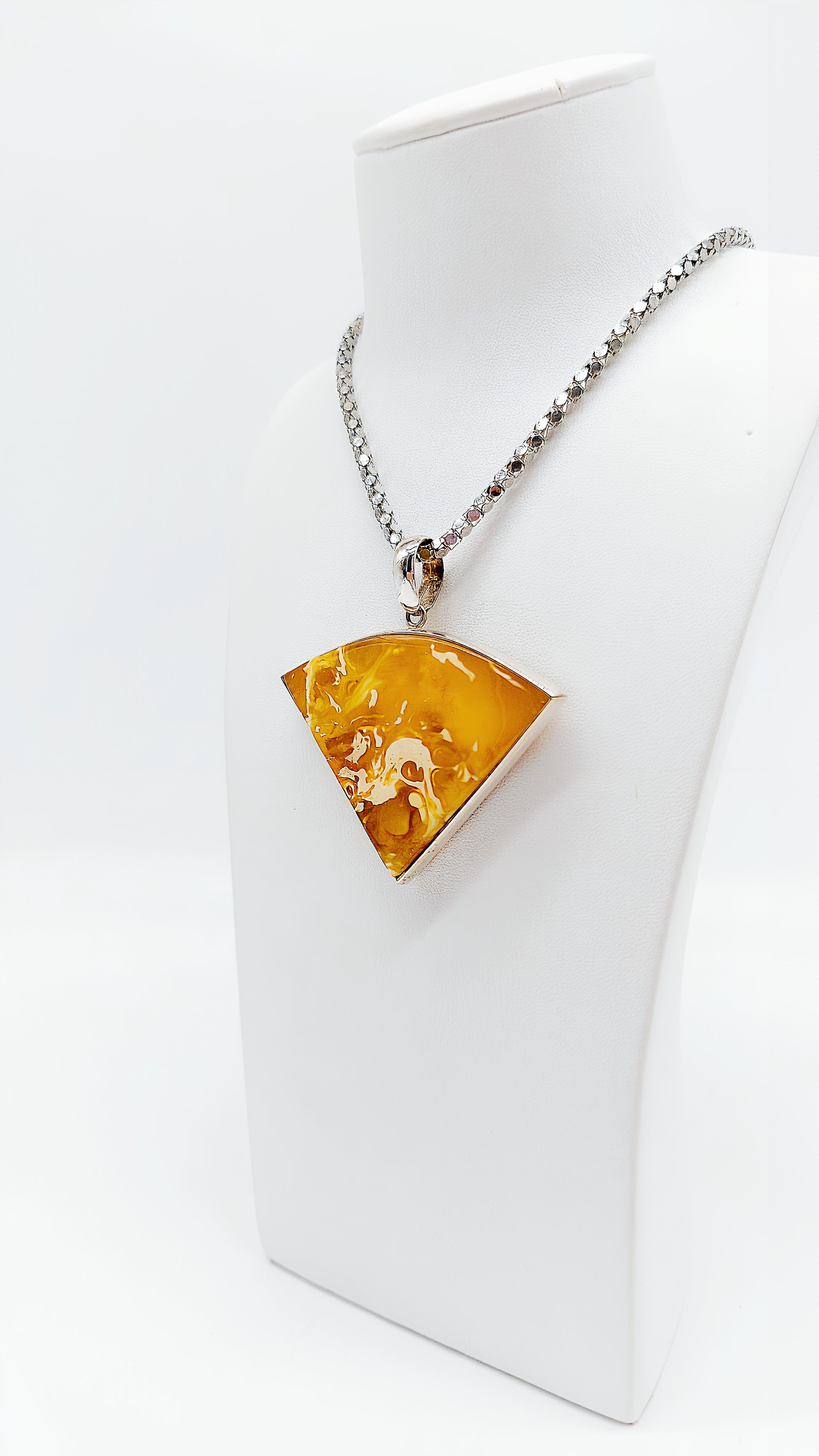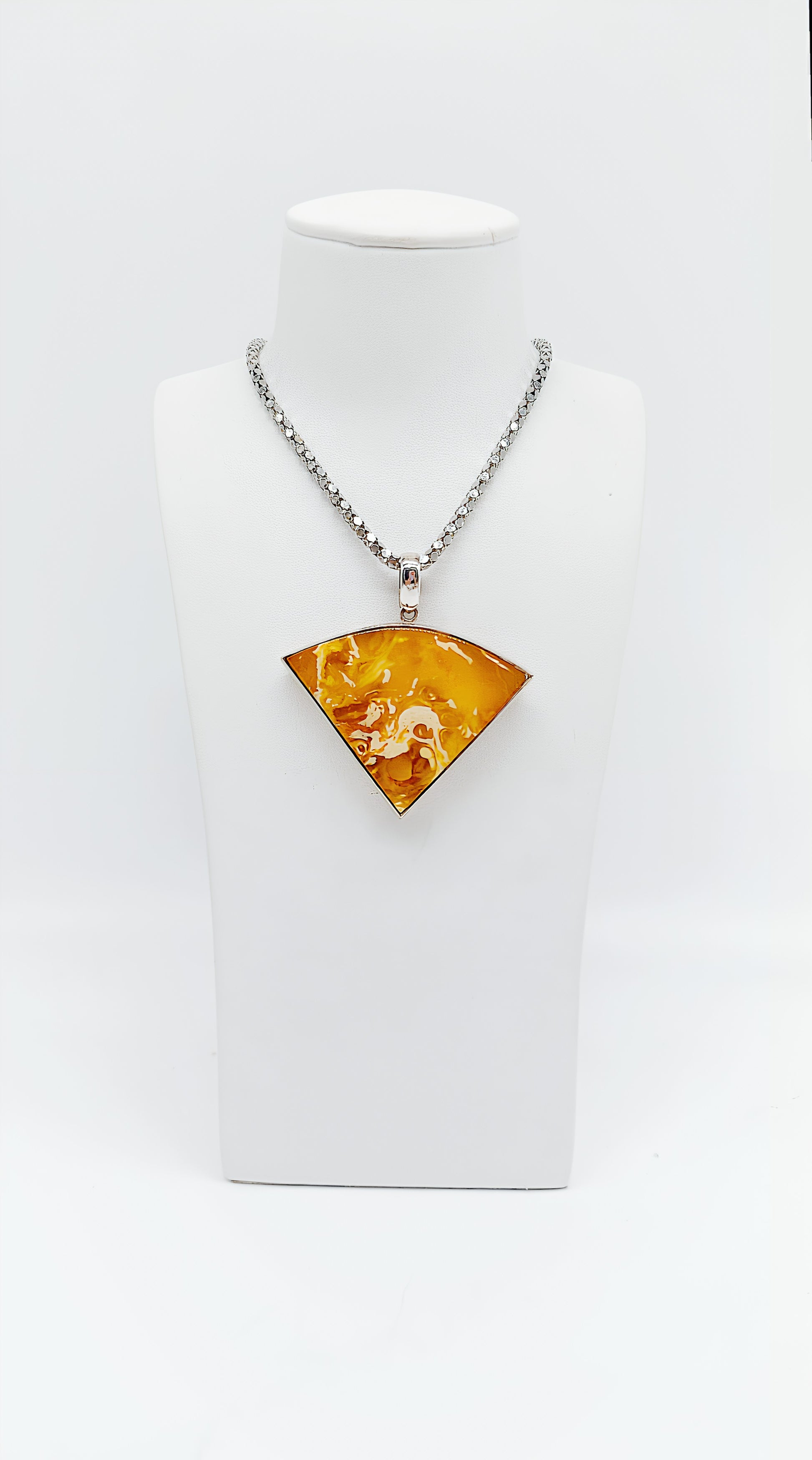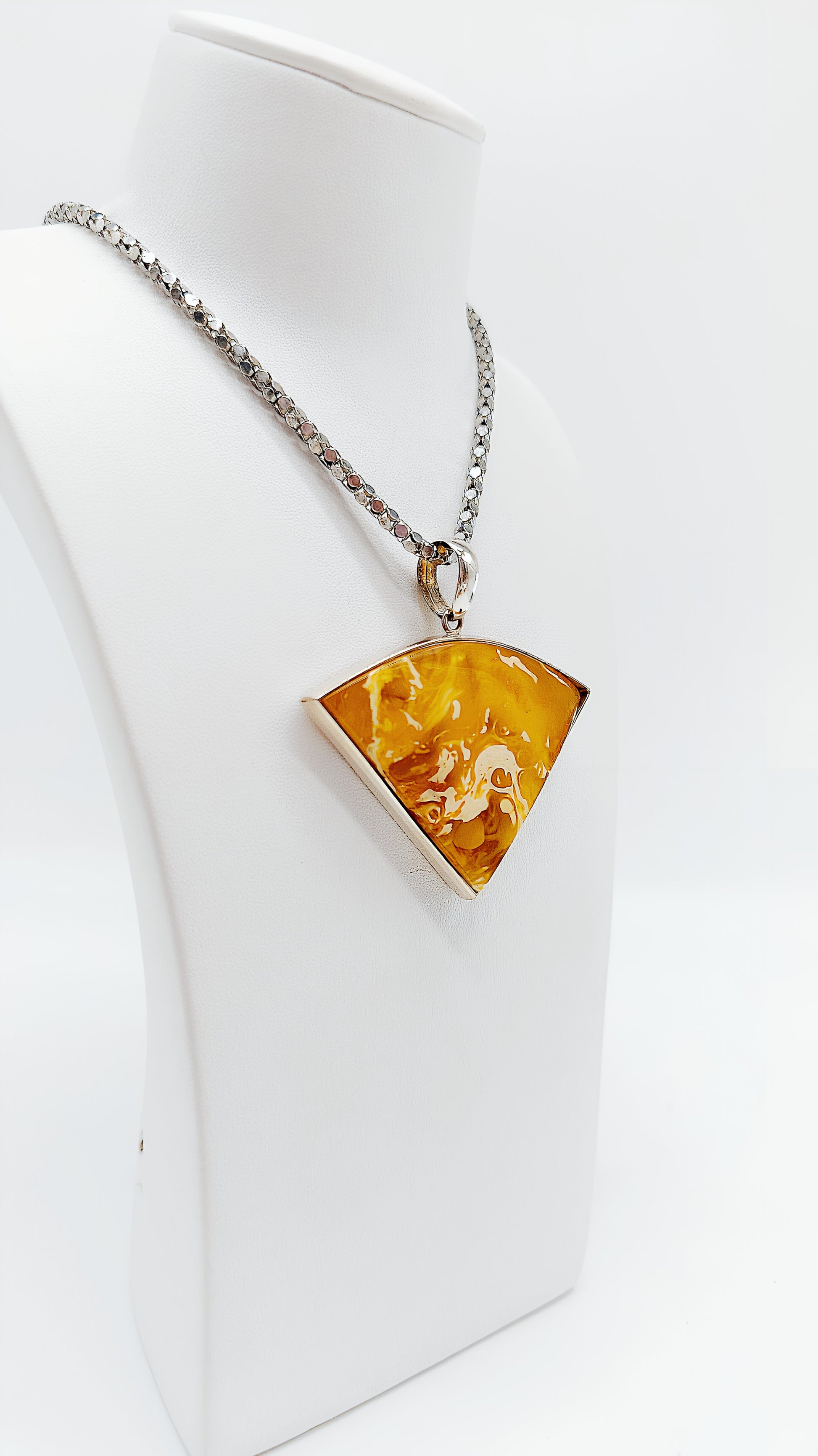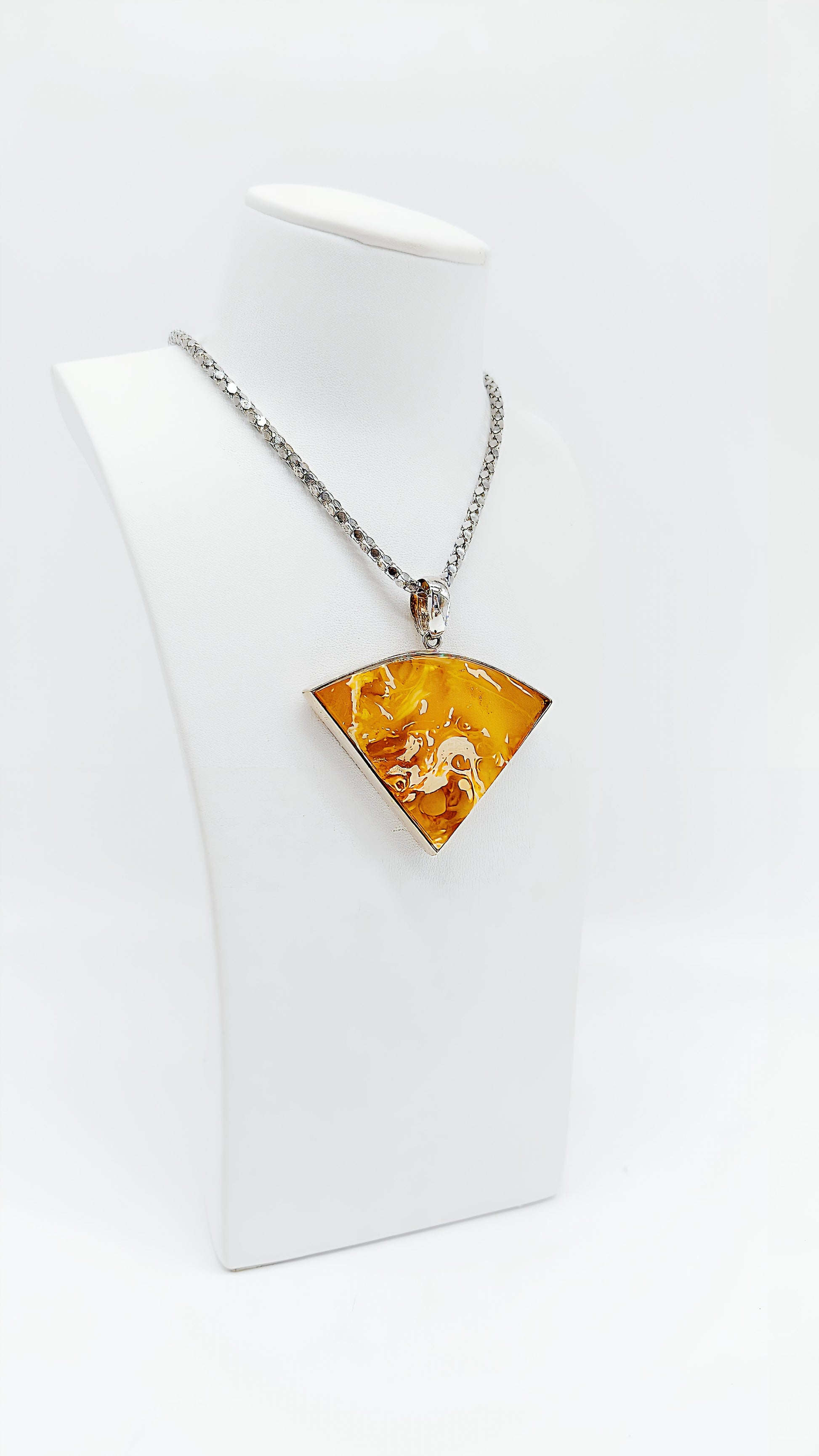 This extraordinary fan-shaped pendant made of 925 sterling silver is truly unique, captivating not only with its distinctive shape but also with the radiant golden amber. The flowing amber lends the piece a warm, organic radiance and contrasts with the gleaming silver frame. A true statement piece for all those who love striking and unique designs. The pendant is the perfect choice for fashion-conscious women who want to emphasize their individuality and makes an excellent gift for special occasions such as birthdays, anniversaries, or Christmas.