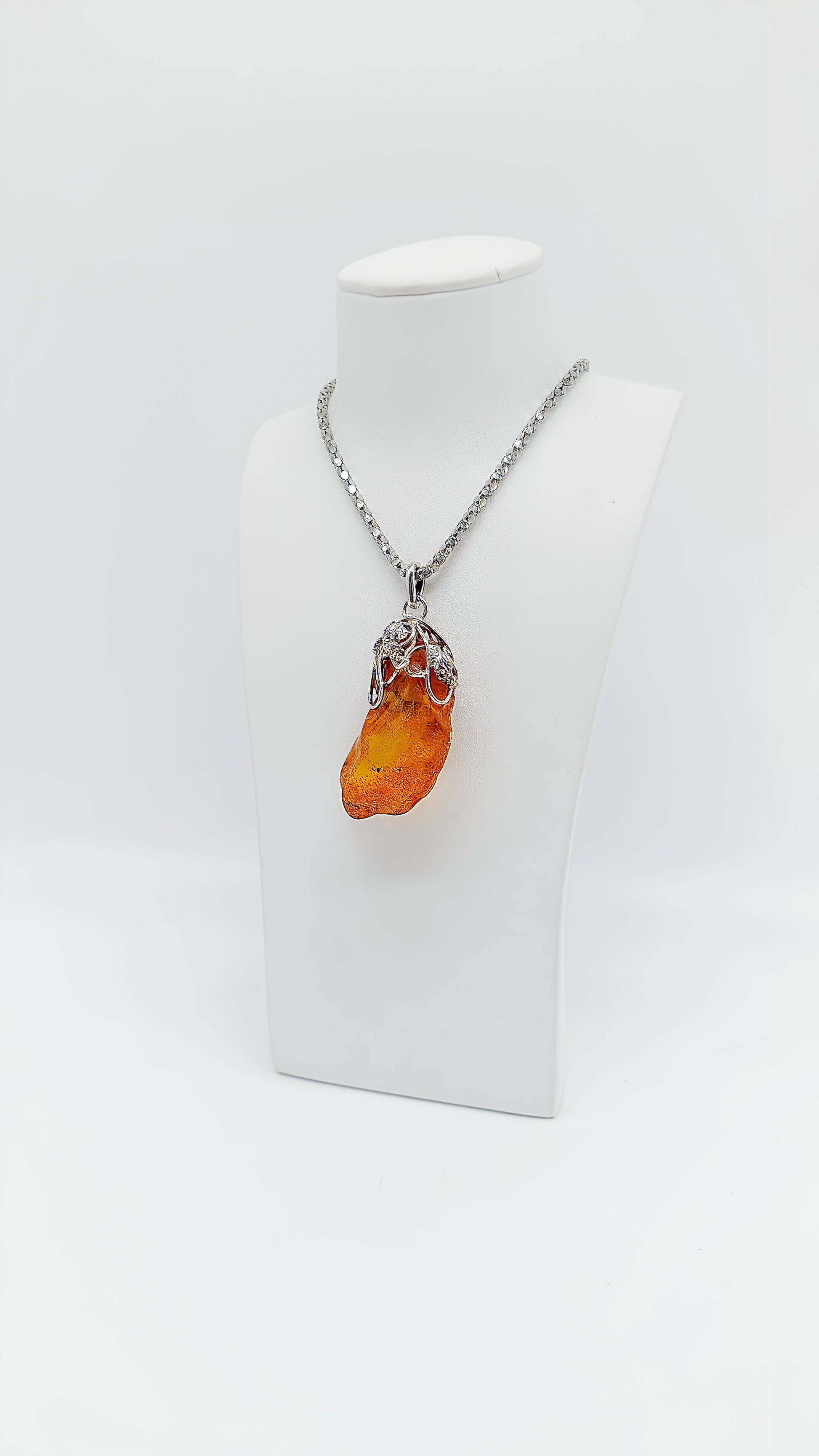 This unique pendant combines the raw beauty of natural amber with the delicate elegance of 925 sterling silver. The unpolished amber shape highlights the stone's natural character, while the artistic silver detail transforms the pendant into a true work of art. This piece of jewelry is perfect for nature lovers and anyone with a penchant for unique pieces. It's the ideal gift for special people who appreciate the authentic charm of nature—be it for a birthday, Christmas, or as a personal treasure.