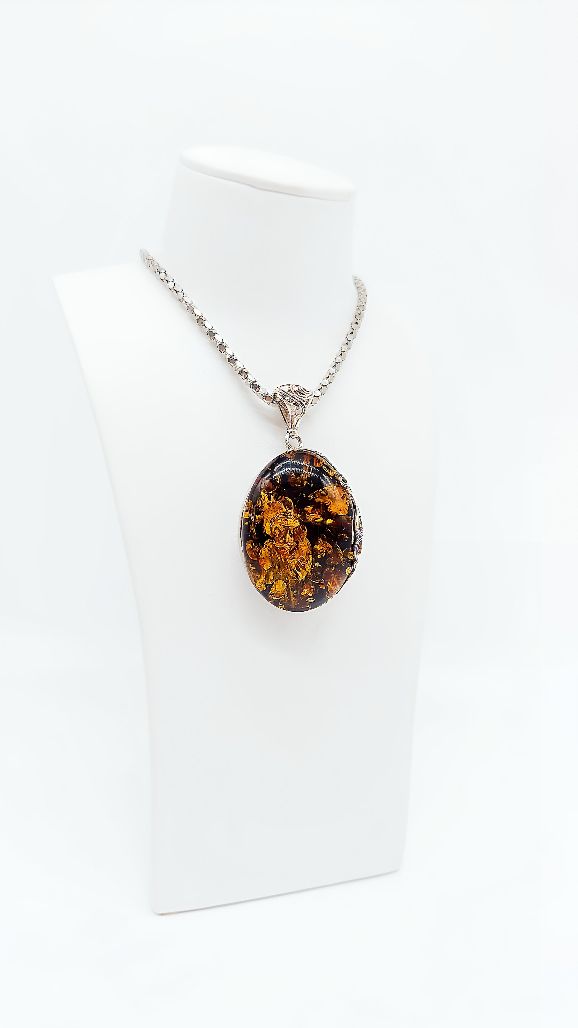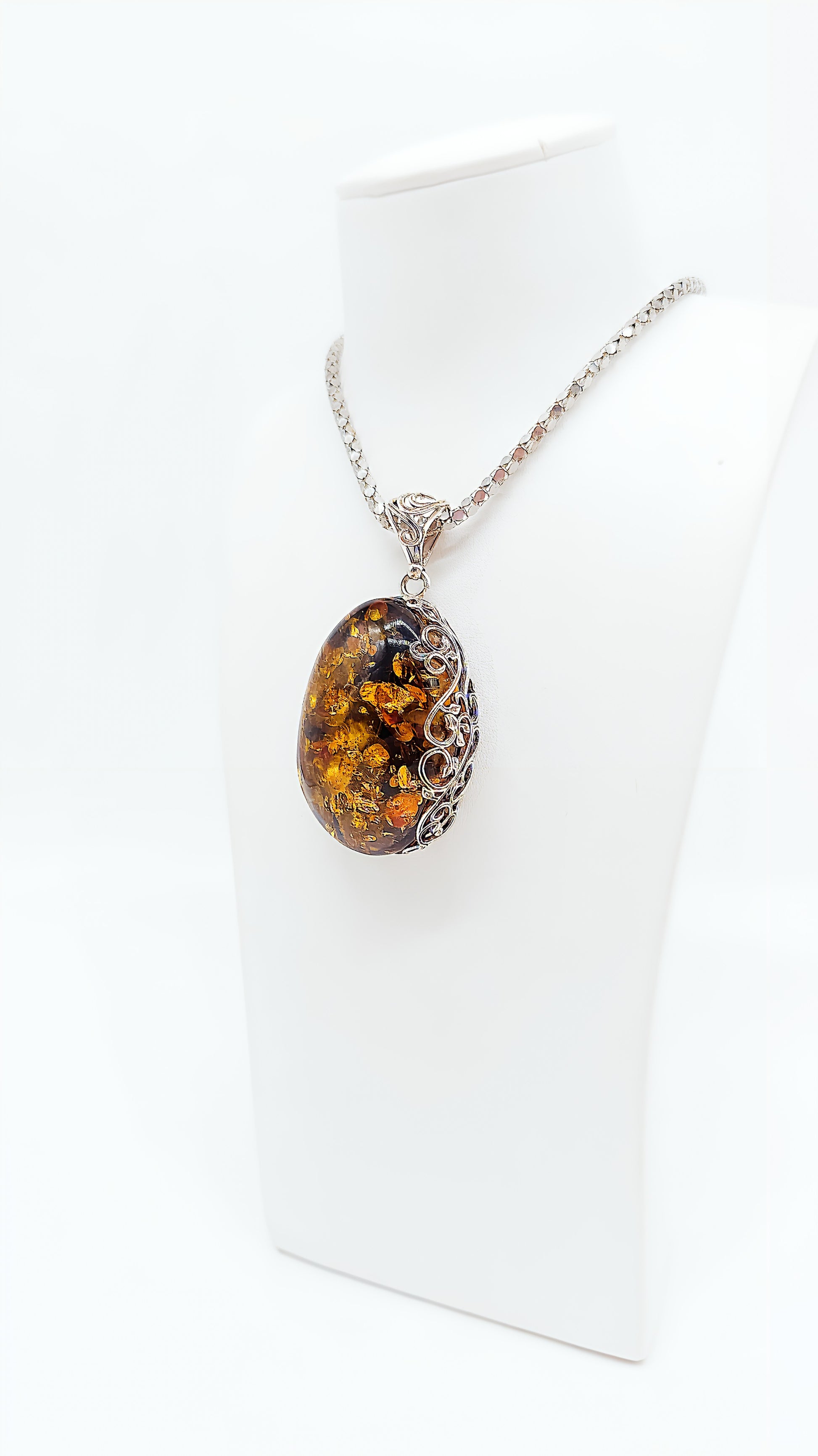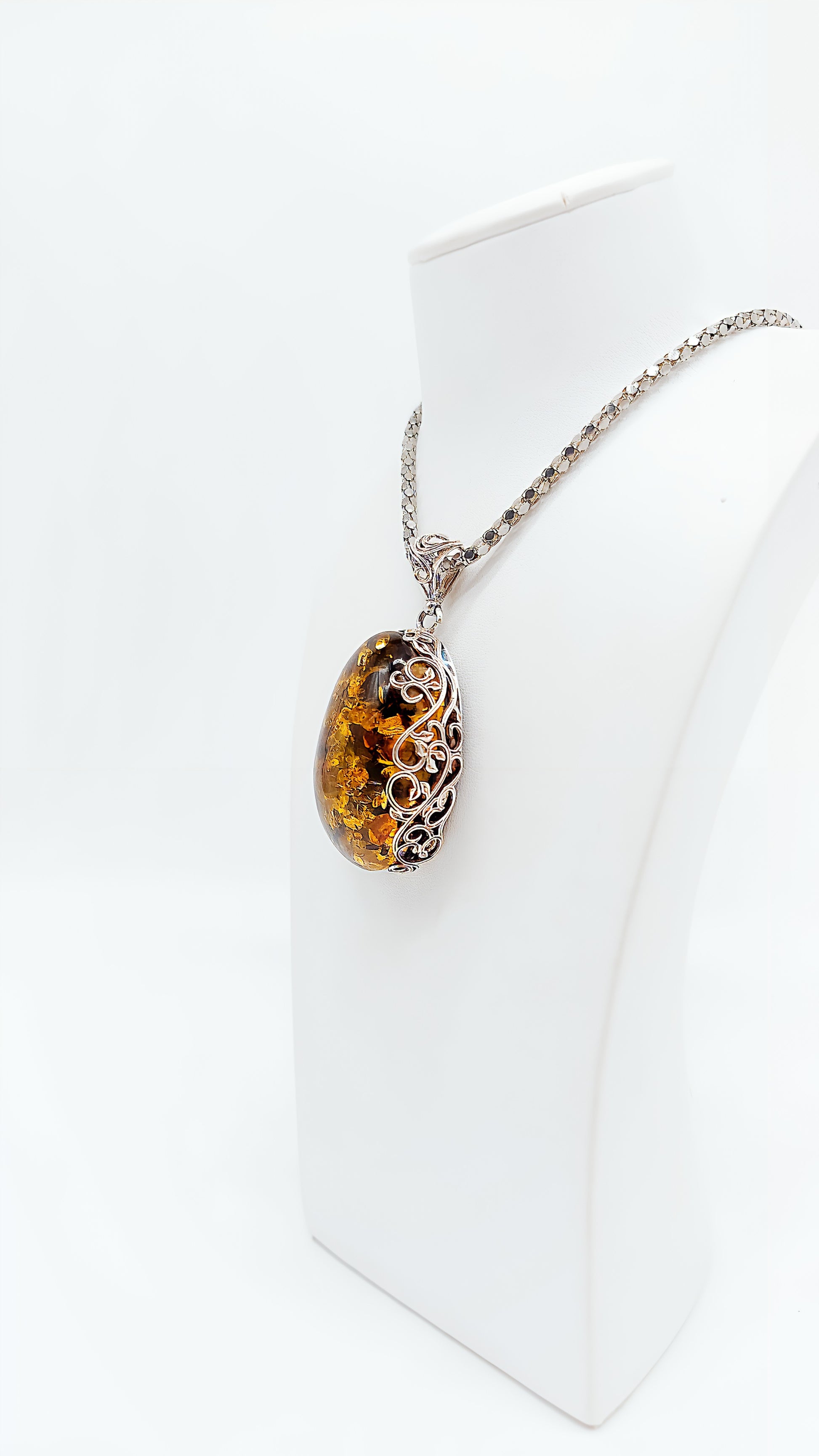 This round amber pendant captivates with its deep golden-green reflections and high-quality 925 silver setting . The natural amber displays impressive inclusions that make it truly unique . Its rounded shape makes it comfortable to wear and adds a sophisticated and mystical touch to any outfit. Perfect for women who love exclusive natural jewelry—whether as a gift for special occasions or as a stylish addition to their own jewelry collection.