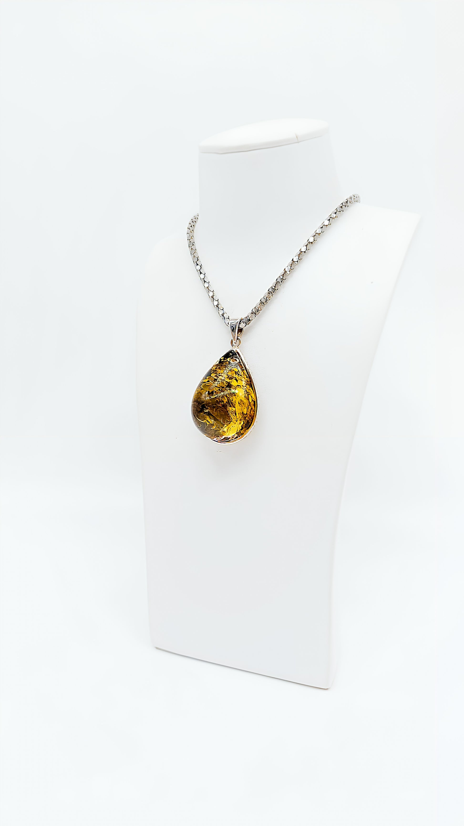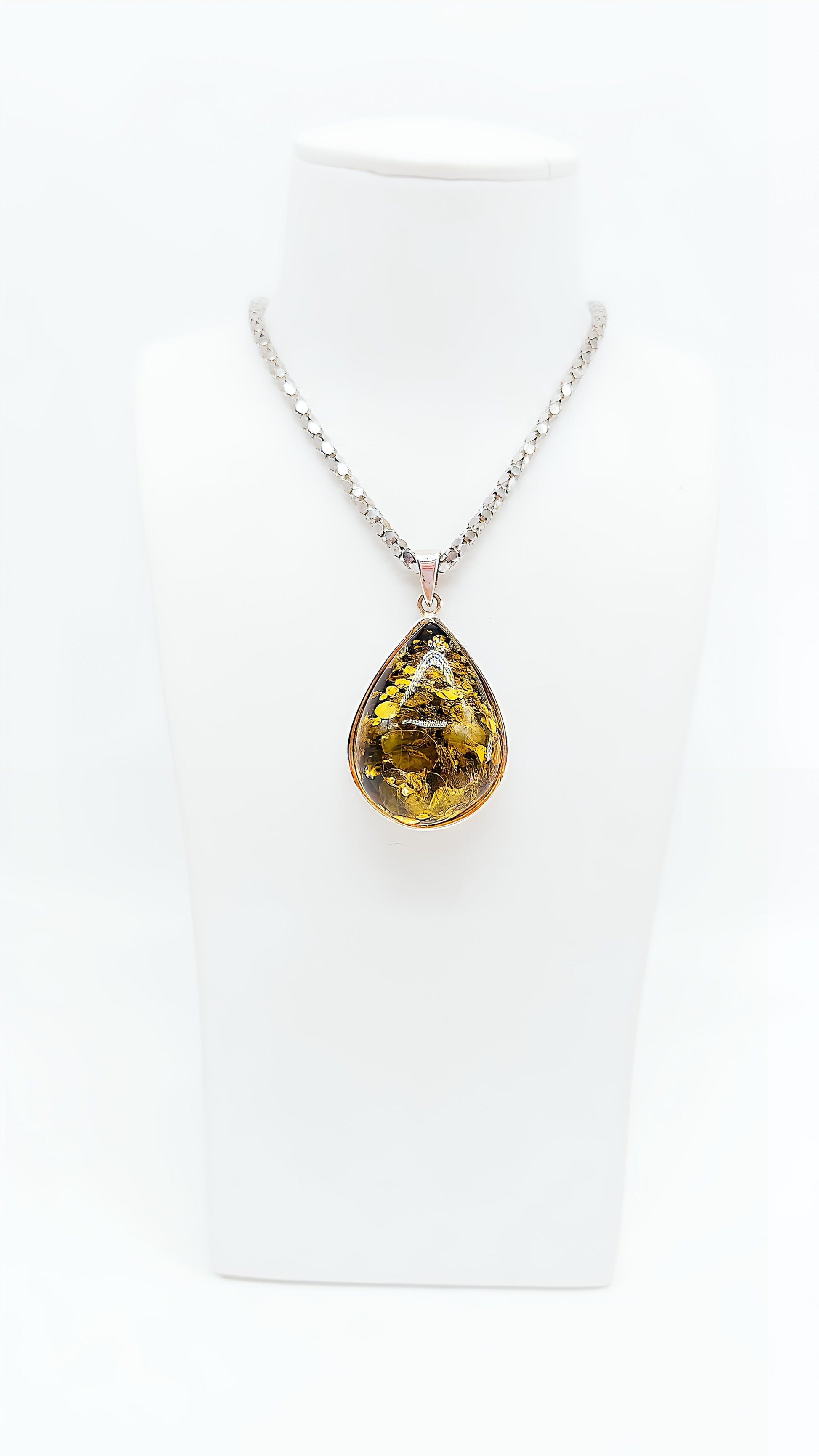 - Design: Drop-shaped pendant with silver setting