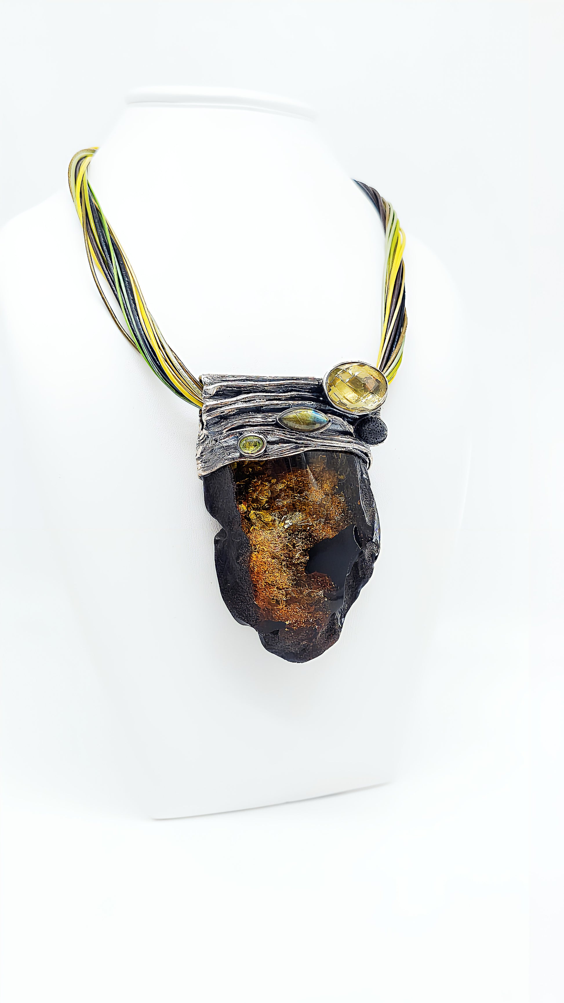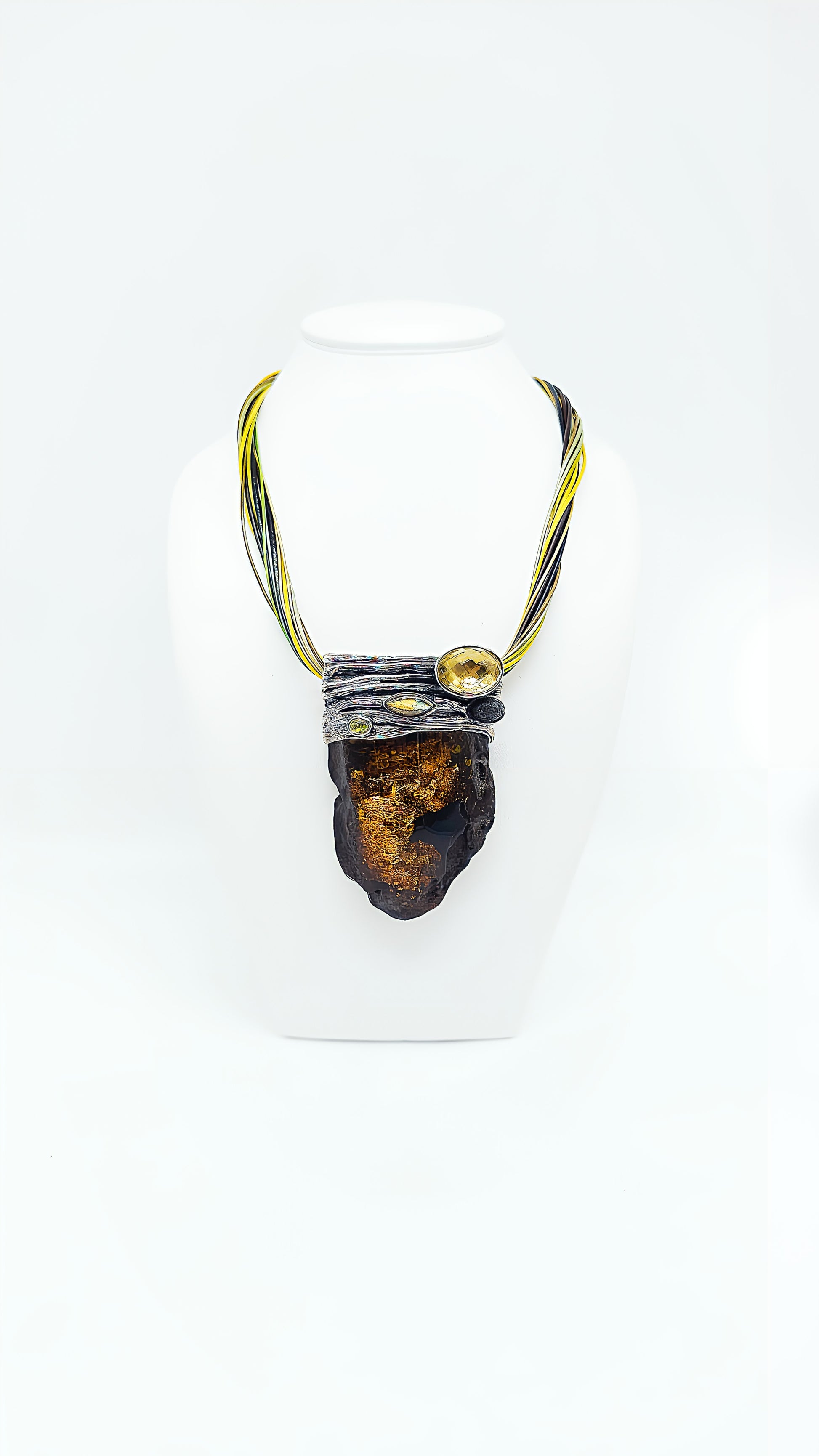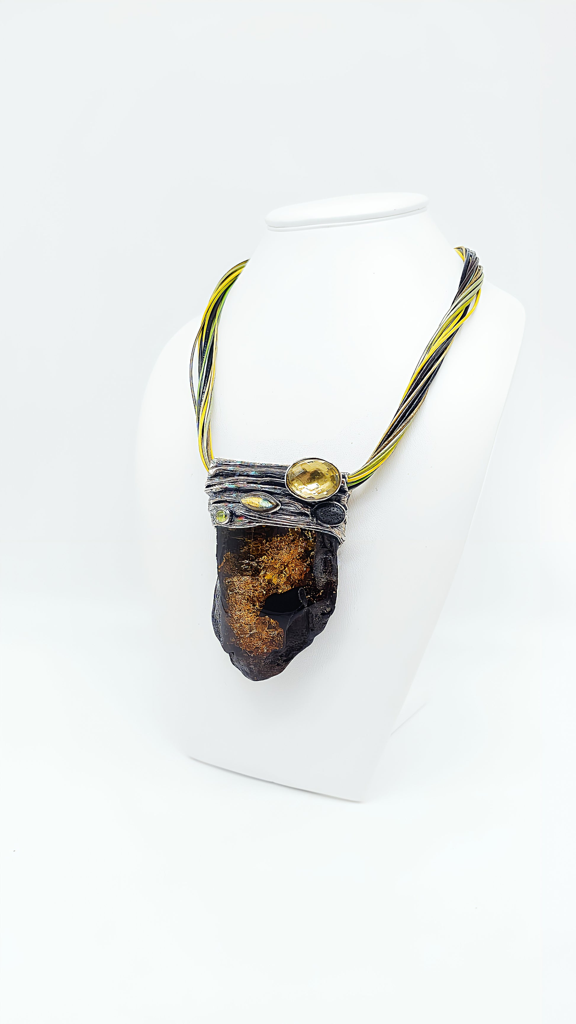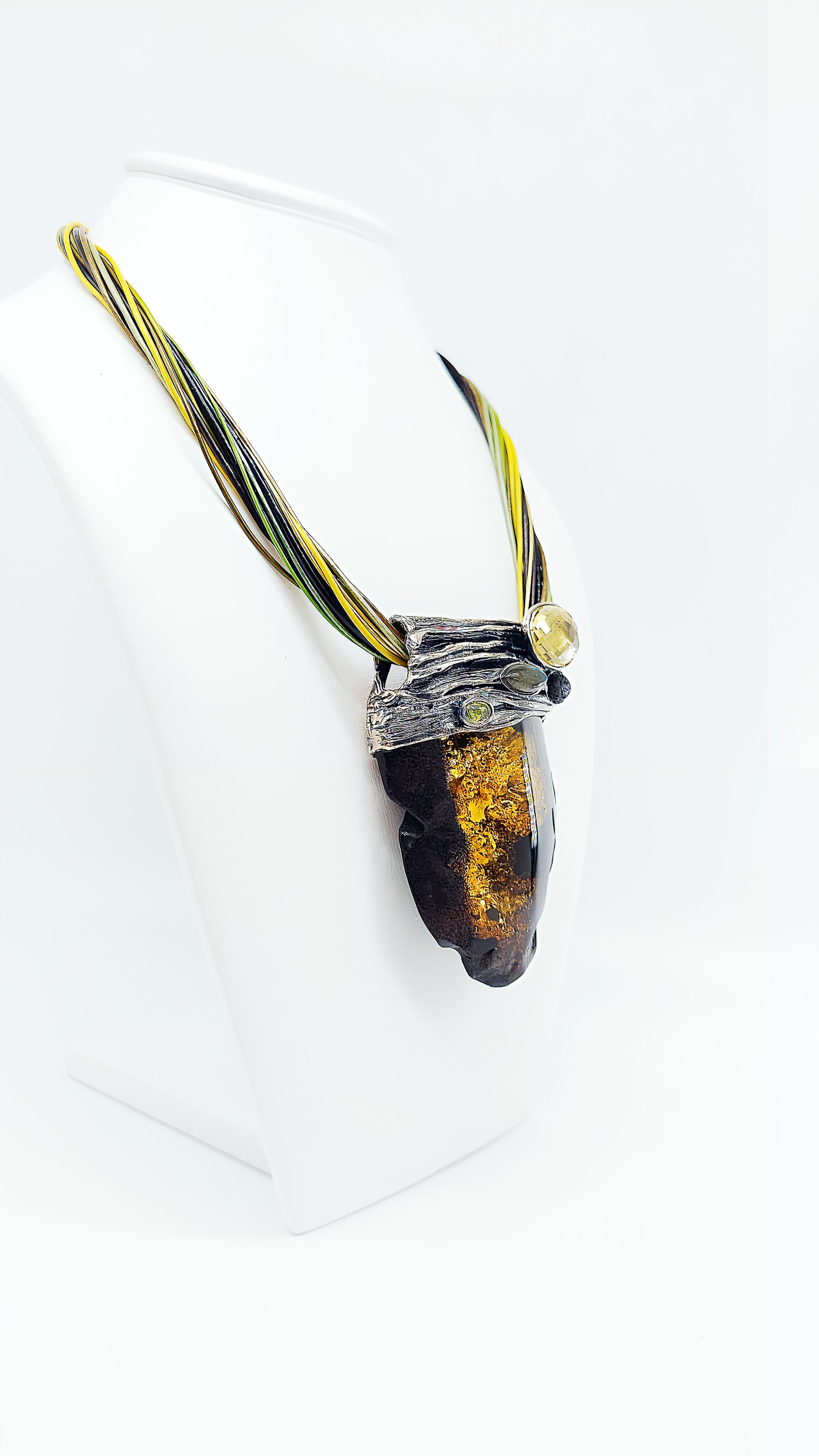 This unique statement necklace combines genuine natural amber with an intricately crafted 925 Sterling silver setting, complemented by shimmering citrine and green gemstones . The raw, unpolished amber captivates with its deep golden brown and mysterious inclusions , while the multi-strand necklace in shades of green and yellow underscores the natural look. A truly unique piece that will delight women with a sense of exceptional jewelry. Perfect as a gift for lovers of art, nature, and exclusive design .