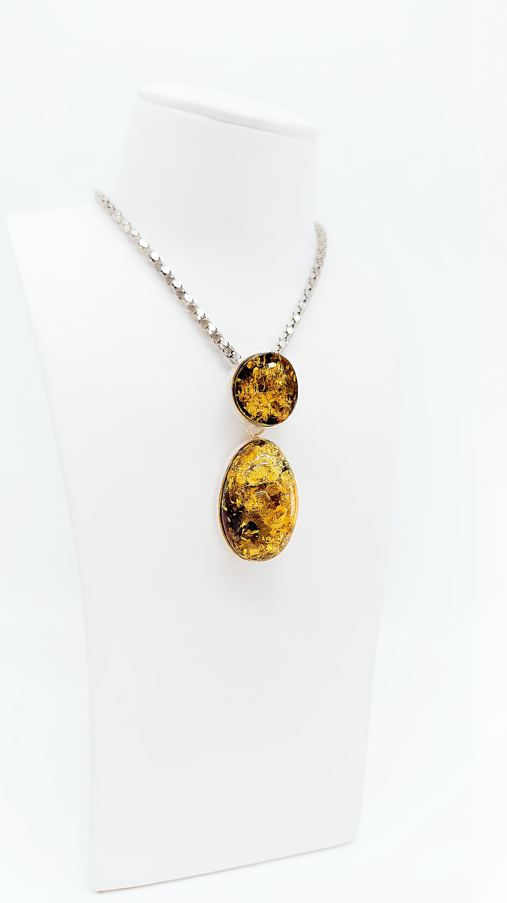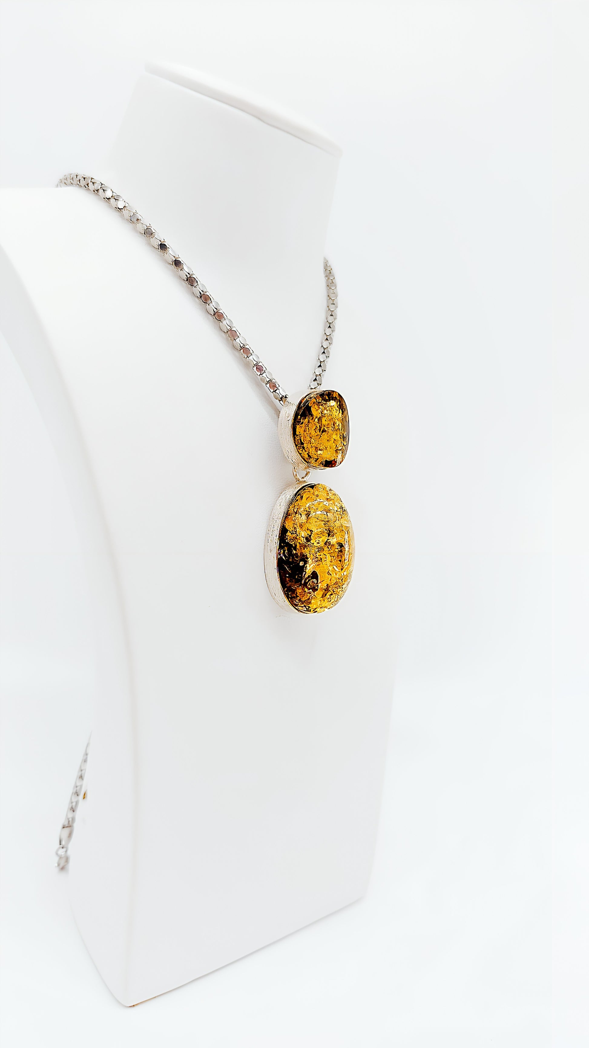 This unique pendant combines the natural beauty of amber with the timeless elegance of 925 sterling silver. The two amber elements, one round and one oval, give this piece of jewelry a special depth and radiate in warm golden tones. The pendant is perfect for women who appreciate natural elegance and individuality. The handcrafted nature of each piece makes it truly unique. Whether for a special occasion or as a precious gift for a loved one, this pendant is guaranteed to be an eye-catcher.