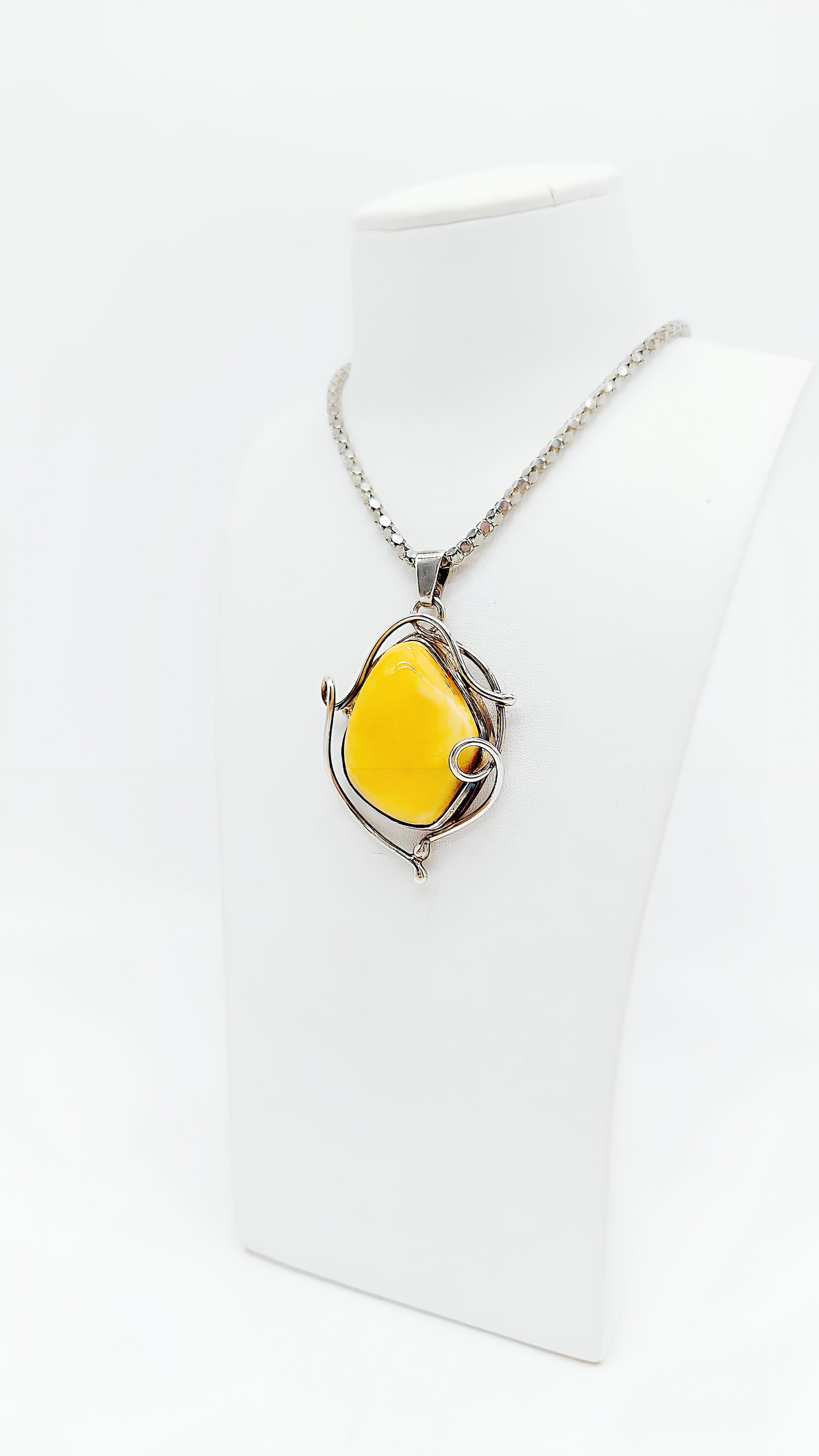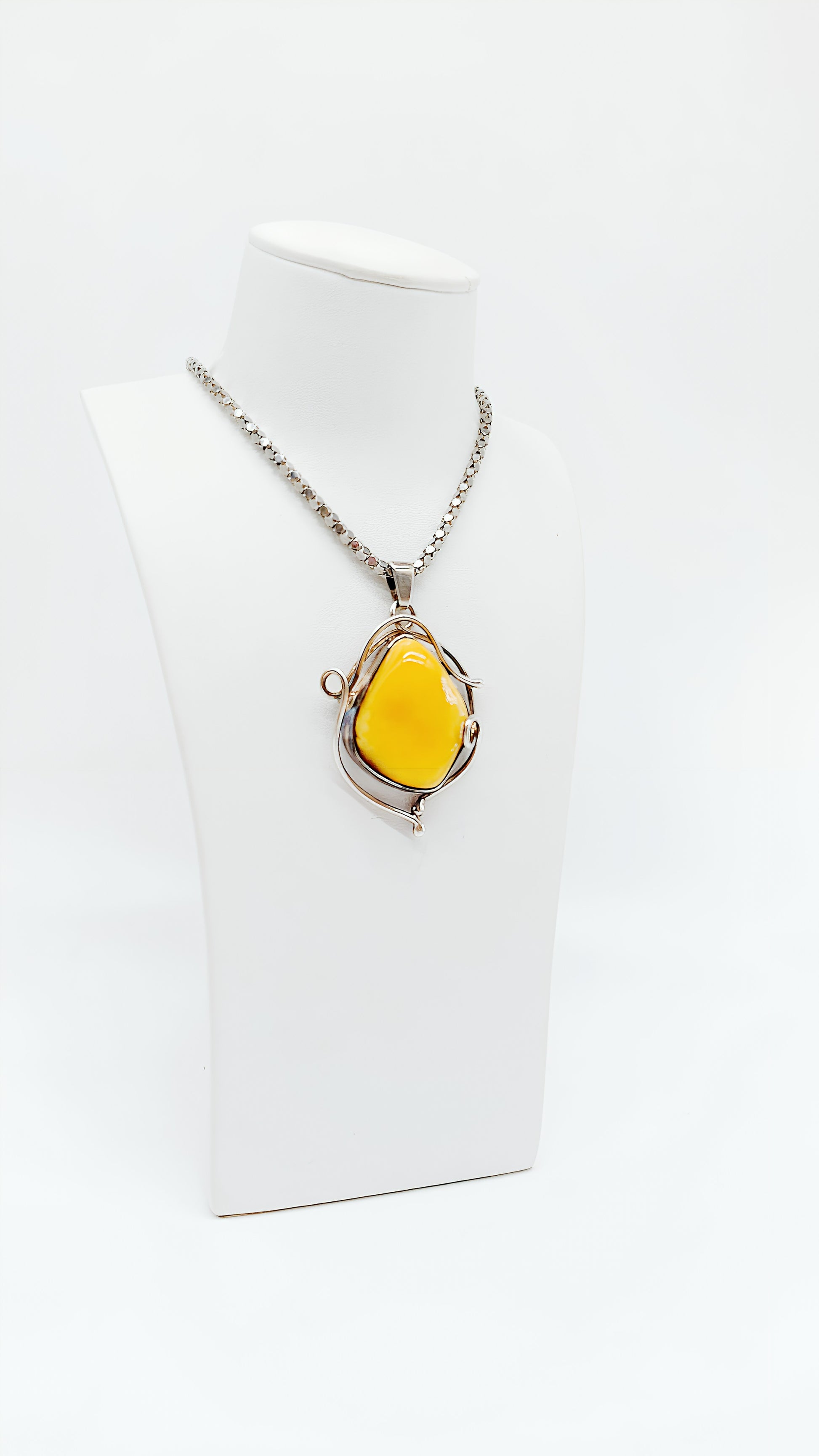 This exceptional amber pendant combines nature and elegance in an artistic design. The warm yellow natural amber , set in 925 sterling silver , captivates with its unusual shape and unique silver decoration. Each piece is handcrafted and unique, with its distinctive grain. Perfect for women who love stylish, high-quality jewelry. Whether as a gift for special occasions such as birthdays or anniversaries, or as a luxurious addition to your own jewelry collection, this piece adds that certain something to any look.