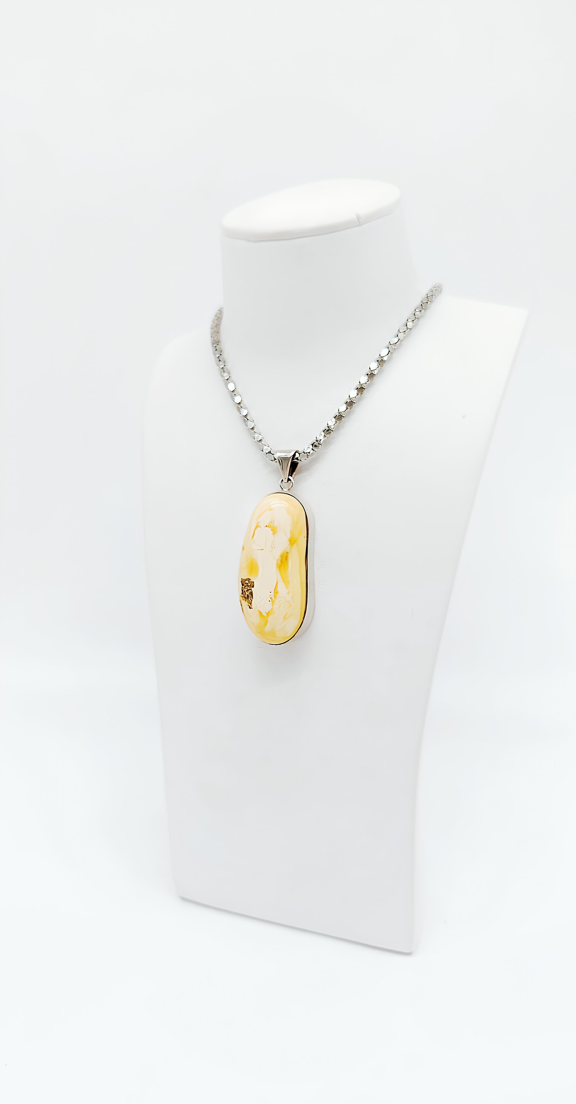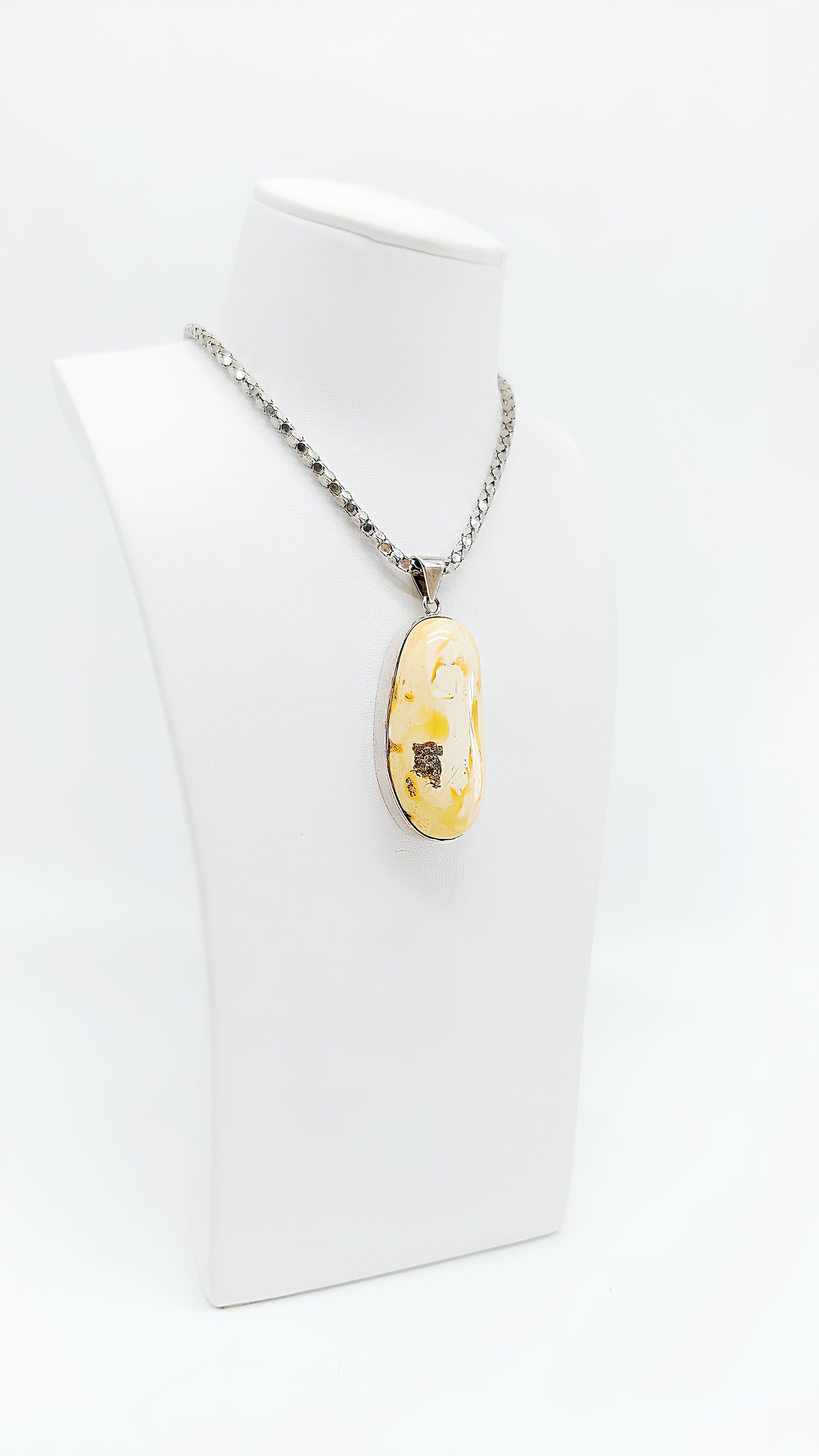 This elegant amber pendant combines natural beauty with timeless elegance. The elongated, handcrafted natural amber captivates with its soft yellow tones and unique natural inclusions, making it truly one of a kind . Set in high-quality 925 sterling silver , this pendant adds a stylish and luxurious touch to any look. Ideal for women who love special and unique jewelry. Perfect as a gift for birthdays, anniversaries, or other special occasions—a real eye-catcher for style-conscious women.