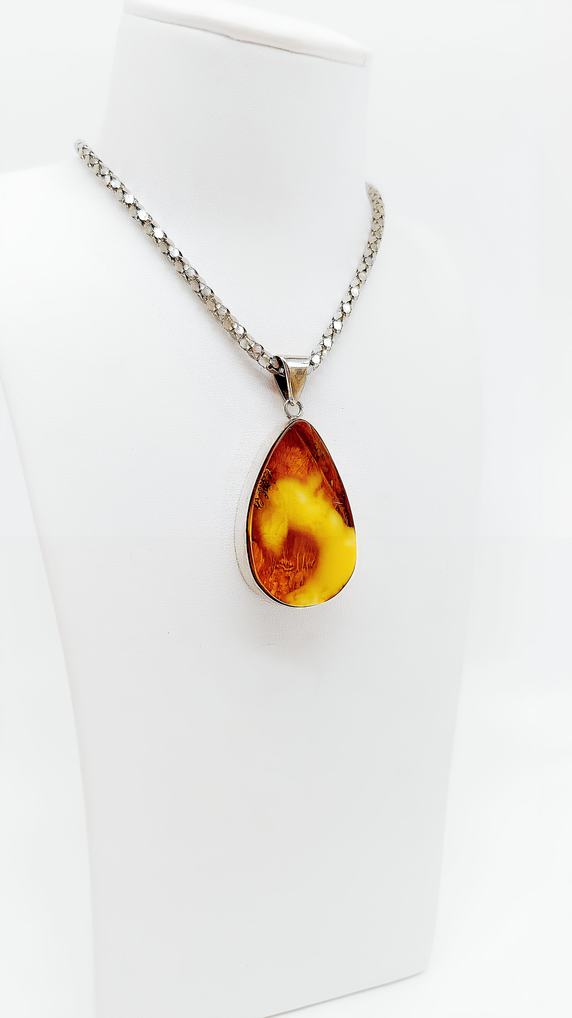 This beautiful, teardrop-shaped amber pendant is a unique piece made of genuine natural amber and set in 925 sterling silver . The stone impresses with its unique color gradient from honey yellow to cognac and its natural inclusion pattern.