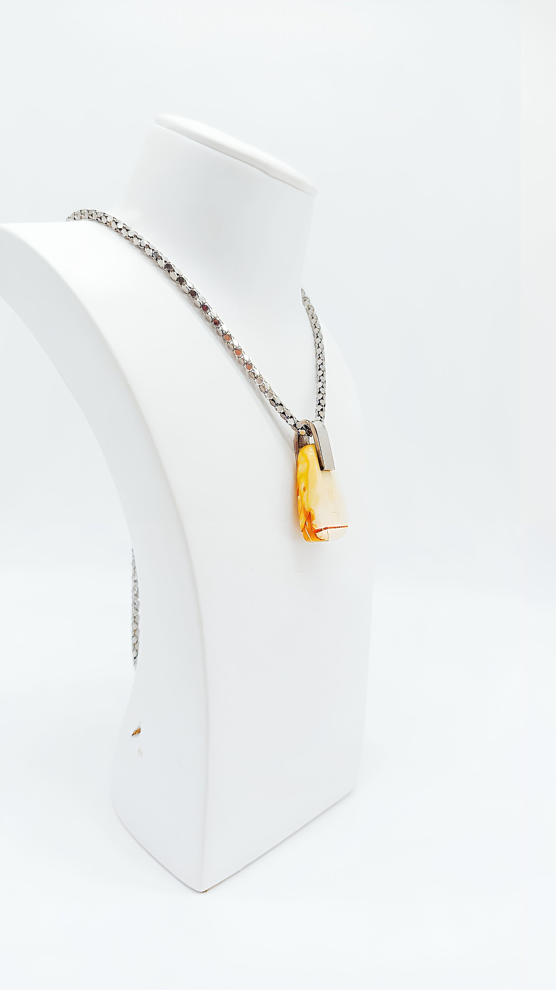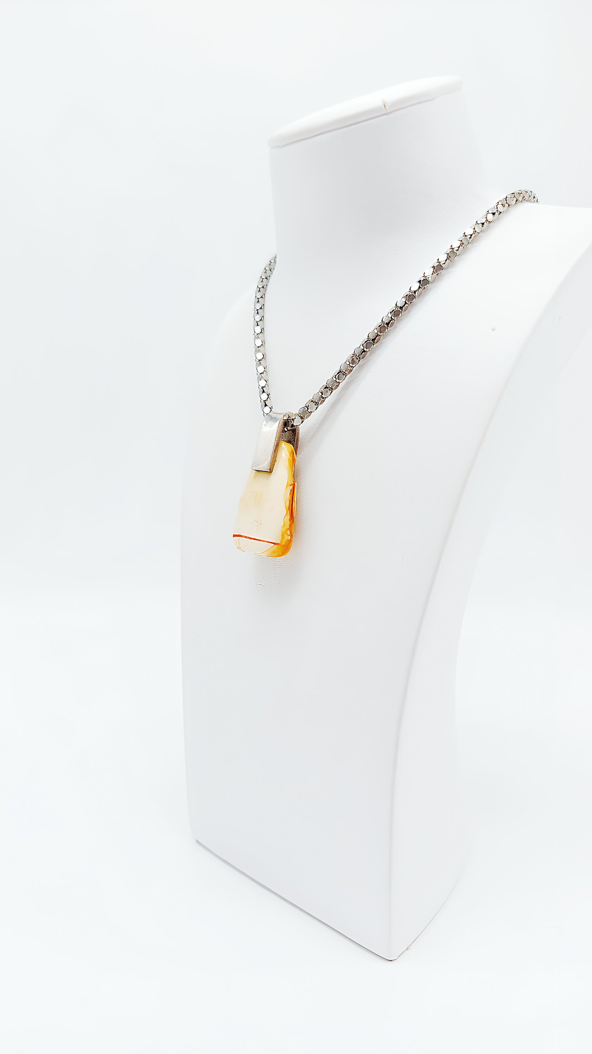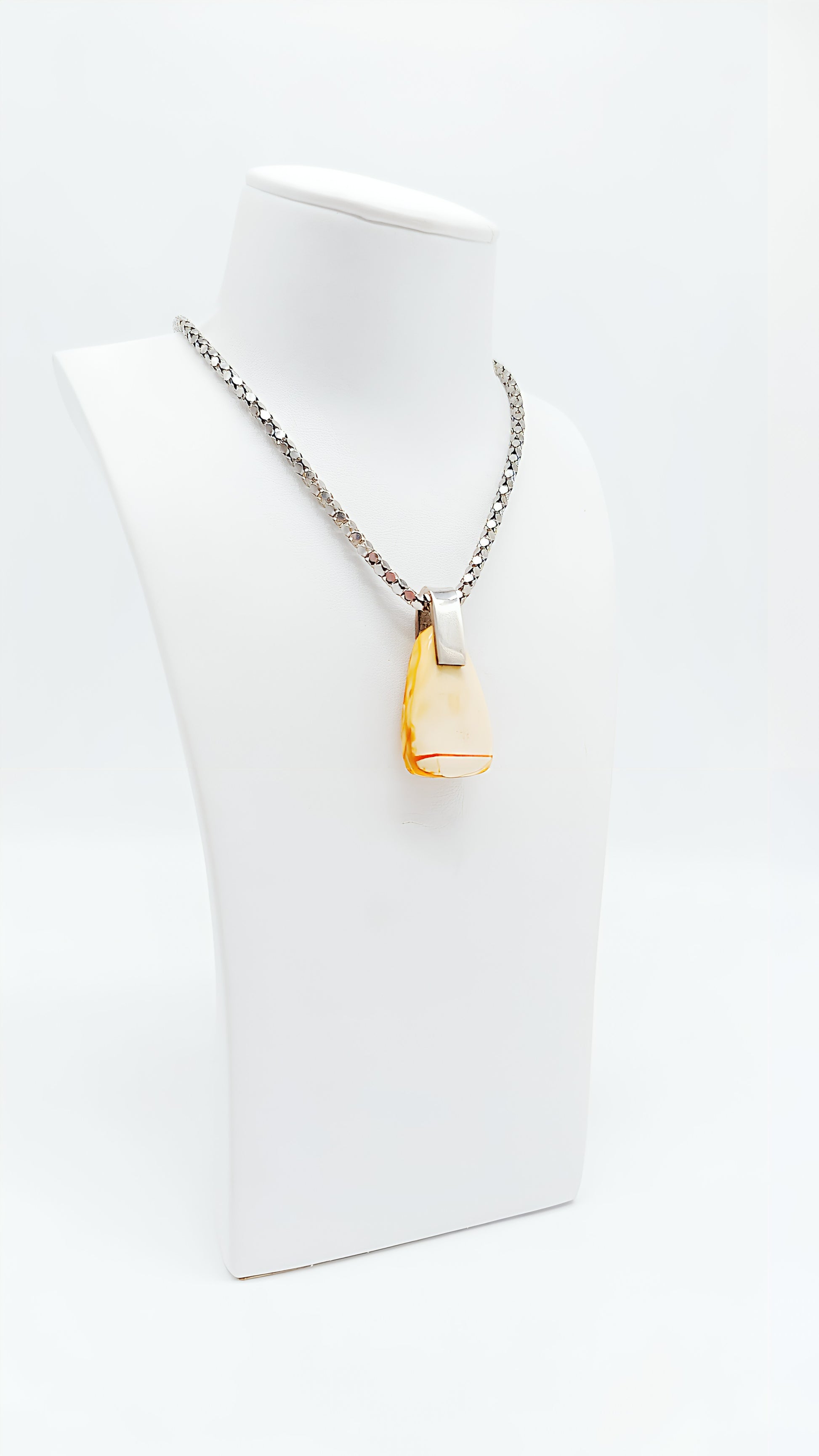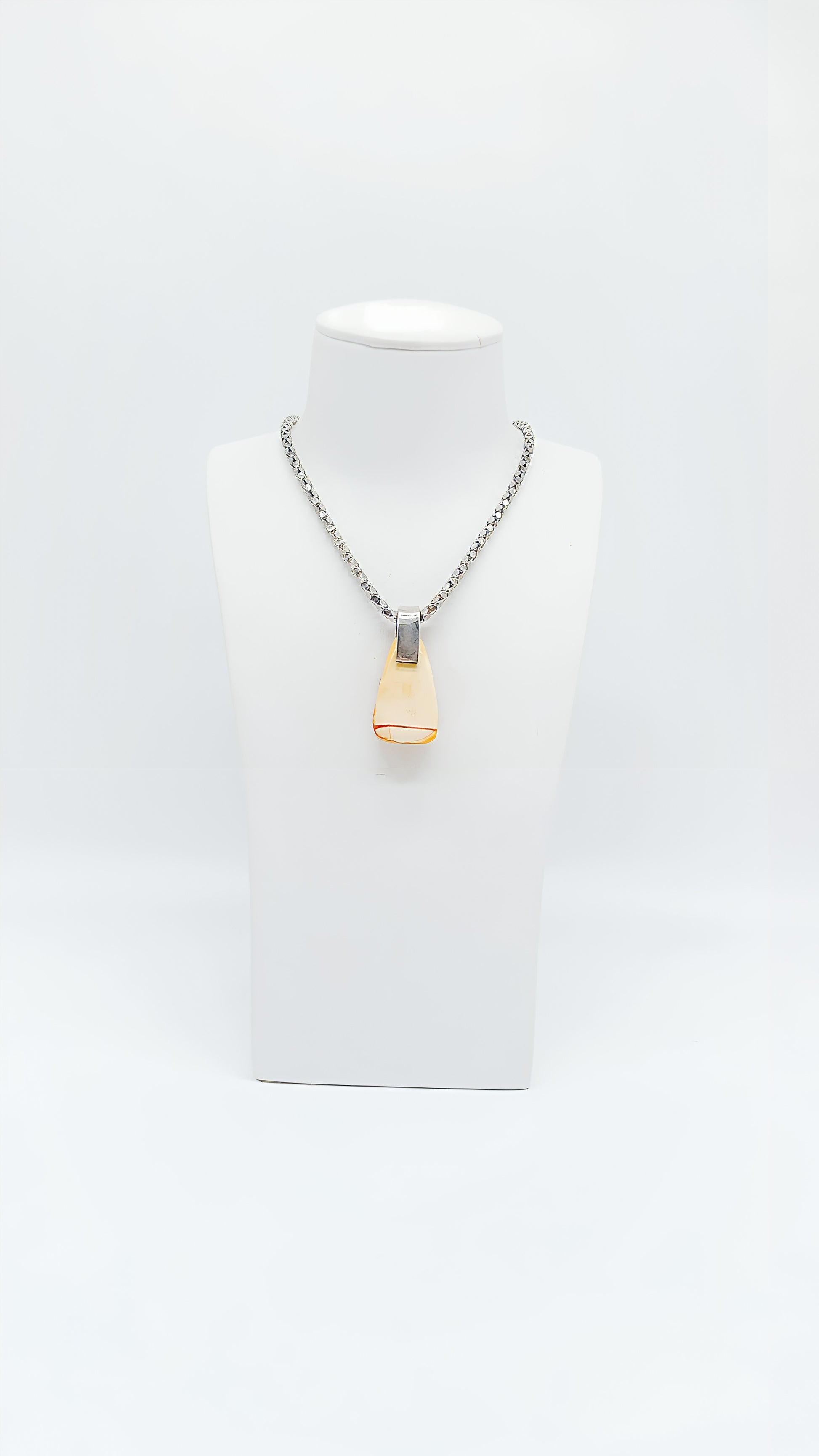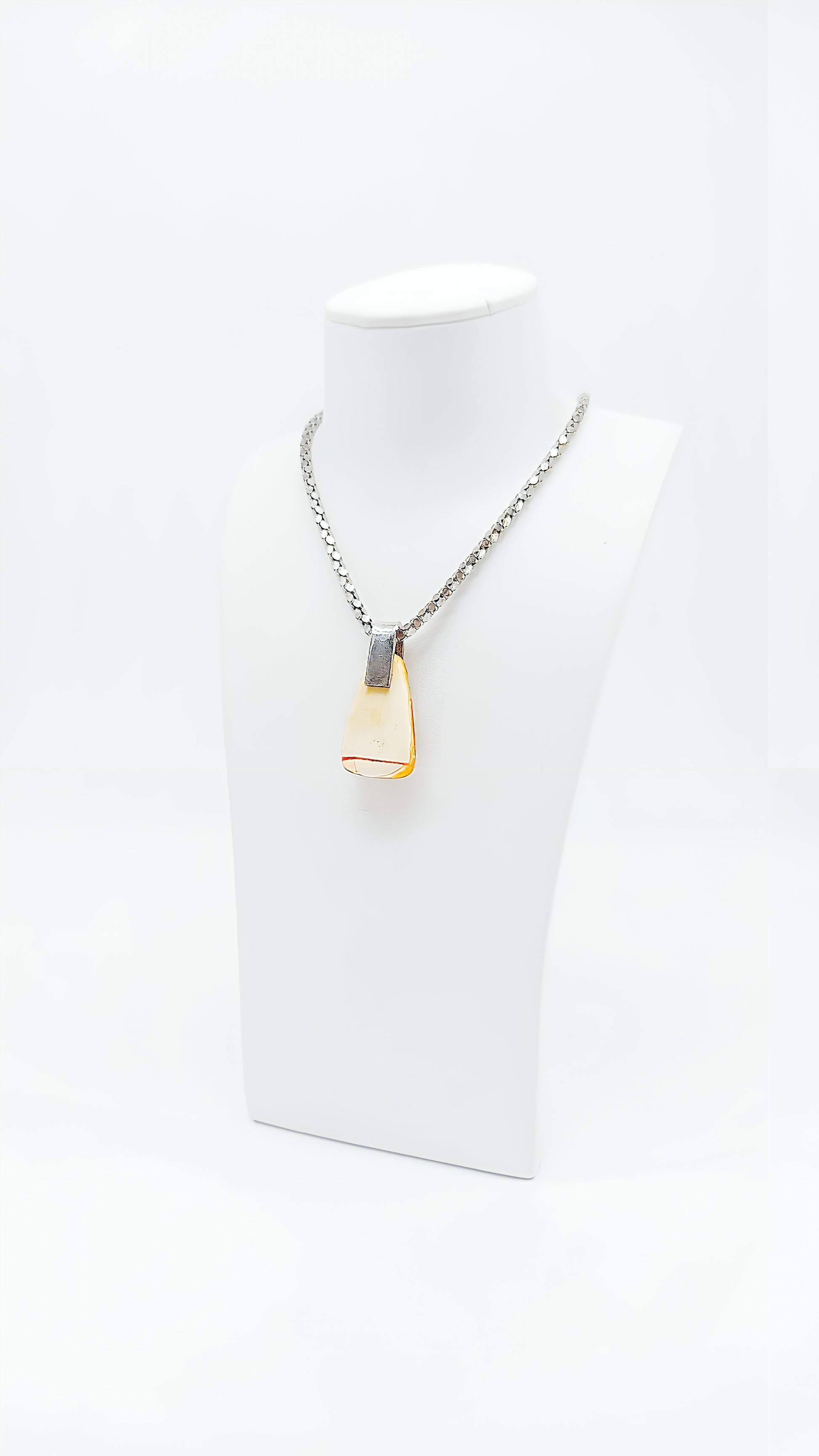 This minimalist pendant crafted from 925 sterling silver combines the natural warmth of amber with modern elegance. The clear-cut amber shimmers in soft golden tones, perfectly showcased by the cool silver setting. This piece is ideal for those who appreciate timeless elegance and understated beauty. Whether worn with a simple T-shirt or an elegant evening dress, this pendant complements any outfit. It also makes a wonderful gift, ideal for special occasions such as birthdays or anniversaries.